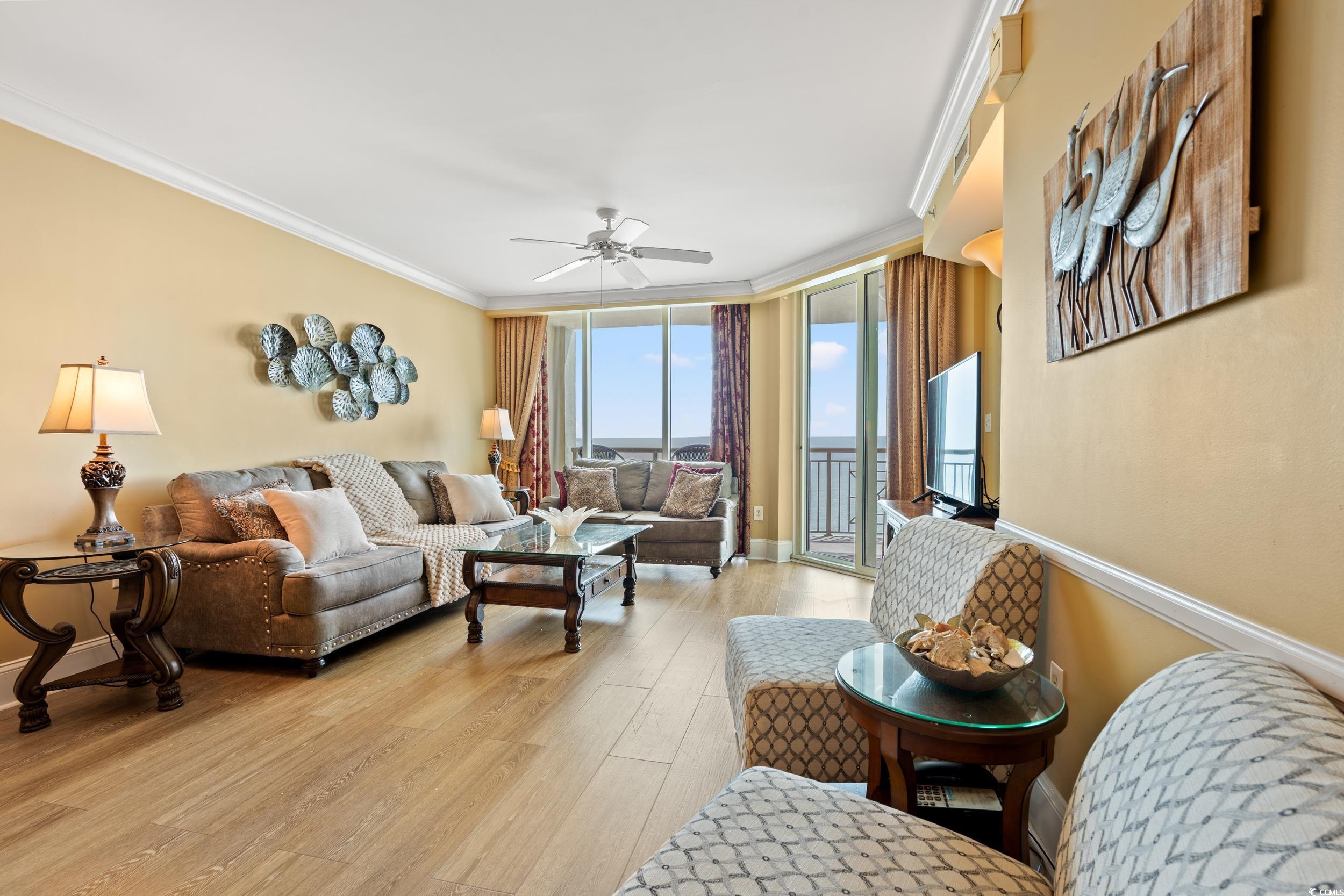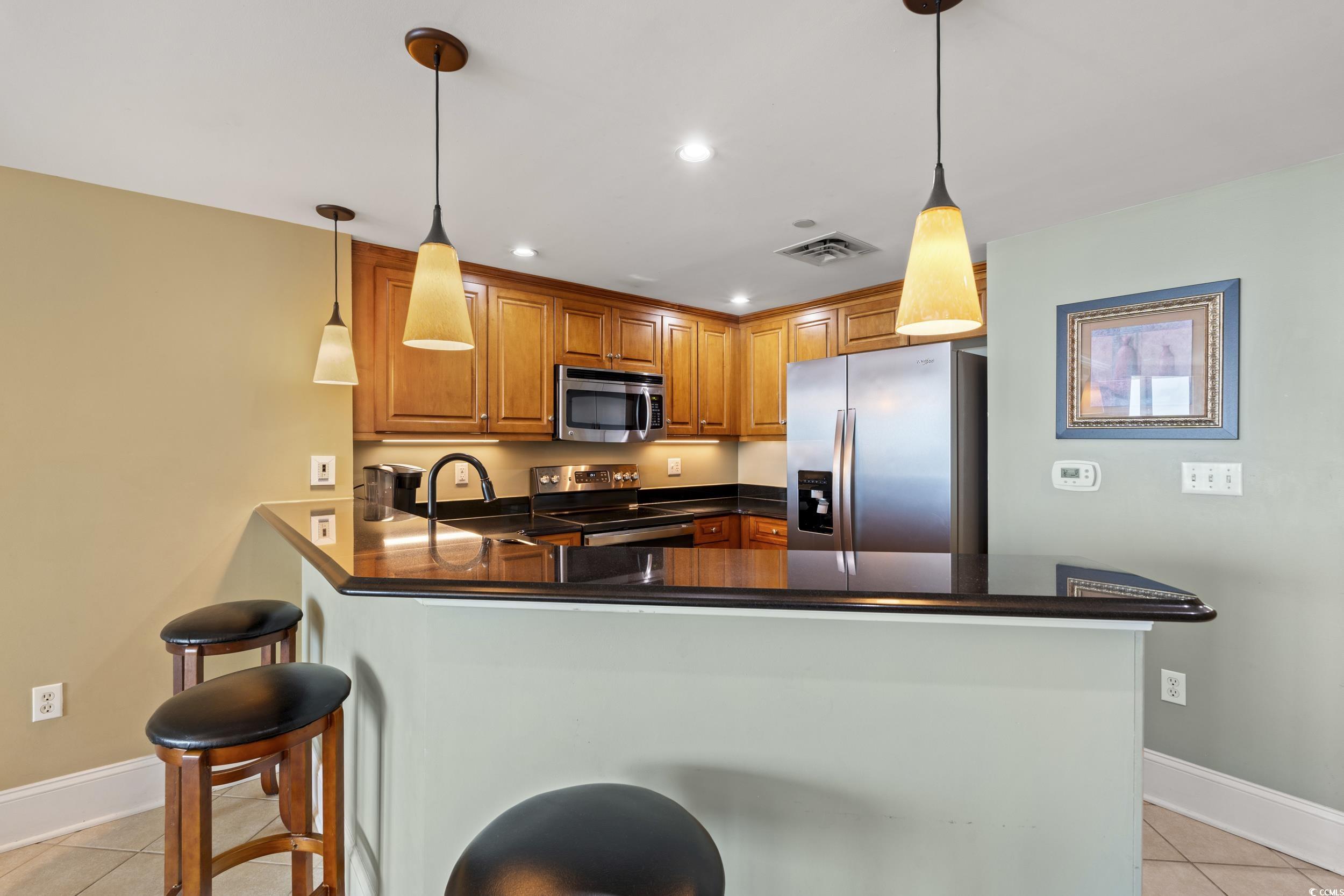 Experience coastal luxury at its finest at the prestigious Mar Vista Grande in North Myrtle Beach— an elegant oceanfront condo located at 603 S Ocean Blvd. #1205. This beautifully maintained 3-bedroom, 3-bath oceanfront condo offers breathtaking, unobstructed views of the Atlantic Ocean from a spacious private balcony — the perfect spot to relax or entertain. Inside, the open layout features a kitchen with dark granite countertops, stainless steel appliances, and a breakfast bar for casual dining. Tile and LVP flooring flow throughout, complemented by custom draperies and coordinated furnishings that create a warm, inviting feel. The oceanfront primary suite is a true retreat with 2 closets one being a walk-in closet. The spa-like bathroom is complete with dual sinks, a tiled walk-in shower, and a whirlpool tub. A washer and dryer in the unit provide everyday convenience for both owners and guests. Pride of ownership shows — this condo has been carefully managed by the original owner with a personal cleaning service and enjoys a strong rental history. It’s already fully booked through October 2025, with reservations extending into 2026. The current cleaning service may continue with the new owner, ensuring a seamless transition. There is a great size storage located outside of condo down the hall that is great for beach chairs, owners storage, etc. There are lots of luggage carts available, which helps a lot when arriving . During the season there is also an attendant to assist. The building lobby and elevator access are secured: you need a security code to enter the main lobby and get to the elevators. At Mar Vista Grande, you’ll enjoy resort-style amenities including indoor and outdoor pools, a lazy river, hot tubs, a fitness center, a seasonal poolside tiki bar, and private beach access. There’s even an on-site spa, making every day feel like vacation. Whether you’re looking for a second home, full-time residence, or proven rental investment, this exceptional condo offers it all. Don’t miss the opportunity to own a piece of paradise in one of North Myrtle Beach’s most sought-after oceanfront communities.