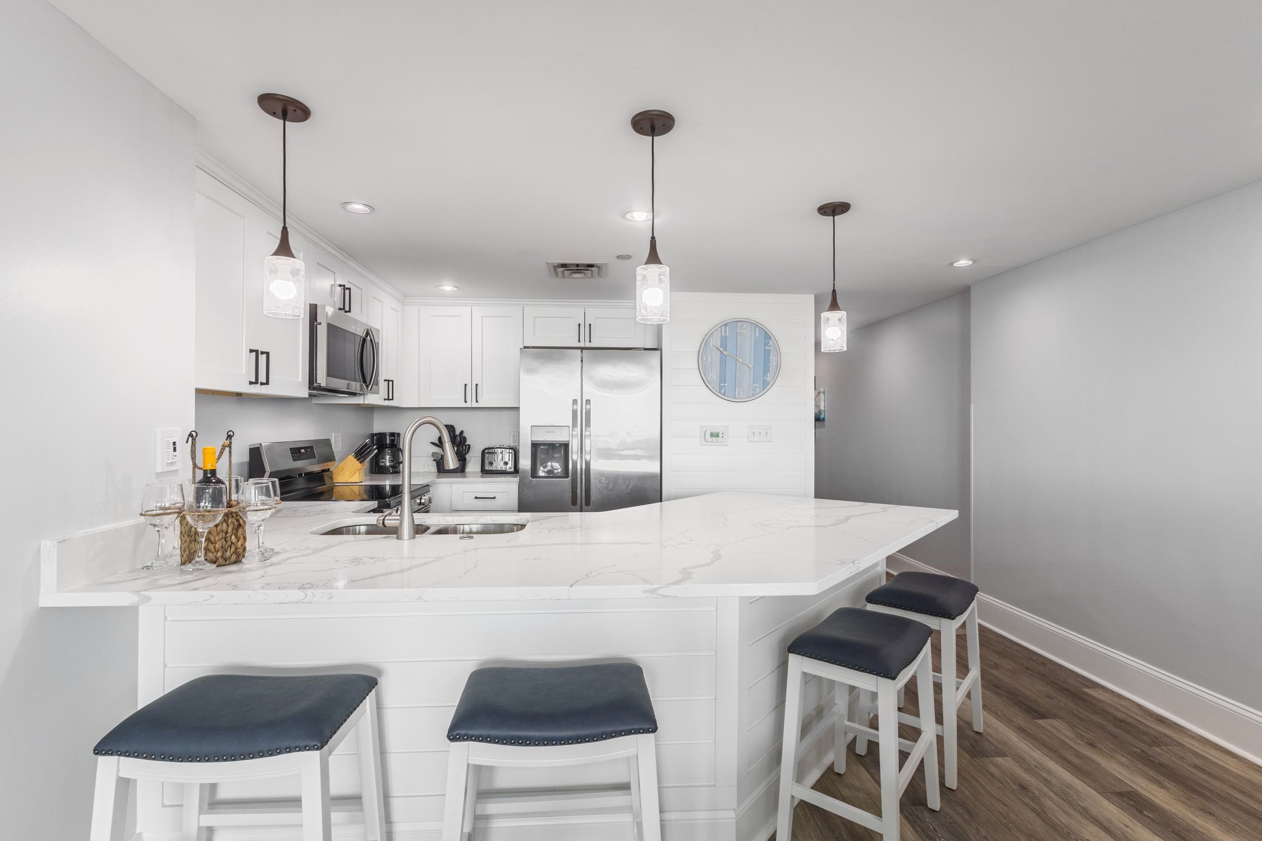 Discover refined coastal living in this stunning 3-bedroom, 3-bath luxury condo perfectly positioned in the heart of North Myrtle Beach. Located in a secured building just steps from the ocean and Main Street, this residence blends breathtaking views, modern upgrades, and resort-style amenities into one exceptional opportunity. Designed with a bright, open-concept layout, this spacious condo features two ocean-facing porches where you can enjoy spectacular sunrises from both the living room and the primary suite. The extra-large bedrooms offer comfort and flexibility, with a king-sized primary suite and two guest bedrooms each furnished with two queen beds — comfortably accommodating up to 10 guests. The newly remodeled kitchen showcases elegant quartz countertops, crisp white cabinetry, stainless steel appliances, and a fresh coastal design that perfectly complements the beachside setting. The entire unit has been freshly painted and upgraded with luxury vinyl plank flooring throughout, while bathrooms feature tile flooring for durability and style. The primary suite offers a spa-inspired bath complete with dual vanities, a tiled walk-in shower, and a relaxing jacuzzi tub. Guest bathrooms include convenient fiberglass tub/shower combinations. This property is being sold fully furnished (excluding outdoor patio furniture), making it truly turnkey and ideal as a primary residence, second home, or income-producing investment. Resort-Style Amenities Include: • Oceanfront pool and lazy river, • Indoor pool for year-round enjoyment, • State-of-the-art fitness center. Located just steps from Main Street North Myrtle Beach, you’ll enjoy easy access to live music, dining, shopping, and the area’s famous shag dancing. Whether you are seeking the ultimate beach lifestyle or a high-performing rental property in one of the Grand Strand’s most desirable upscale condo communities, this ocean view condo delivers both luxury and opportunity.