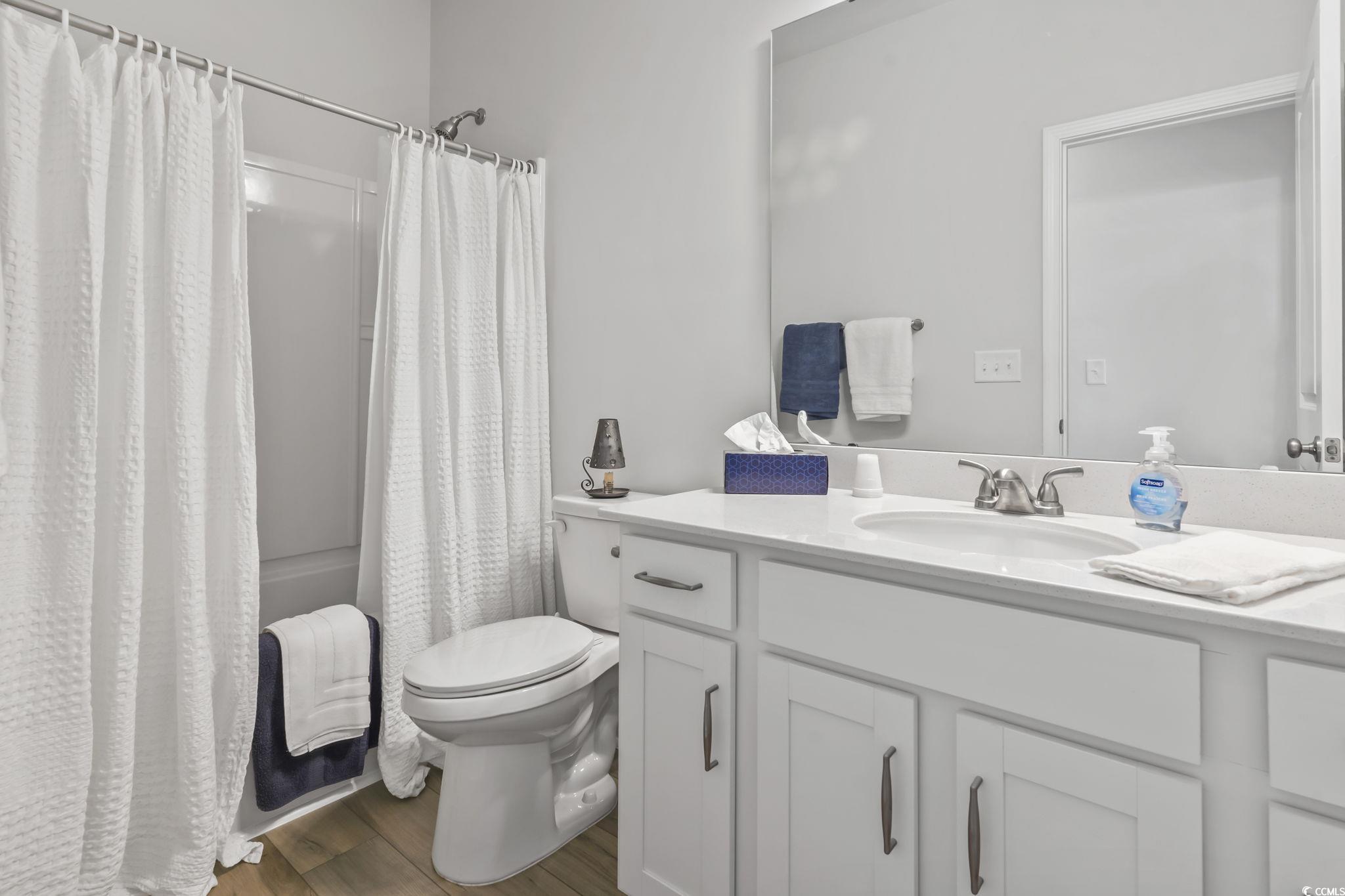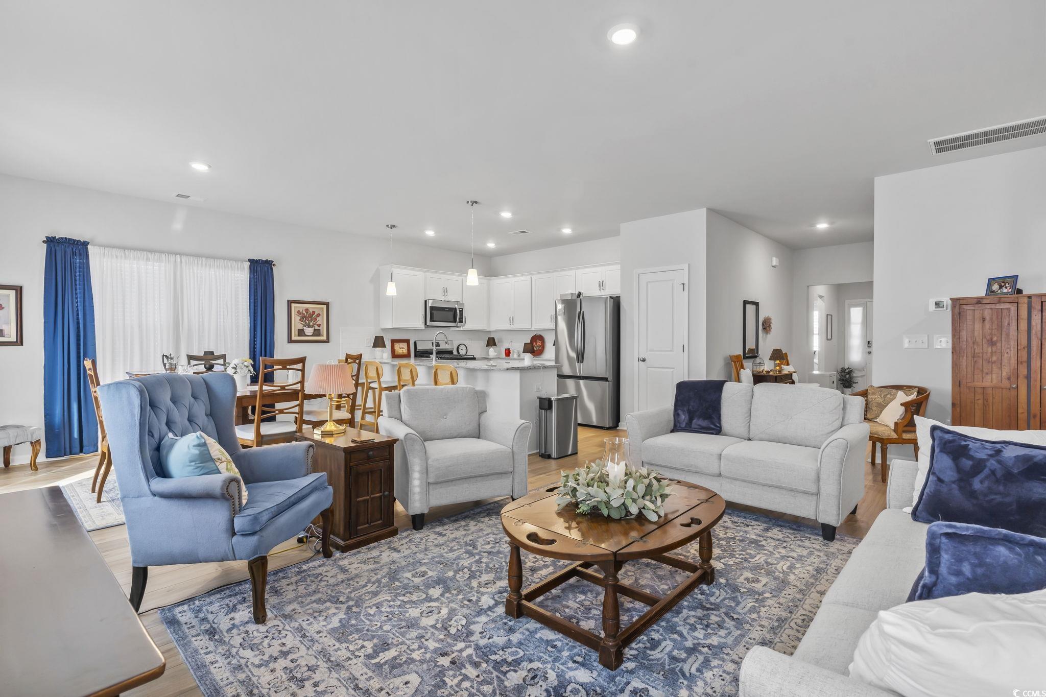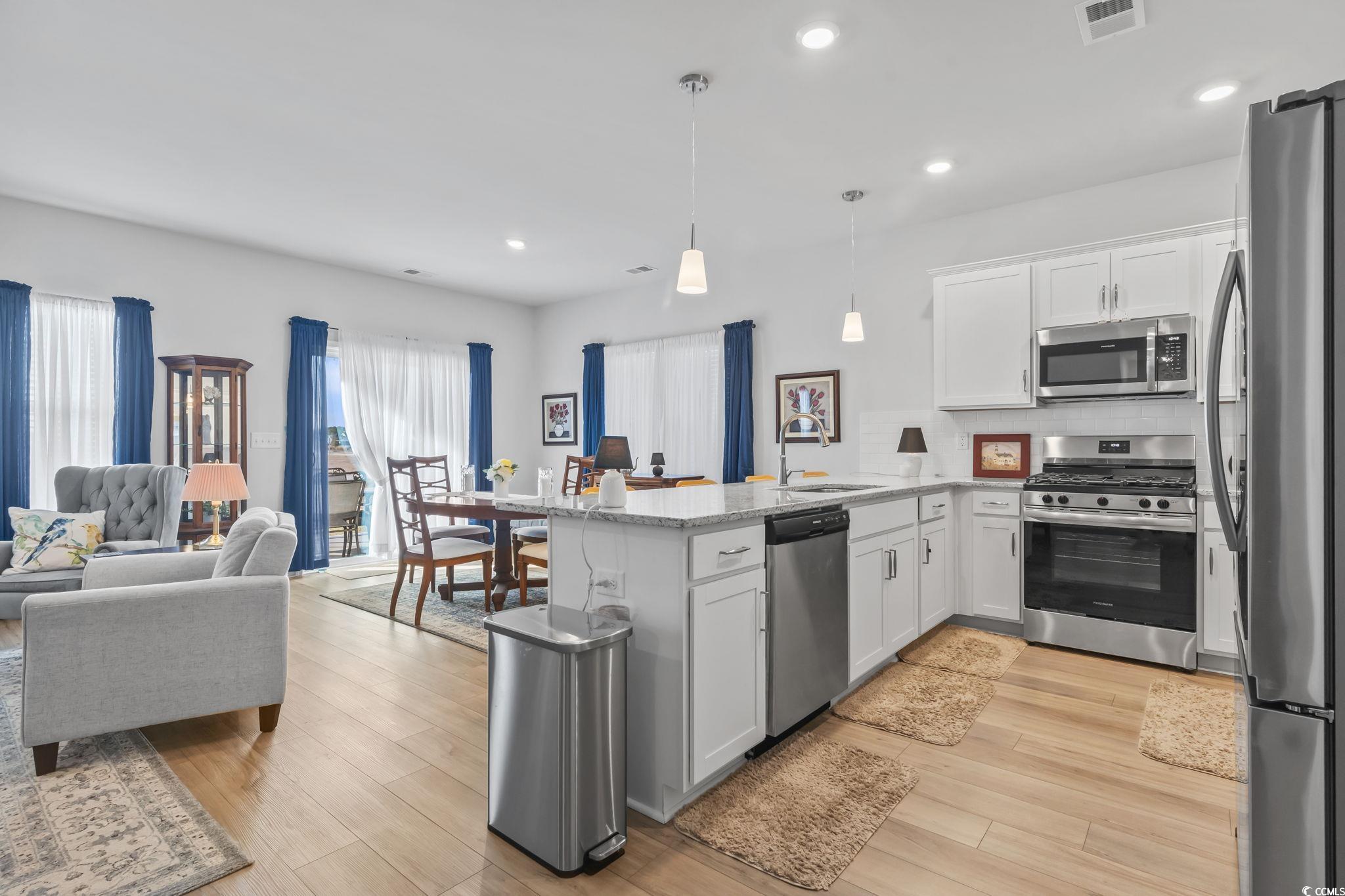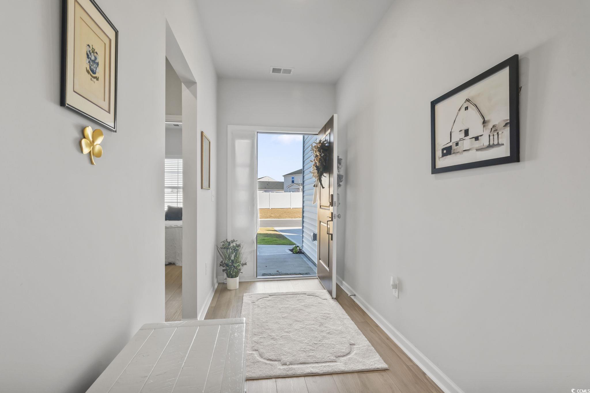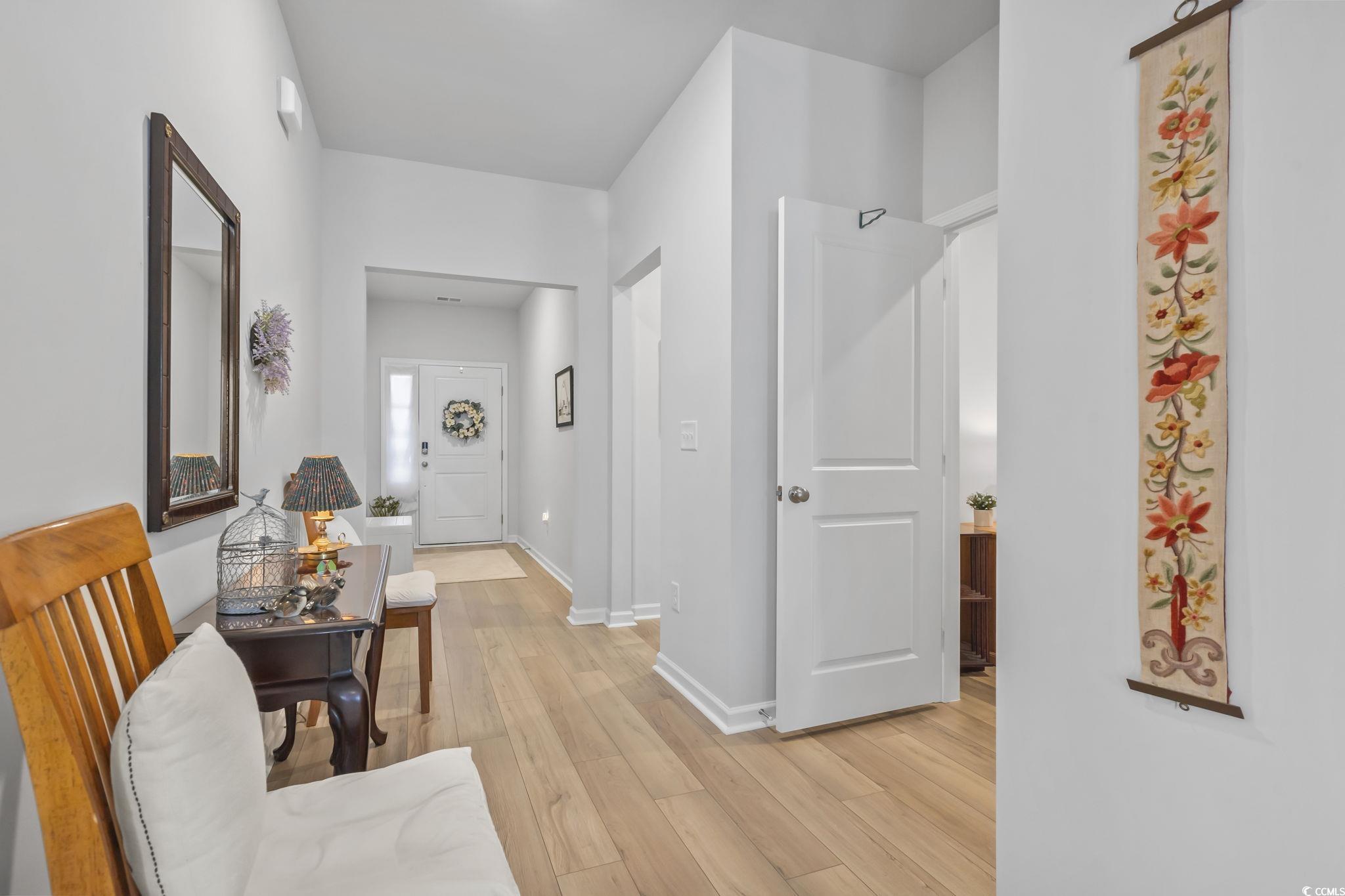 Tucked away on a sunny corner lot in the welcoming community of Merrill Villas, this nearly new home invites you in with comfort, style, and a peaceful coastal vibe. Built less than a year ago and thoughtfully enhanced by the owner, it’s truly move-in ready—complete with added gutters, custom blinds, and a covered, screened-in porch that becomes your front-row seat to tranquil pond views and graceful visiting swans. It’s the perfect spot to unwind with morning coffee or host friends in the evening breeze. *** Inside, the home opens to a bright and airy 3-bedroom, 2-bath split floor plan, designed for both privacy and easy living. Luxury vinyl plank flooring flows throughout the entire home—no carpet anywhere—creating a clean, modern feel and effortless maintenance. The open layout feels warm and inviting, offering a beautiful canvas for your personal style while already delivering modern finishes and comfort. *** The primary suite is your private retreat, featuring a generous walk-in closet and a spa-inspired ensuite with a quartz double vanity and a sleek 5’ tiled shower with glass enclosure. At the heart of the home, the kitchen truly shines with upgraded white cabinetry, granite countertops, tile backsplash, pendant lighting, and an oversized peninsula that overlooks the great room and casual dining area—ideal for everything from quiet dinners to lively gatherings. *** Just steps away, enjoy the community pool and cabana, making sunny days and social afternoons effortlessly convenient. Located in the highly desirable Carolina Forest area, Merrill Villas places you less than five miles from the beach, with quick access to shopping, dining, golf courses, and Myrtle Beach International Airport. *** Nearly new, beautifully improved, and perfectly positioned—this home isn’t just a place to live, it’s a place to settle in, slow down, and enjoy coastal living at its best.