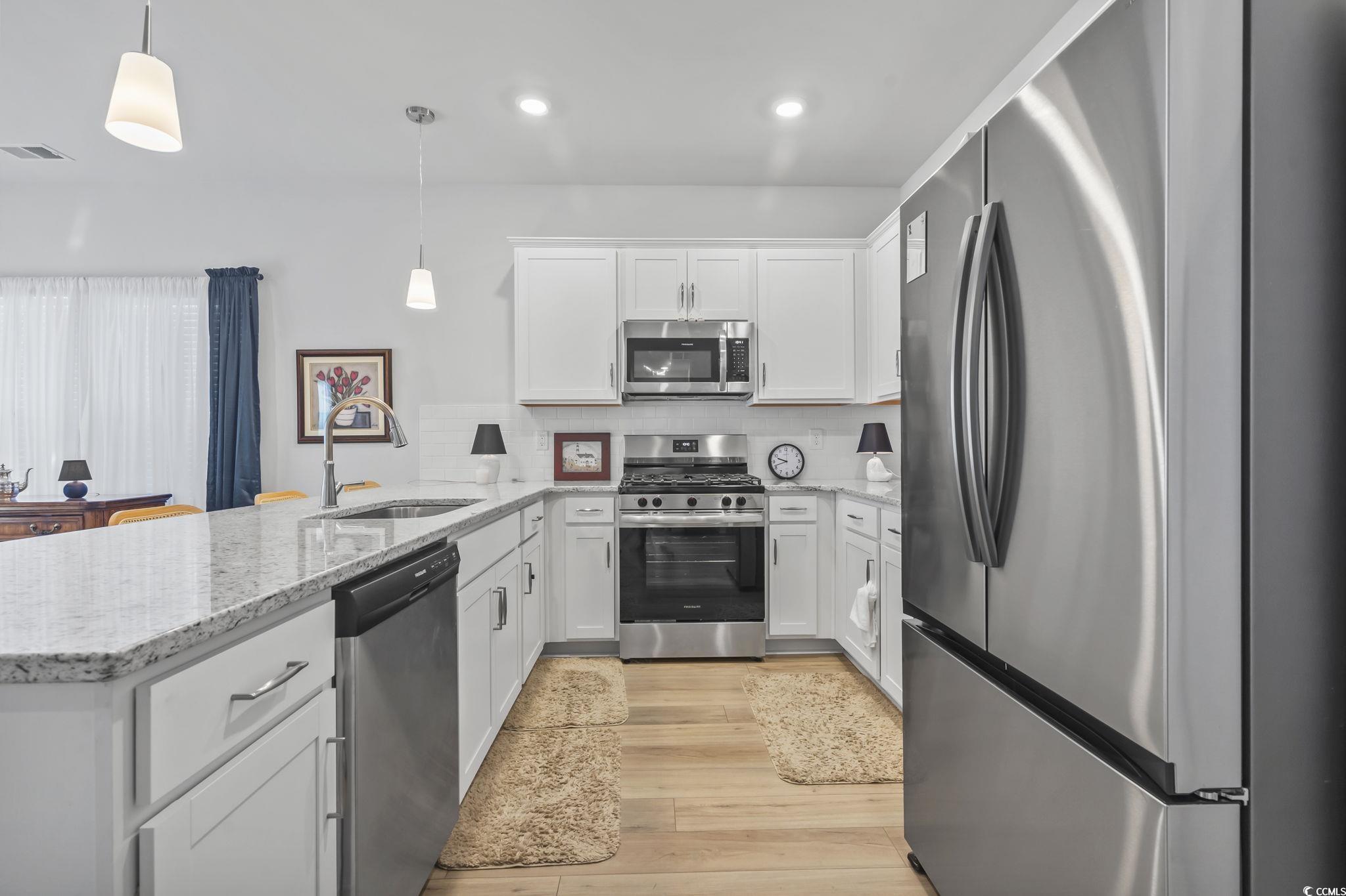 ***Tucked away on a sunny corner lot in the welcoming community of Merrill Villas, this nearly new home invites you in with comfort, style, and a peaceful coastal vibe. Built less than a year ago and thoughtfully enhanced by the owner, it’s truly move-in ready—complete with added gutters, custom blinds, and a covered, screened-in porch that becomes your front-row seat to tranquil pond views and graceful visiting swans. It’s the perfect spot to unwind with morning coffee or host friends in the evening breeze. *** Inside, the home opens to a bright and airy 3-bedroom, 2-bath split floor plan, designed for both privacy and easy living. Luxury vinyl plank flooring flows throughout the entire home—no carpet anywhere—creating a clean, modern feel and effortless maintenance. The open layout feels warm and inviting, offering a beautiful canvas for your personal style while already delivering modern finishes and comfort. *** The primary suite is your private retreat, featuring a generous walk-in closet and a spa-inspired ensuite with a quartz double vanity and a sleek 5’ tiled shower with glass enclosure. At the heart of the home, the kitchen truly shines with upgraded white cabinetry, granite countertops, tile backsplash, pendant lighting, and an oversized peninsula that overlooks the great room and casual dining area—ideal for everything from quiet dinners to lively gatherings. *** Just steps away, enjoy the community pool and cabana, making sunny days and social afternoons effortlessly convenient. Located in the highly desirable Carolina Forest area, Merrill Villas places you less than five miles from the beach, with quick access to shopping, dining, golf courses, and Myrtle Beach International Airport. *** Nearly new, beautifully improved, and perfectly positioned—this home isn’t just a place to live, it’s a place to settle in, slow down, and enjoy coastal living at its best.
