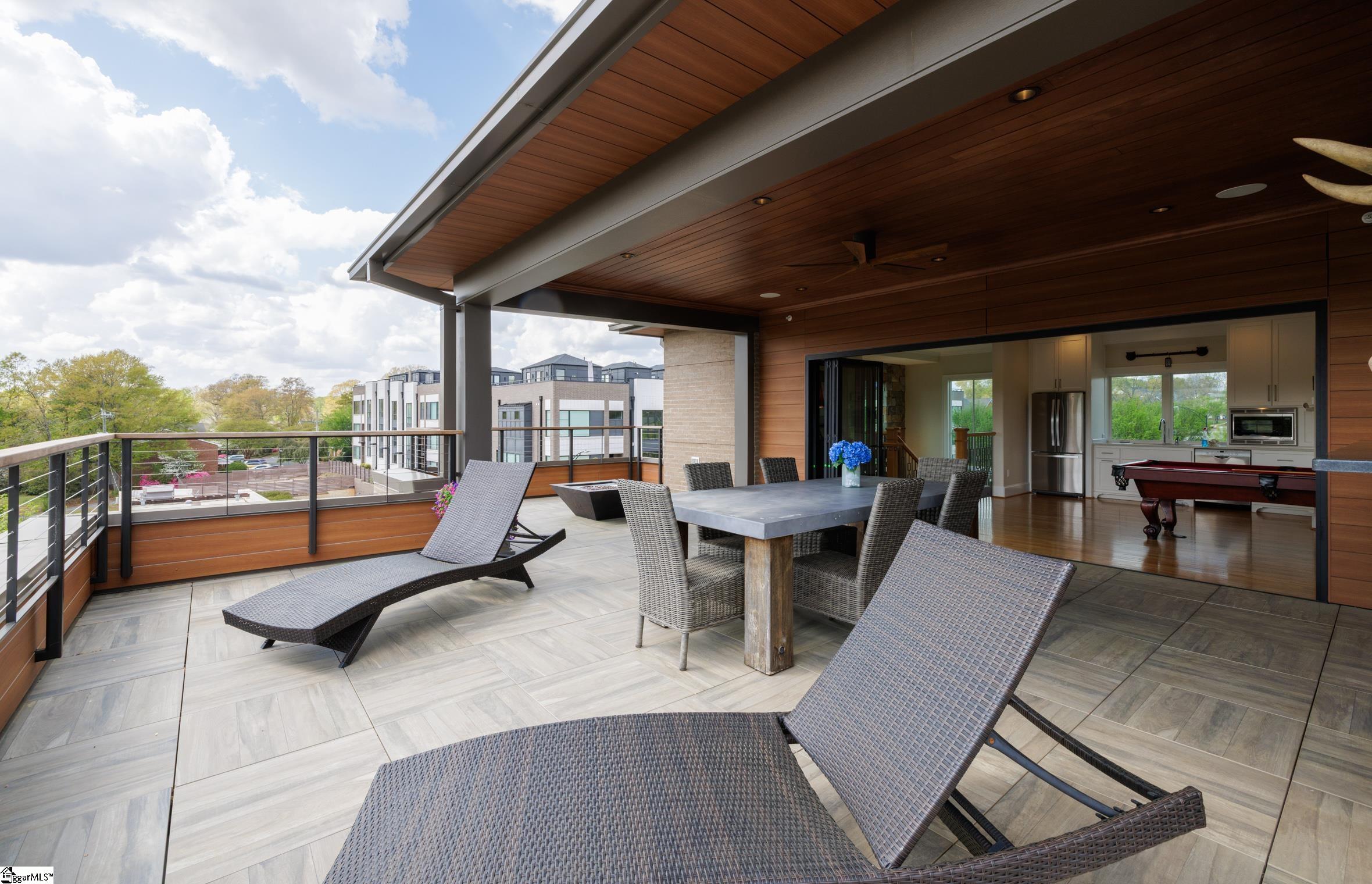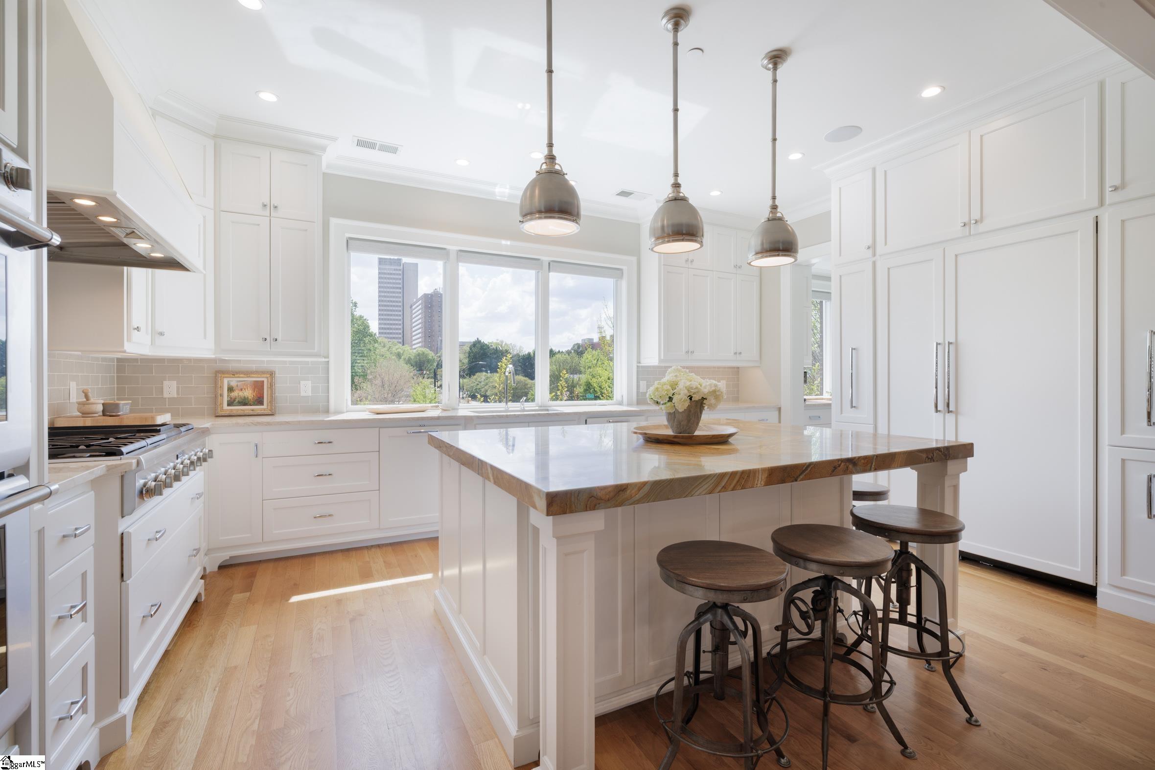 Think boutique hotel meets modern brownstone. Perfectly positioned on coveted North Main Street near McPherson Park, Greenville’s oldest historic park, this one-owner, custom-built residence offers an exceptional blend of luxury, functionality, and elevated living, all within walking distance to the city’s most celebrated dining, shopping, and green spaces. This thoughtfully designed four-level home welcomes you with a grand foyer and a private main-level guest suite complete with its own en-suite bath, ideal for hosting or multigenerational living. This level also provides access to the three-car tandem garage, thoughtfully equipped with a pet washing station, utility closet, tankless water system, and additional storage. And while the staircase makes a statement all its own, a private elevator offers effortless access to every level. The second level serves as the heart of the home, featuring an impeccably appointed chef’s kitchen with a generous center island, bar seating, and captivating city views. A spacious walk-in pantry opens to one of the home’s three terraces, creating seamless indoor-outdoor flow. This level also includes a formal dining room, a dedicated home office with rich mahogany walls and sliding doors for privacy, a well-appointed laundry room with sink and storage, and a stylish powder room for guests. The third level is a true private retreat, highlighted by a luxurious primary suite featuring dual walk-in closets and a spa-inspired bath with a freestanding soaking tub, expansive tiled shower, and dual vanities with abundant storage. An additional guest suite on this level offers its own en-suite bath, ensuring comfort and privacy for all. The fourth level elevates the experience even further, offering a sophisticated recreation space complete with a wet bar, secondary kitchenette, and full bath. Dramatic accordion-style doors open to an expansive rooftop terrace with a built-in grill & bar, creating a seamless indoor-outdoor setting with stunning skyline views—perfectly perched above downtown Greenville. Homes of this caliber don’t just come on the market. They make an entrance. NOW: Make yours!