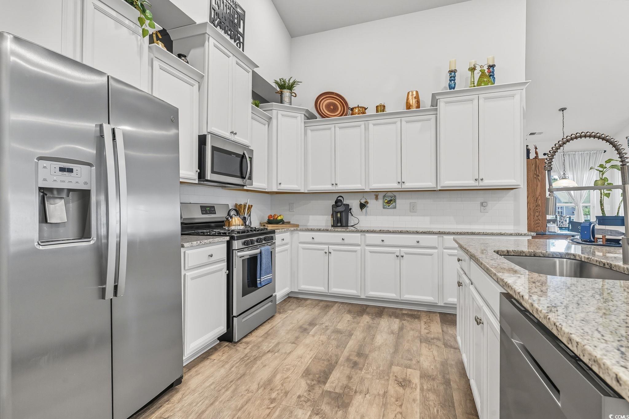 Very upgraded and unique lakefront ranch style home in Forestbrook Estates. This Muirwood model has all the great features which make this floorplan so desirable. From the 3-car garage to the large southern front porch. A spacious open floorplan seems the kitchen, dining room and family room together wonderfully, with vaulted ceilings just adding to the open feel of this home. Upgraded white kitchen cabinets, subway backsplash, stainless appliances, granite kitchen counters, and oversized pantry highlight the kitchen. Luxury vinyl flooring has been extended throughout the home, making it carpet free. Both bathrooms have been upgraded with quartz countertops and framed mirrors. What really sets this home apart is the massive rear porch. This approximately 410 square foot space is fully covered with vaulted ceilings, has dual skylights, is fully screened and has stamped concrete floors. Enjoy the stunning lake views from your personal hot tub which conveys with the sale. HVAC is only one year old, and the yard comes with irrigation. Forestbrook Estates features a community pool & garden. Close proximity to all shopping, dining and the beach. All square footage is approximate and not guaranteed.