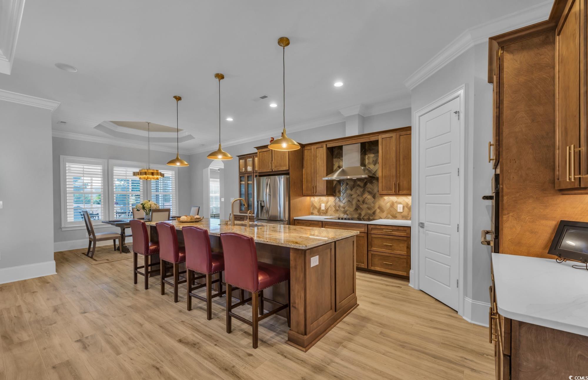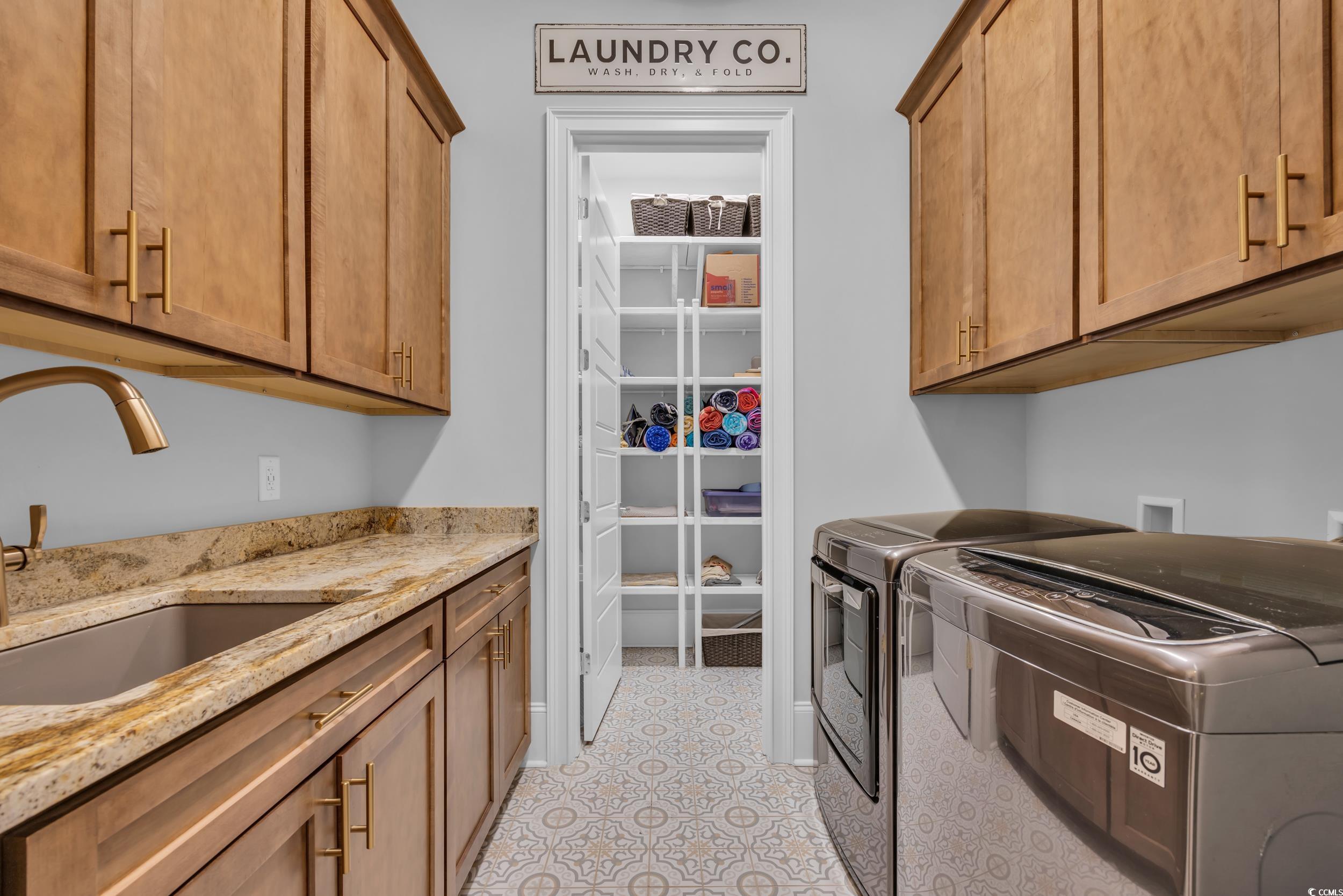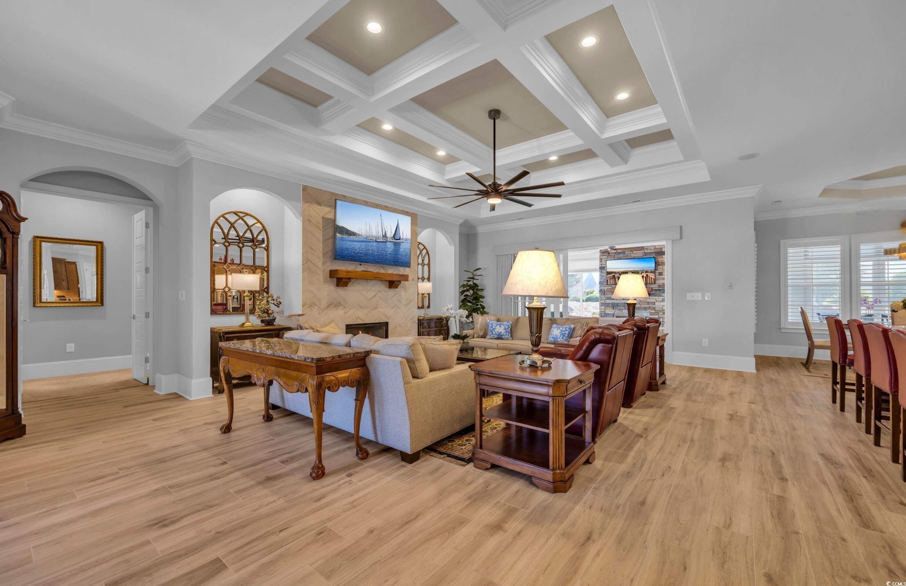 Within this exclusive 55+ gated Grande Dunes Waterside Pointe enclave, a newly completed masterpiece awaits—crafted in 2023 by the acclaimed Carrell Group for those who believe home should be nothing less than extraordinary. Step through grand double doors into a world of elegance. Soaring 11-foot ceilings (12 ft in coffered details) and Italian porcelain tile floors set the stage, while crown molding, recessed lighting, and architectural details whisper of timeless craftsmanship. To one side, a formal dining room glows beneath a boxed tray ceiling with accent lighting—ideal for refined gatherings. Beyond, the living room invites with a modern gas fireplace, custom built-ins, and a coffered ceiling. The gourmet kitchen blends artistry and function—granite and quartz surfaces, dramatic backsplash, soft-close cabinetry, and a custom wood-shelved pantry. A stunning 11-foot island offers abundant seating, complemented by champagne bronze hardware, a boiling water tap, and premium stainless appliances with gas line available. Triple glass sliders open to the Carolina Room, where a stacked-stone gas fireplace creates an inviting year-round retreat. The primary suite is a sanctuary with a tray ceiling, dual custom wardrobes, and a spa-inspired bath featuring quartz vanities, gold fixtures, and a fully tiled shower with intricate accents. Two additional main-level bedrooms each with their own private ensuite baths with floor-to-ceiling tiled showers, plush carpet and tray ceilings. A versatile office/library offers quiet focus or creative inspiration. Upstairs, two more bedrooms, a full bath, and a central flex/media room with charming dormers provide comfort and flexibility. Throughout, thoughtful luxuries abound—central vacuum system, HALO water filtration, Rinnai tankless hot water, irrigation, whole-house audio, security system, and plantation shutters. The oversized three-car garage features epoxy flooring, overhead storage, and utility sink. Outdoor living is equally refined with a paver patio, built-in grill, and lush landscaping on a 0.29-acre lot. Residents of Waterside Pointe enjoy an unparalleled lifestyle with exclusive access to two premier Amenity Centers. The private Ocean Club, featuring Ocean Front dining, a resort-style pool, and gated car and golf cart parking. In addition, membership to the Del Webb Amenity Center along the Intracoastal Waterway, offering Indoor and Outdoor Pools, Bocce Ball, Picklebal & Tennis courts, scenic walking paths Fire Pit, organized events and clubs and beautifully designed gathering spaces- the perfect blend of coastal luxury and active lifestyle living. This is more than a residence—it’s a lifestyle of premier luxury, leisure, and coastal beauty in one of Myrtle Beach’s most coveted communities. Schedule your private tour today.