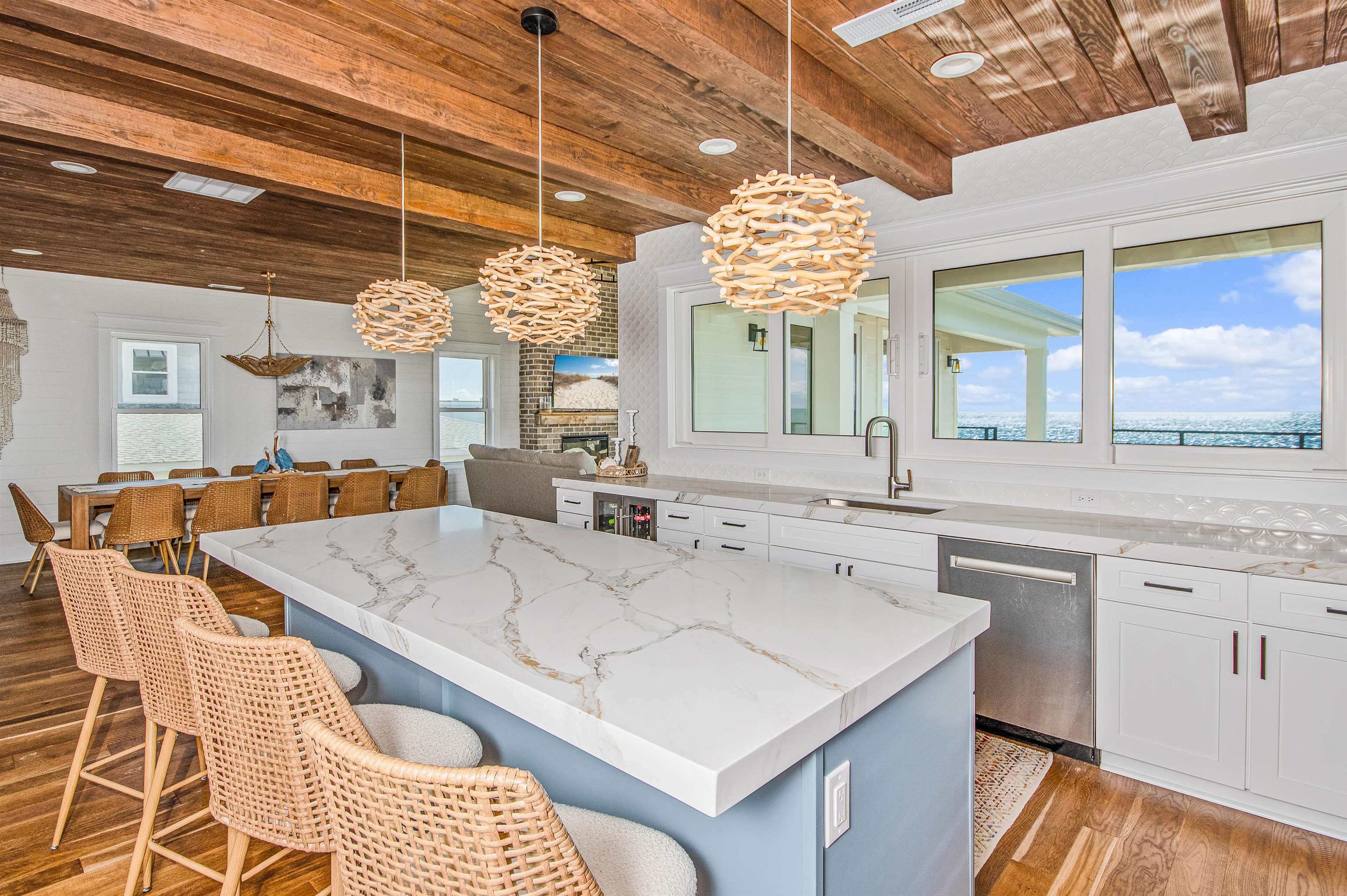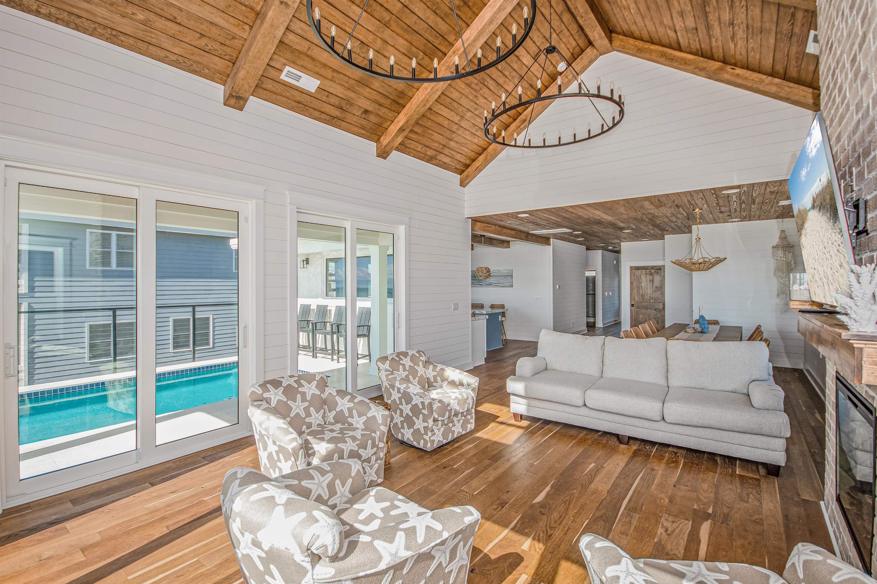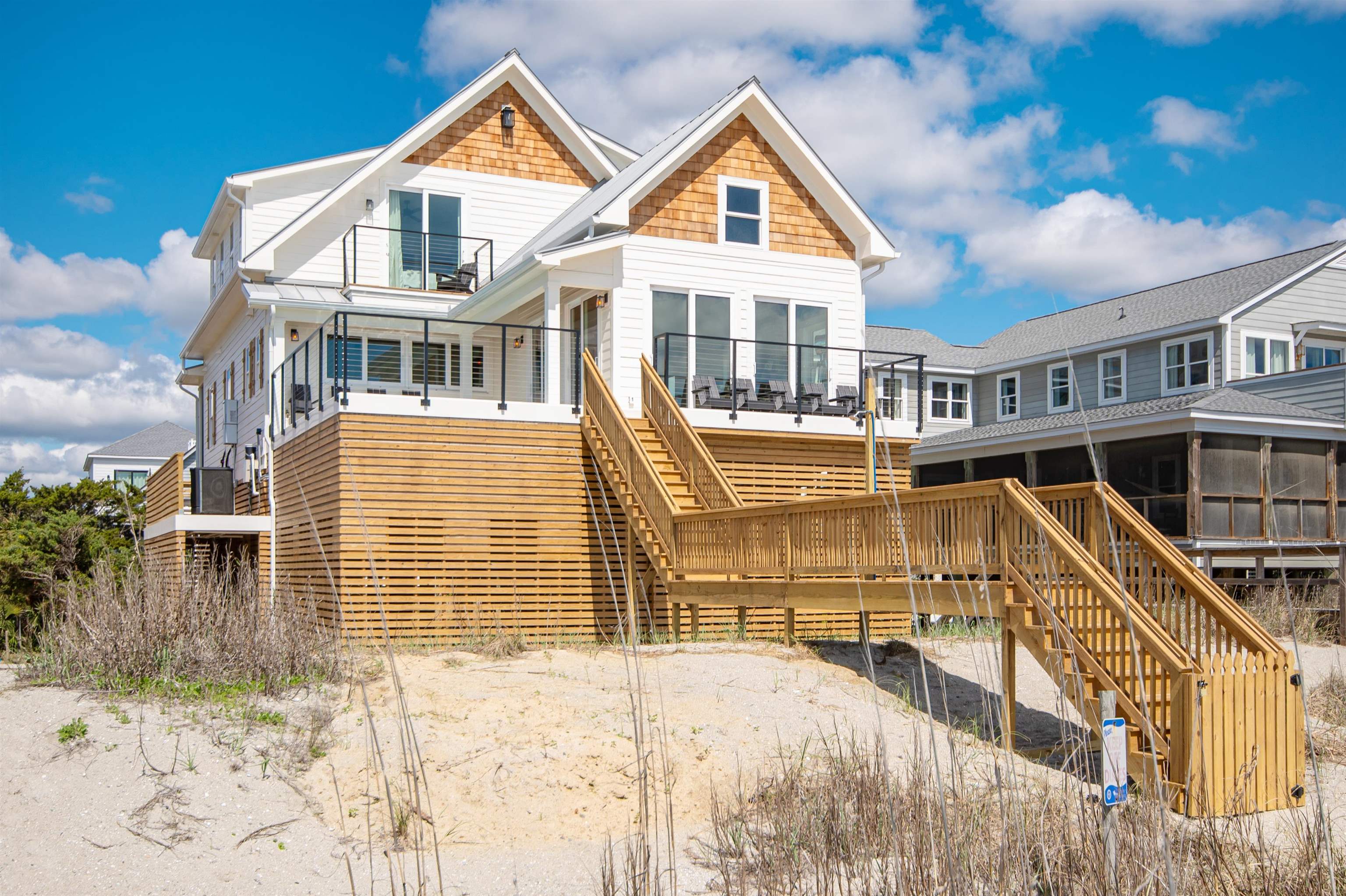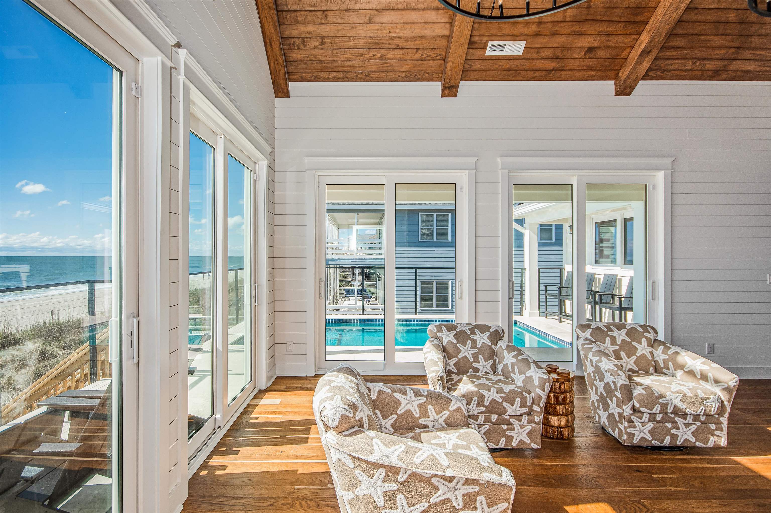 Amazing opportunity for exquisite island living! Located in the charming Bird’s Nest section on the south end of Pawleys Island, this newly constructed home boasts contemporary charm, stunning oceanfront views, and elevated saltwater pool. Home features include a great room with panoramic ocean view, vaulted wood-inlaid ceiling and electric fireplace, an oceanfront open concept kitchen, beautiful hardwood floors throughout, ocean-side deck with private beach boardwalk, and covered parking. Notably, this raised two-story home comes with a single-level living option. All the common areas, including the screened porch and pool plus two bedrooms and two full baths, are located on the first floor - all accessible by elevator (to first floor only) or by a covered exterior stairway. Four more bedrooms and two baths are located on the top floor. Two bedrooms currently have a king bed in each and enjoy an oceanfront balcony in one and peek-a-boo creek view from the other. In between these bedrooms are mirror-image bathrooms with combination walk-in shower/garden tub - one en suite, one in the hallway. Additional attributes include high impact storm windows, seamless metal roof, concrete fiber siding, central fire alarm control panel, and travertine encased pool with heating option. Home to be sold fully furnished. A shared, right-of-way, gated beach boardwalk with keyless lock is located on the north side of the home. Public creek access is a short walk away. Primary residence or second home with excellent rental potential. No HOA. Myrtle Beach International Airport is 25 miles north. Historic Charleston SC is 75 miles south.