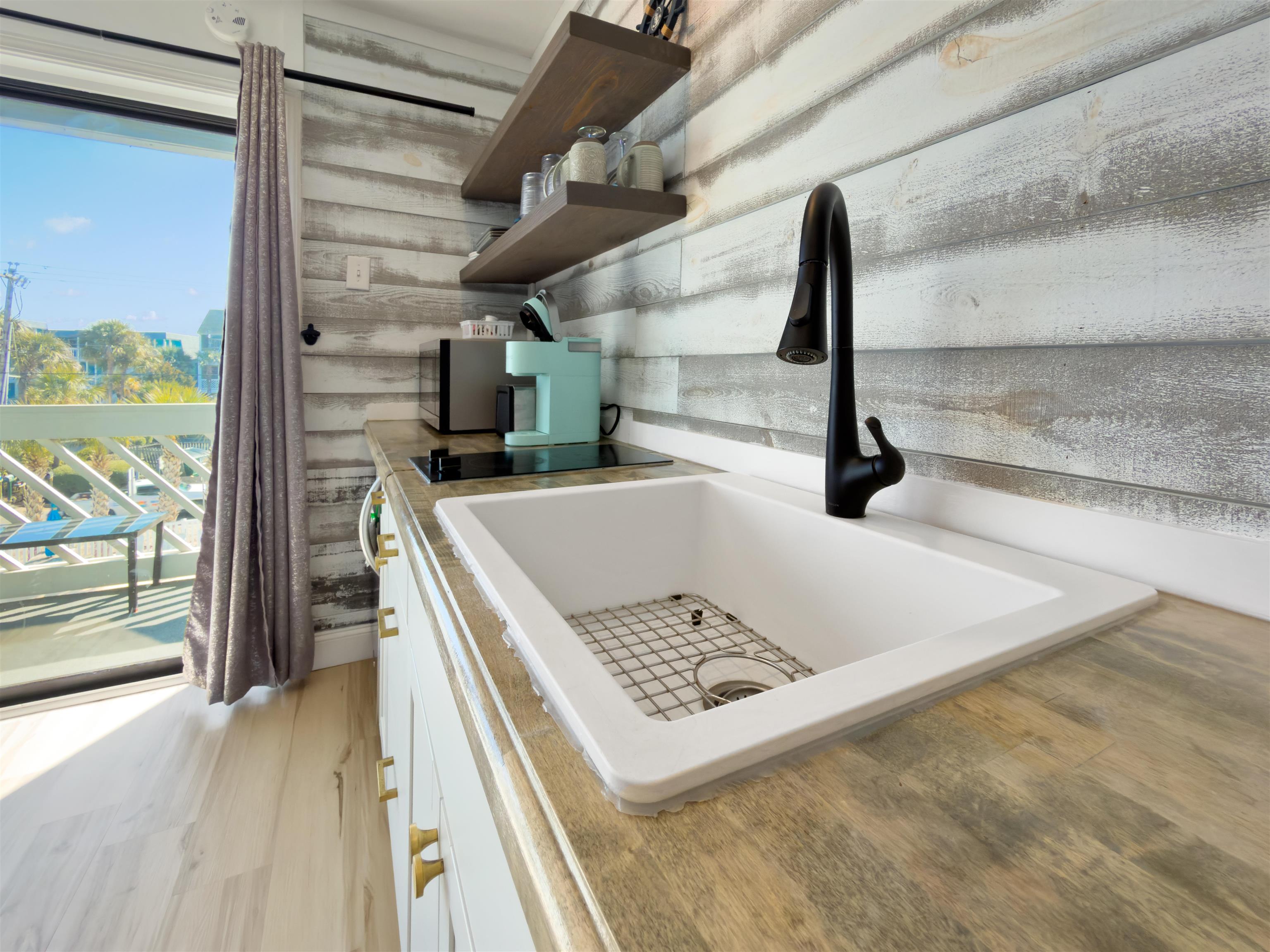 Beautifully updated and move-in ready 1-bedroom, 1-bath condo in Whispering Sands, just steps from the beach in North Myrtle Beach. This fully furnished unit features luxury vinyl plank flooring throughout and tasteful coastal touches, including white paneling used as the kitchen backsplash, adding a light and relaxed beach feel. The kitchenette is thoughtfully designed with a mini refrigerator, and microwave. Perfect for beach getaways, weekend escapes, or short stays where convenience and simplicity matter most. The living area offers a warm fireplace and access to a private balcony, creating the perfect space to enjoy ocean breeze. The bedroom comfortably accommodates two queen-size beds, providing flexibility for owners and guests alike. The updated bathroom includes a newly renovated tiled shower, completing the clean and modern look of the condo. Whispering Sands offers residents and guests a private pool along with convenient golf cart parking. Located one block from the ocean and close to dining, shopping, and local attractions, this condo delivers low-maintenance coastal living in a highly desirable North Myrtle Beach location.