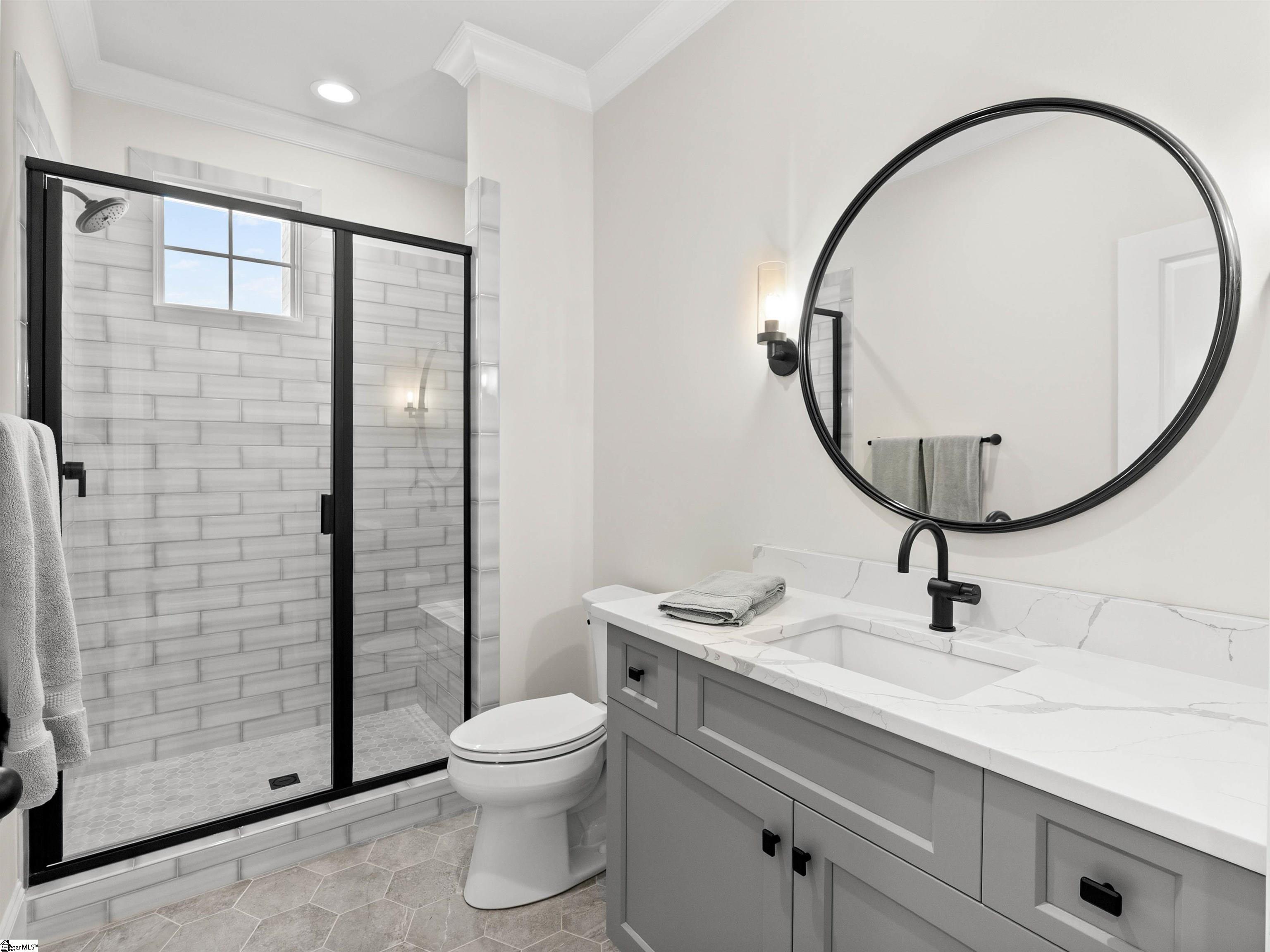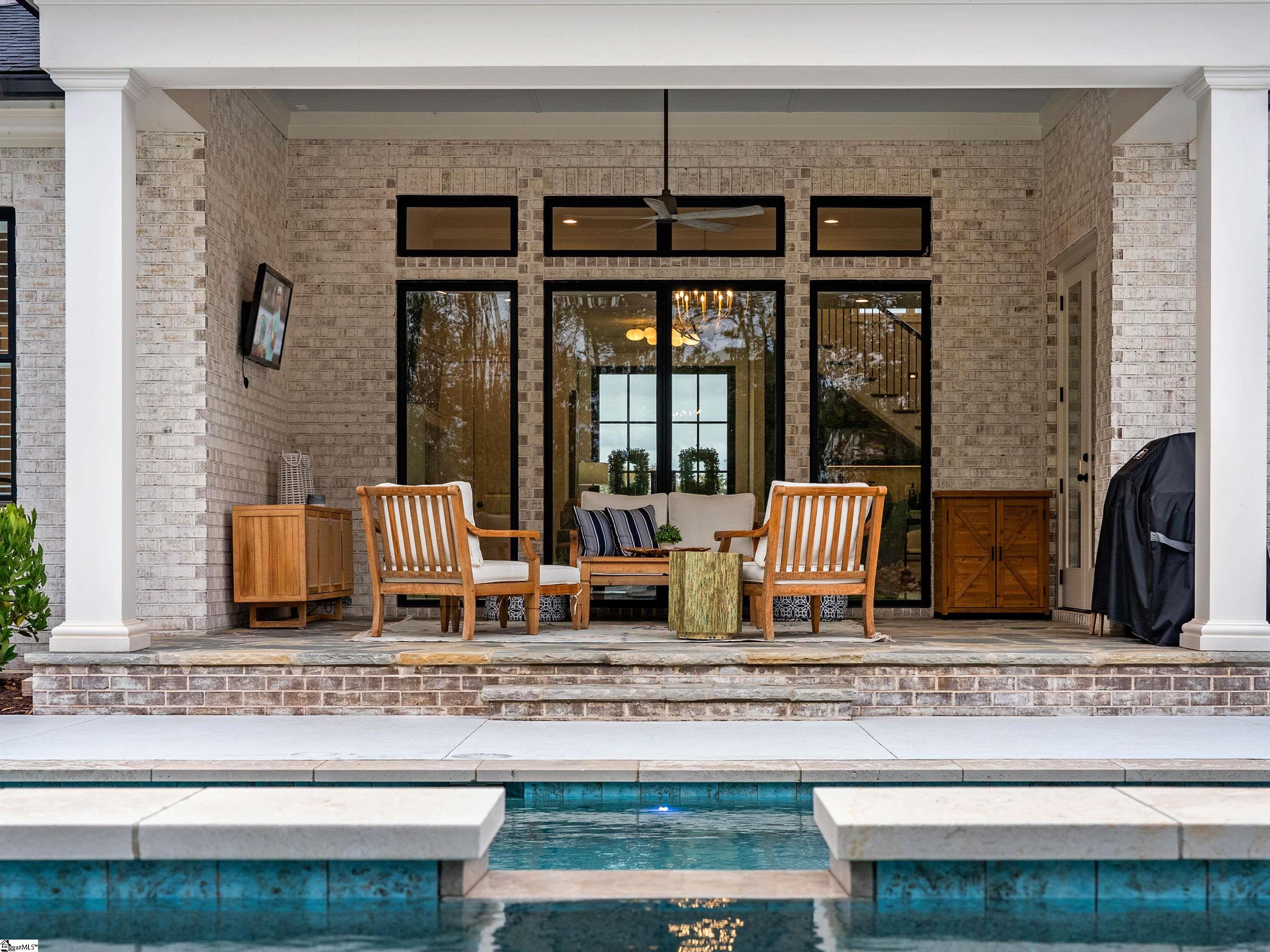 Welcome to a rare opportunity to own a bespoke estate in Le Jardin, one of Upstate South Carolina’s most prestigious gated communities. This exceptional 5-bedroom, 5.5-bathroom, 3-car residence spans 4,100 square feet of exquisitely designed living space, where every detail embodies sophistication, artistry, and timeless elegance. French-inspired in design, this home showcases refined craftsmanship and thoughtfully curated luxury finishes throughout, complemented by magnificent light fixtures that enhance every space. The main floor features a sumptuous primary suite with a spa-worthy en suite bathroom, complete with dual vanities, a dedicated sit-down makeup area, a standalone soaking tub, glass-enclosed shower, water closet, and an expansive walk-in closet with a hidden, coded panic room behind a floor-to-ceiling mirror. A secondary bedroom on the main level also boasts a private en suite and generous walk-in closet, perfect for guests or family. Every detail on the first floor has been designed for both style and convenience. The gourmet kitchen is a chef’s dream, featuring an oversized 8-foot center island, HGI custom cabinetry with glass-front cabinet doors, dedicated accent lighting, under-cabinet lighting and showcasing a top of the line upgraded THERMADOR professional appliance package. This kitchen is a statement of ultimate culinary sophistication. Just off the kitchen is the oversized dining room, adjacent to the main living room. This open floor plan features soaring ceilings and large windows that bathe the space in natural light, overlooking the covered patio, pool, hot tub, and outdoor fire pit—it is an entertainer’s dream. On the main floor there is a delightful nook that houses a built-in champagne and wine bar, with refrigerated storage and shelving for stemware and accessories—a cozy spot to enjoy a glass and relax. A large walk-in laundry room with cabinetry and counter space, a mudroom with even more cabinetry and counter space, a spacious pantry with custom shelving, equipped with a motion-sensor light for added convenience and a powder room with beautiful finishes and elegant wallpaper. All bathrooms throughout the home are thoughtfully designed with distinctive character, featuring custom flooring, luxurious cabinetry, and elegant countertop finishes. Upstairs, a luminous landing with floor-to-ceiling windows offers serene views of the neighborhood, leading to three additional bedrooms, three bathrooms, and a bonus room. The fifth bedroom could be used as an office or flex space and provides direct access to a walk-in attic, offering abundant storage. Additional features include a three-car garage with professional epoxy flooring, three additional parking spots outside on the oversized driveway, inside garage hot and cold water hose connections for car washing enthusiasts, a central vacuum system throughout the home, and a built-in generator for peace of mind. All of this is perfectly situated just 20 minutes from downtown Greenville and 10 minutes from GSP Airport, offering an unparalleled combination of privacy, convenience, and refined living.