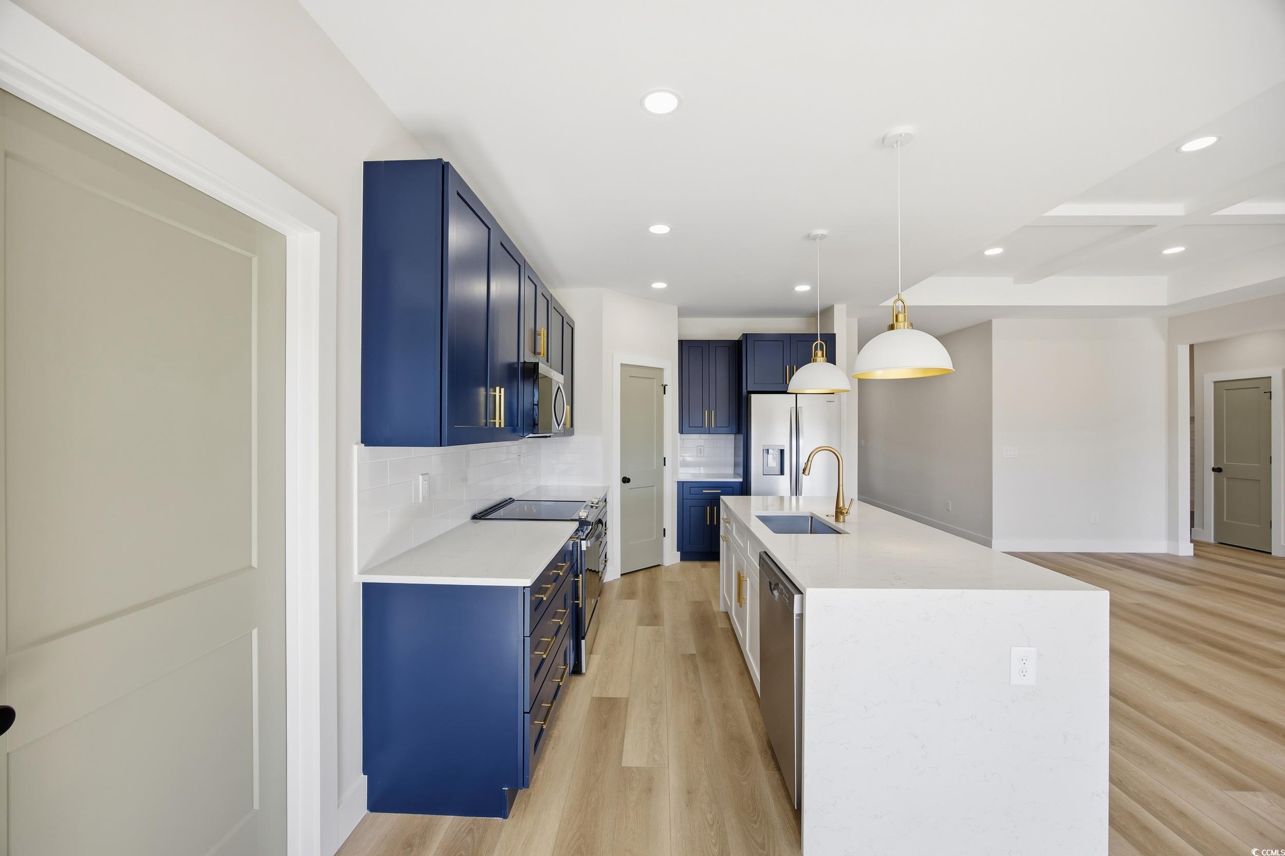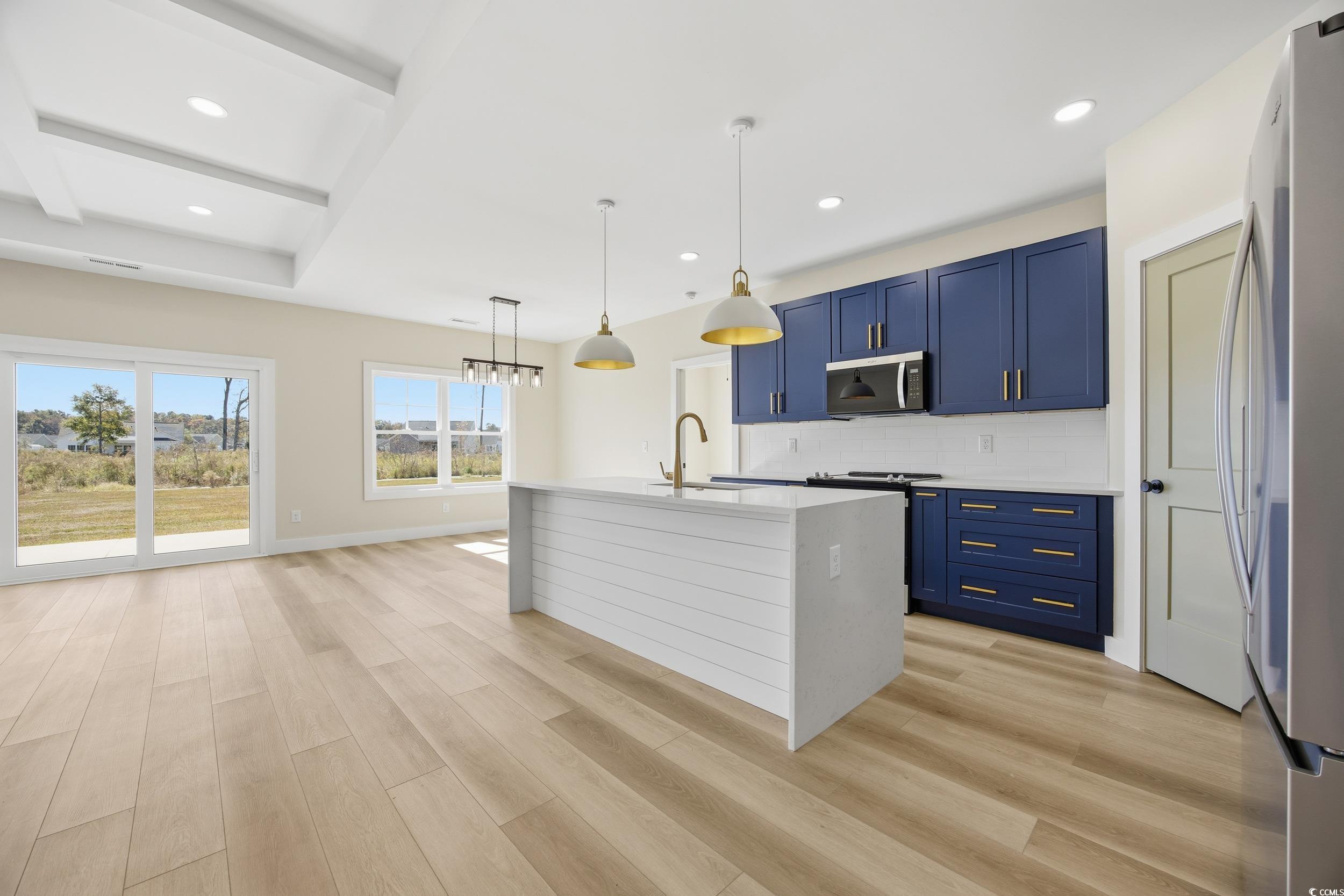 Brand new construction, move-in ready. This beautifully designed 4 bedroom, 3 bath home sits on a spacious 0.54 acre lot, offering comfort, privacy, and modern living just minutes from downtown Conway and less than 20 miles from Myrtle Beach. Featuring luxury vinyl plank flooring and 9-foot ceilings throughout, the open concept layout fills the home with natural light. The living room highlights elegant coffered ceilings and oversized sliding doors that open to a covered back porch, perfect for entertaining or relaxing outdoors. The kitchen showcases quartz countertops, shaker-style cabinets, and a stunning waterfall island. The private primary suite includes tray ceilings, a large walk-in closet, and a spa-style bathroom with a seamless walk-in shower and dual vanity. A secondary suite with its own bathroom is ideal for guests or extended family, plus two additional bedrooms and another full bath. Additional features include an attached two-car garage, dedicated laundry room, and no HOA. Enjoy the perfect combination of space, design, and convenience in a quiet residential setting. Schedule your private showing today and discover the best of new construction in Conway.