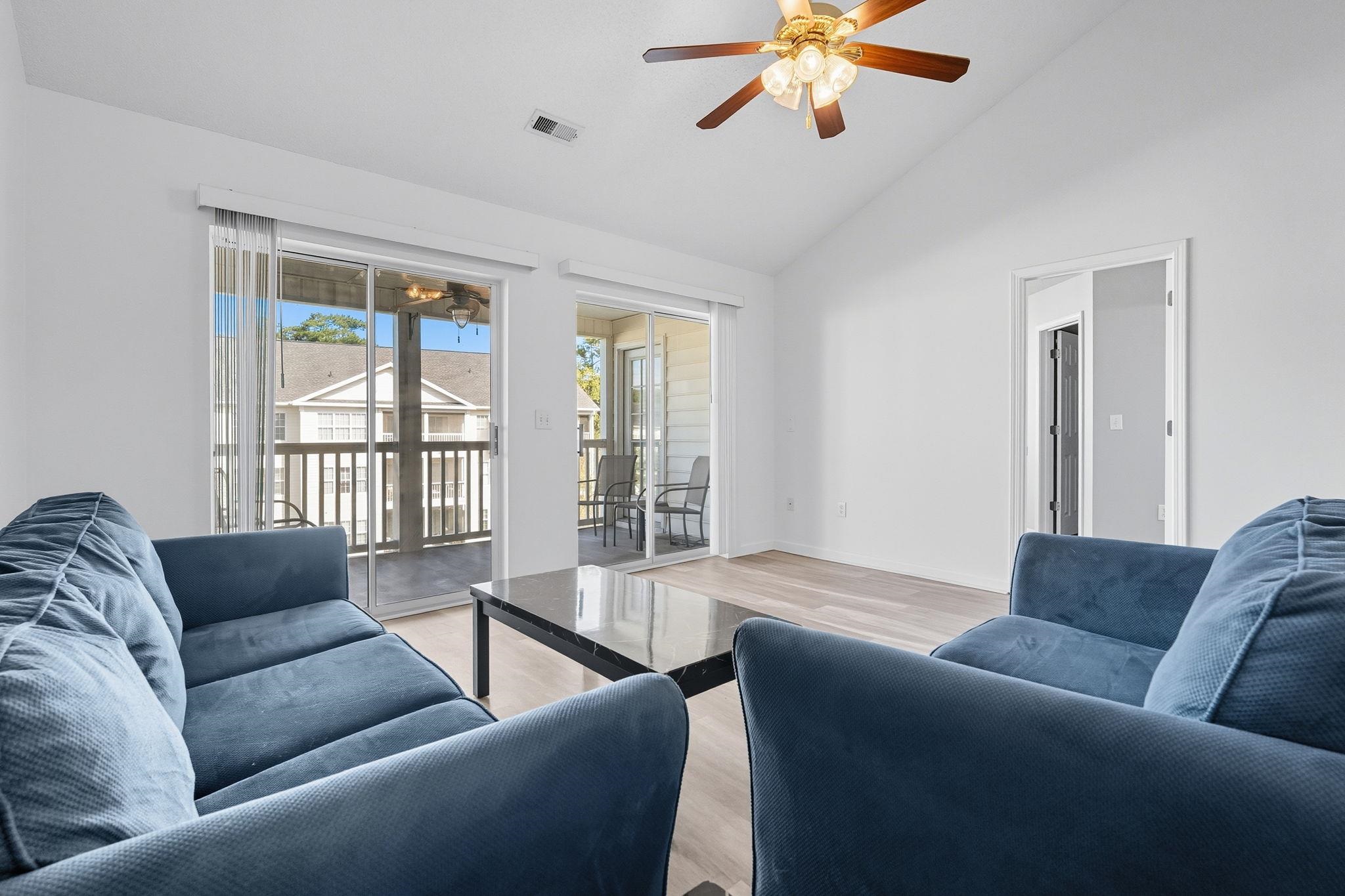 Sun-soaked living spaces and modern finishes make this 3-bed, 2-bath condo an exceptional coastal retreat. The spacious living and dining area features vaulted ceilings and flows seamlessly into the bright kitchen, complete with crisp white cabinetry and a convenient breakfast bar. Luxury vinyl plank flooring runs throughout the home for a clean, modern look, while tile adds durability in both bathrooms and the laundry room. The primary suite offers a relaxing retreat with a walk-in closet, private bath, and direct access to the balcony—perfect for enjoying morning coffee or evening breezes. Two additional bedrooms provide ideal space for guests or a home office. Step onto the open balcony and take in peaceful lake views that create a serene outdoor escape. Jasmine Lake presents a true coastal lifestyle with a community pool and clubhouse overlooking the water, and you’re just 1.2 miles from the beach. This prime location places you close to restaurants, medical facilities, Surfside and Garden City piers, golf courses, the MarshWalk, the airport, and all South Carolina state parks. Only 90 miles north of historic Charleston, this turnkey condo offers the perfect blend of comfort, convenience, and low-maintenance coastal living. Schedule your showing today and experience it for yourself. Measurements are not guaranteed. Buyer is responsible for verifying.