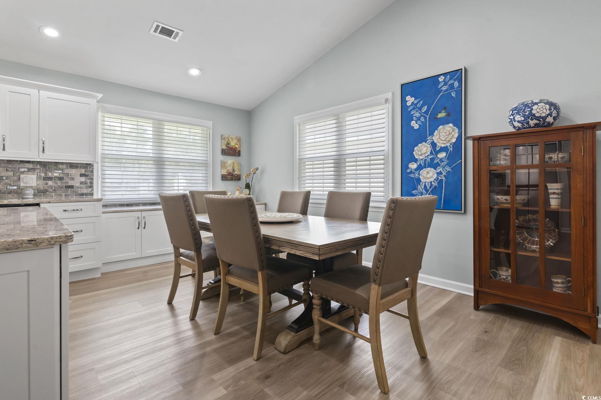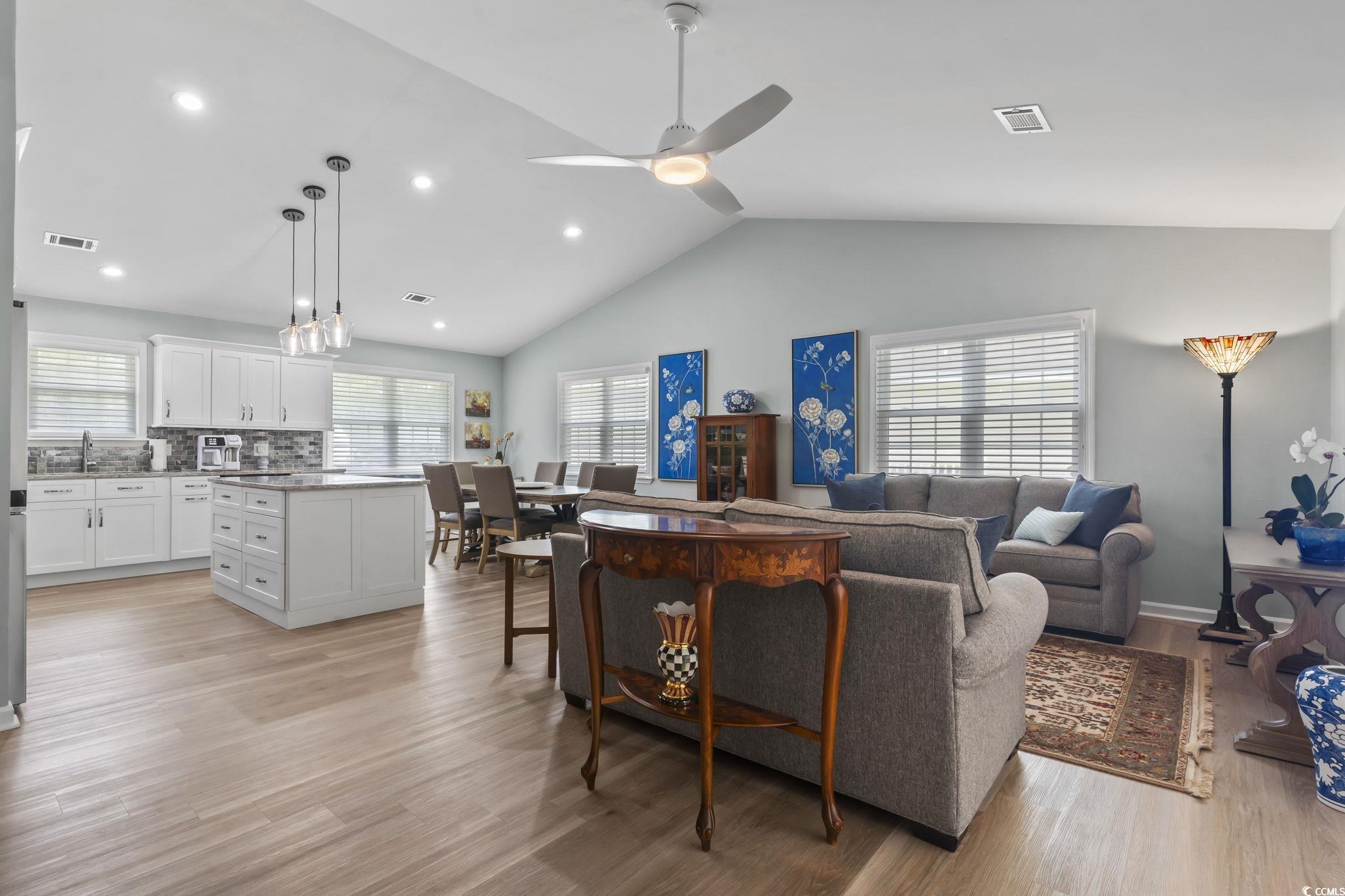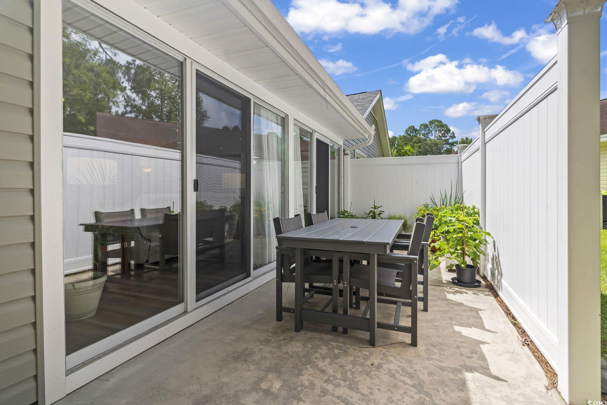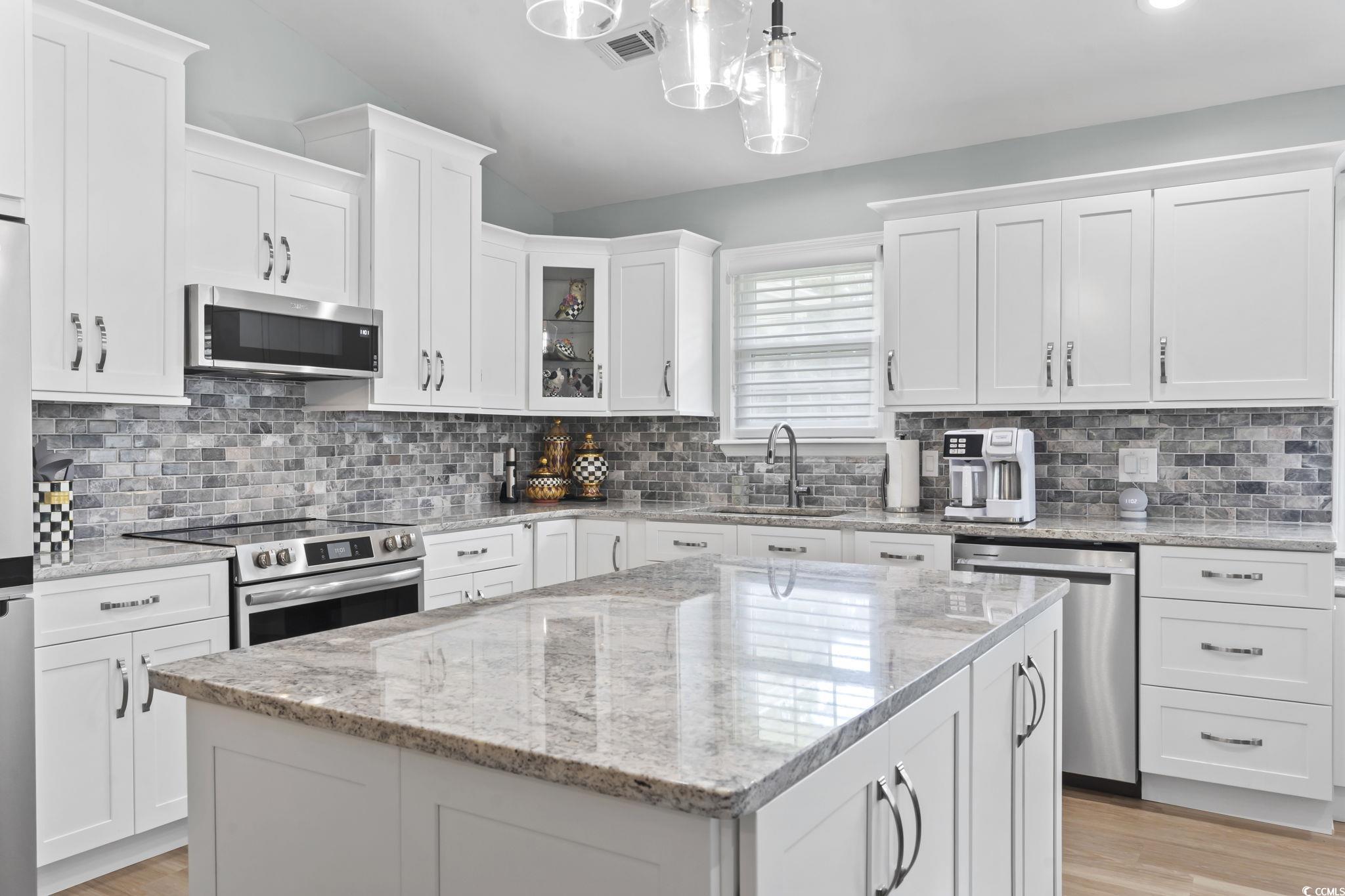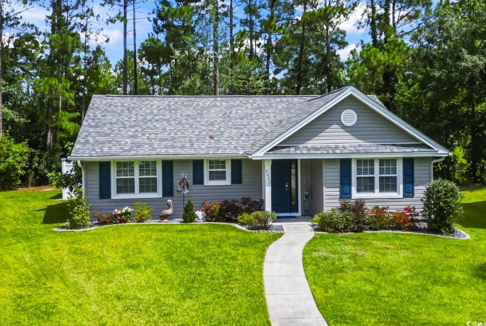 Nestled in a quiet cul-de-sac in Myrtle Beach Golf and Yacht Club, this beautiful three-bedroom, two-bath home features an open-floor plan, with a stunning kitchen and cathedral ceiling. The main living area flows into a 20’ x 20’ four-season Carolina room, where two walls of sliding glass doors offer a beautiful nature view of a park-like backyard that borders HOA-owned, dedicated “green” land. This home offers the benefit of extensive recent renovations, combined with an established neighborhood, mature trees and shrubs, and amenities including the security of a 24/7 staffed entry gate. Outside, premium vinyl siding, upgraded architectural roof shingles, and gutter guards were installed in 2023. A patio surrounds the full back of the home, providing a great place for outdoor entertaining. The built-in storage shed, with a handy utility sink and shelving, is accessed from the patio. The kitchen is stunning, and a chef’s delight. It was completely renovated in 2022 with quality-brand stainless-steel appliances, lots of functional cabinets, granite countertops, and a large island with built-in storage. The adjacent dining area features a built-in buffet server with storage. Luxury vinyl flooring was installed throughout the home in 2022, except for the tiled bathrooms. Both bathrooms have been recently updated, with new tile, vanities, granite counters, and fixtures. The primary bedroom suite is separate from the other two bedrooms, and offers a raised ceiling and en suite bath with a tiled, walk-in shower. The large walk-in closet features a custom closet system. The HVAC heat pump system was replaced in 2022, and the hot water heater in 2024. A full-capacity smart washer/dryer tower was installed in 2023, along with custom shelving. Major appliances, custom window treatments, and ceiling fixtures shown in the listing photos will come with the home. Owners’ other furnishings and electronics are not part of the sale, and have been changed since the photos were taken. Myrtle Beach Golf and Yacht Club is an established, gated community with lots of amenities, including a pool, hot tub, playground, picnic area, pavilion, clubhouse, and tennis and shuffleboard courts. There’s even the option of a separate storage area on premises for RVs and trailers through the HOA. Myrtle Beach Golf and Yacht is a short drive from the beautiful ocean beaches of the area, and a boat ramp for the Intracoastal Waterway is close by. Plus, it’s centrally located to take advantage of the many options for golfing, dining, entertainment, and shopping nearby in Myrtle Beach and surrounding communities!