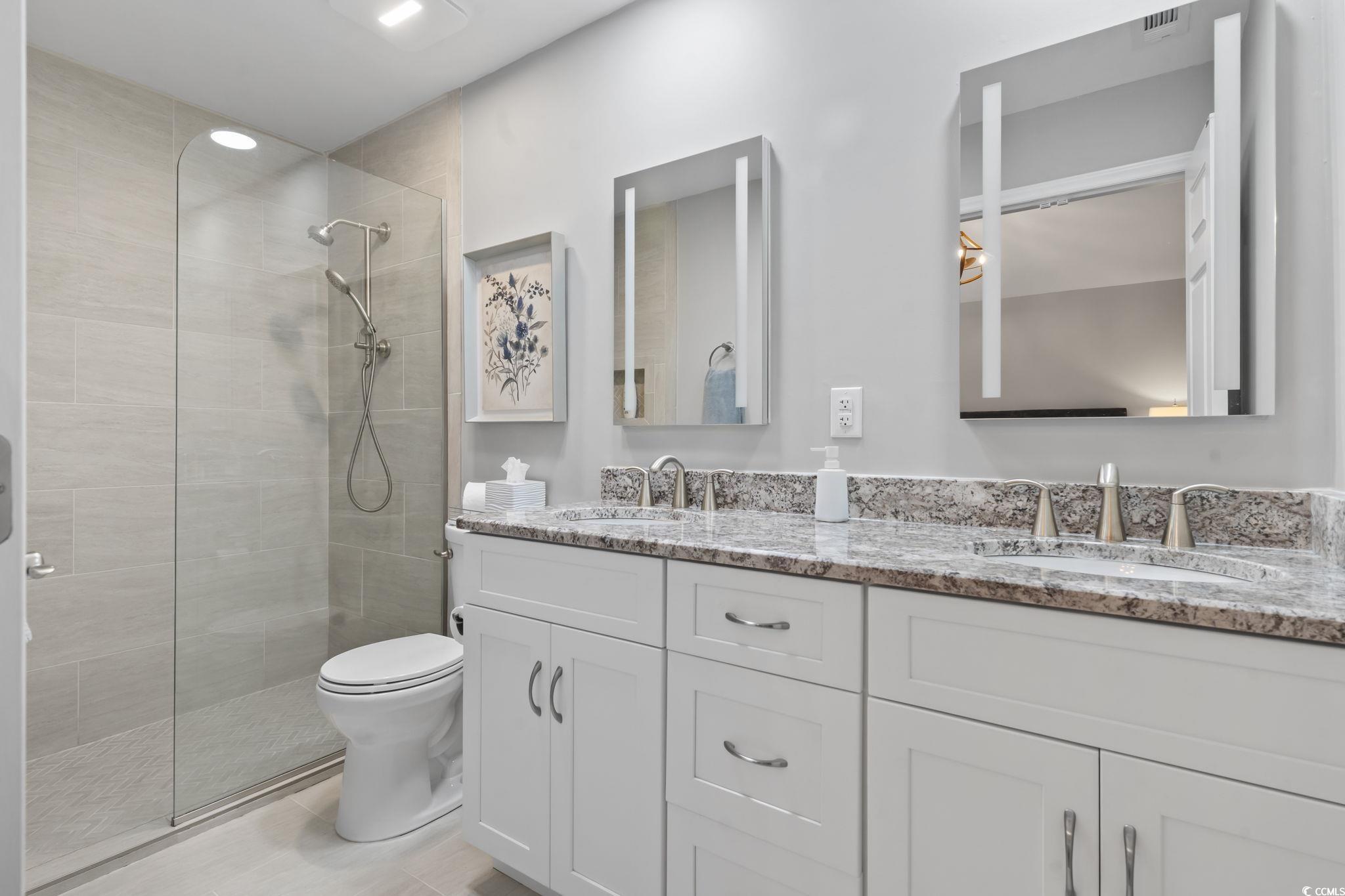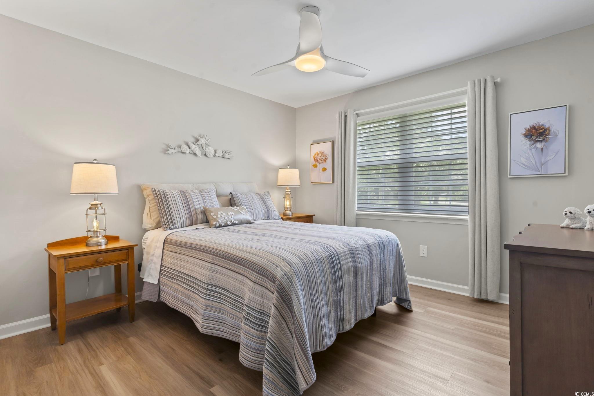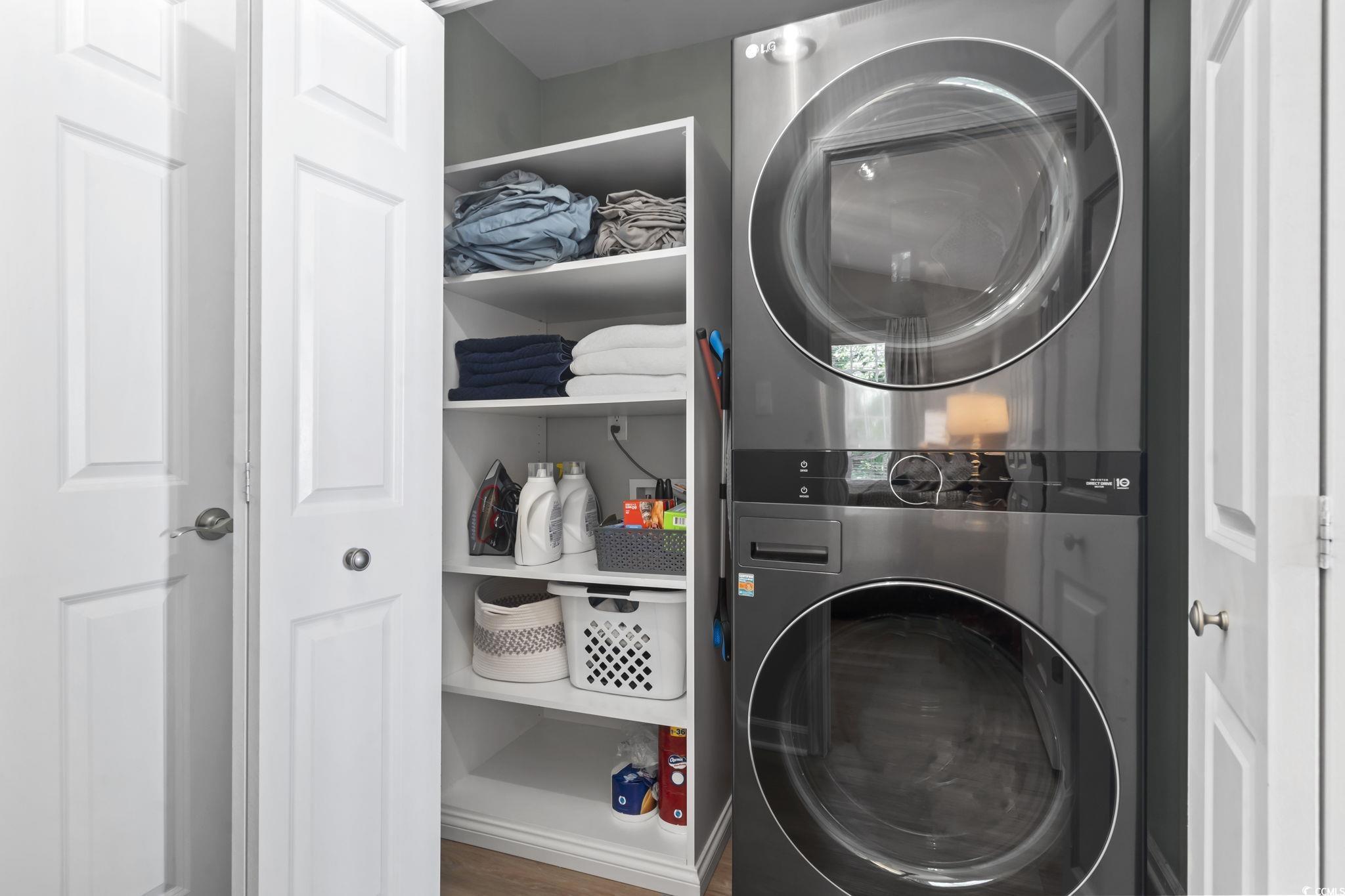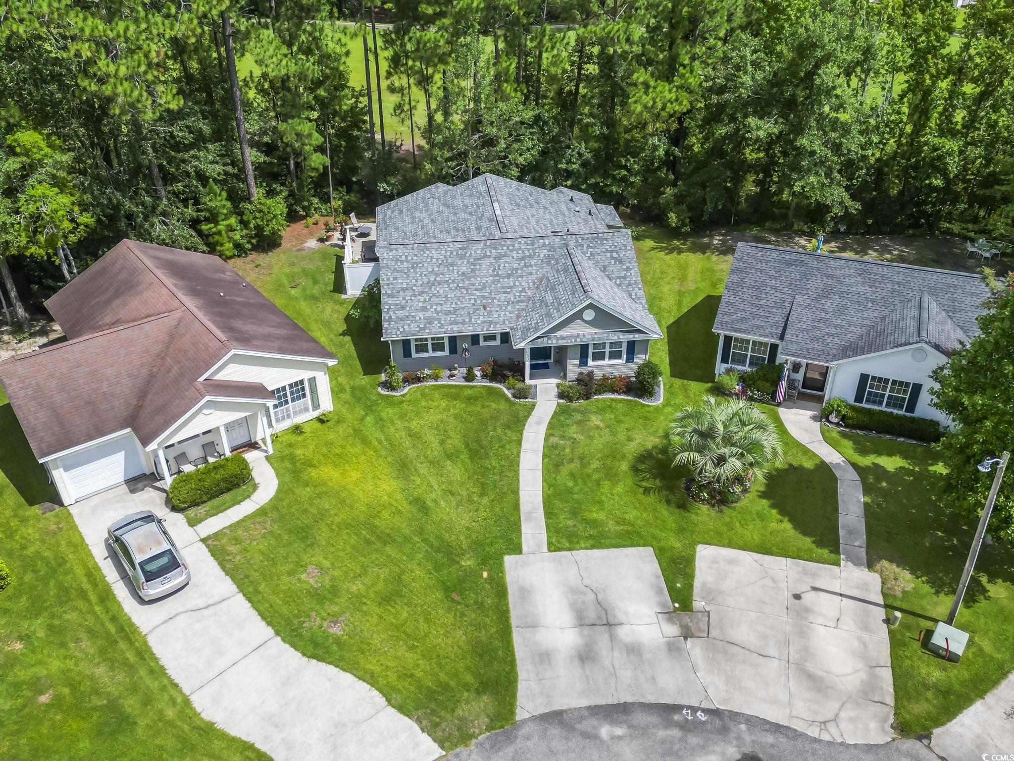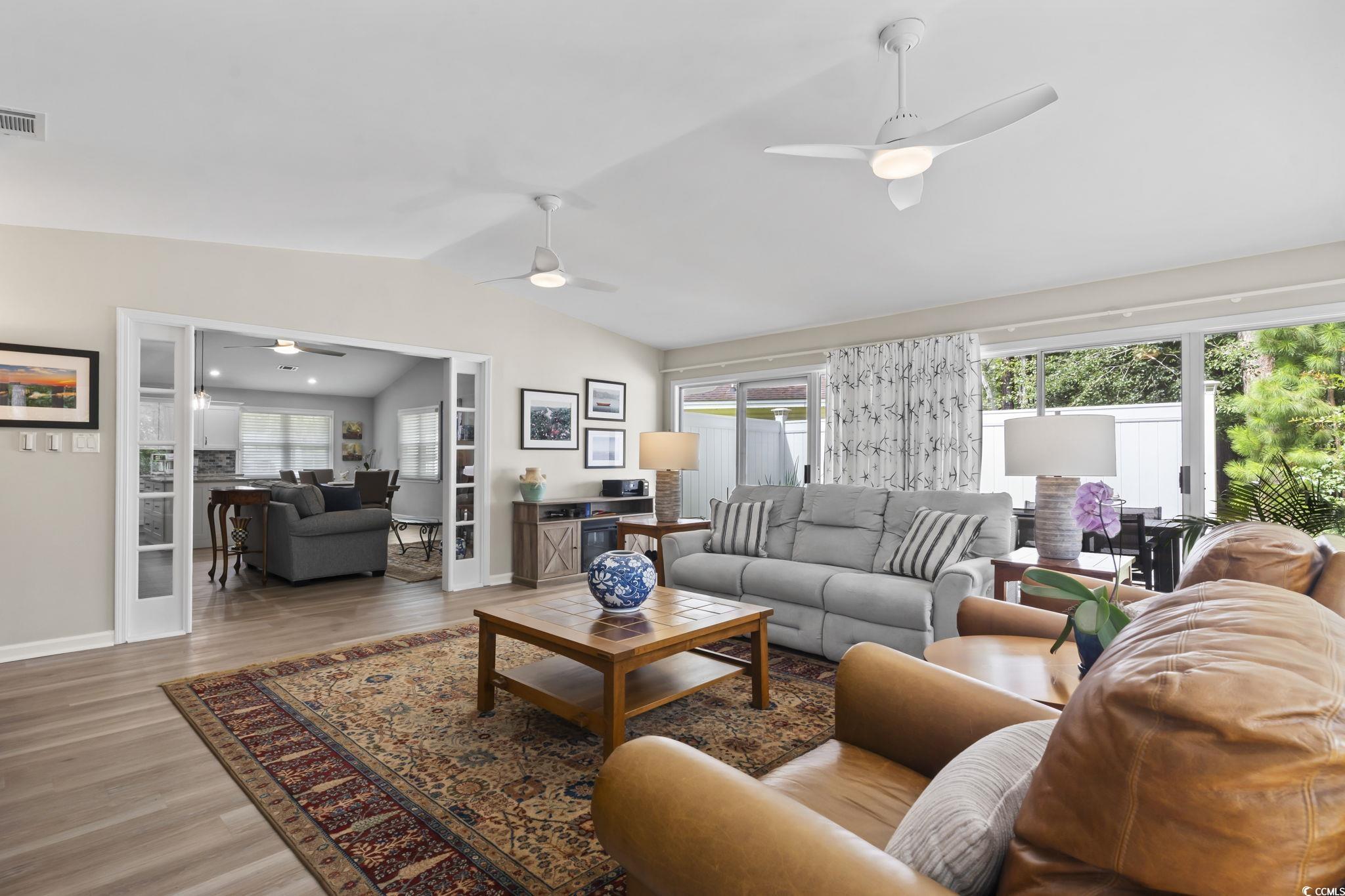 Nestled in a quiet cul-de-sac in Myrtle Beach Golf and Yacht Club, this beautiful three-bedroom, two-bath home features an open-floor plan, with a stunning kitchen and cathedral ceiling. The main living area flows into a 20’ x 20’ four-season Carolina room, where two walls of sliding glass doors offer a beautiful nature view of a park-like backyard that borders HOA-owned, dedicated “green” land. This home offers the benefit of extensive recent renovations, combined with an established neighborhood, mature trees and shrubs, and amenities including the security of a 24/7 staffed entry gate. Outside, premium vinyl siding, upgraded architectural roof shingles, and gutter guards were installed in 2023. A patio surrounds the full back of the home, providing a great place for outdoor entertaining. The built-in storage shed, with a handy utility sink and shelving, is accessed from the patio. The kitchen is stunning, and a chef’s delight. It was completely renovated in 2022 with quality-brand stainless-steel appliances, lots of functional cabinets, granite countertops, and a large island with built-in storage. The adjacent dining area features a built-in buffet server with storage. Luxury vinyl flooring was installed throughout the home in 2022, except for the tiled bathrooms. Both bathrooms have been recently updated, with new tile, vanities, granite counters, and fixtures. The primary bedroom suite is separate from the other two bedrooms, and offers a raised ceiling and en suite bath with a tiled, walk-in shower. The large walk-in closet features a custom closet system. The HVAC heat pump system was replaced in 2022, and the hot water heater in 2024. A full-capacity smart washer/dryer tower was installed in 2023, along with custom shelving. Major appliances, custom window treatments, and ceiling fixtures shown in the listing photos will come with the home. Owners’ other furnishings and electronics are not part of the sale, and have been changed since the photos were taken. Myrtle Beach Golf and Yacht Club is an established, gated community with lots of amenities, including a pool, hot tub, playground, picnic area, pavilion, clubhouse, and tennis and shuffleboard courts. There’s even the option of a separate storage area on premises for RVs and trailers through the HOA. Myrtle Beach Golf and Yacht is a short drive from the beautiful ocean beaches of the area, and a boat ramp for the Intracoastal Waterway is close by. Plus, it’s centrally located to take advantage of the many options for golfing, dining, entertainment, and shopping nearby in Myrtle Beach and surrounding communities!