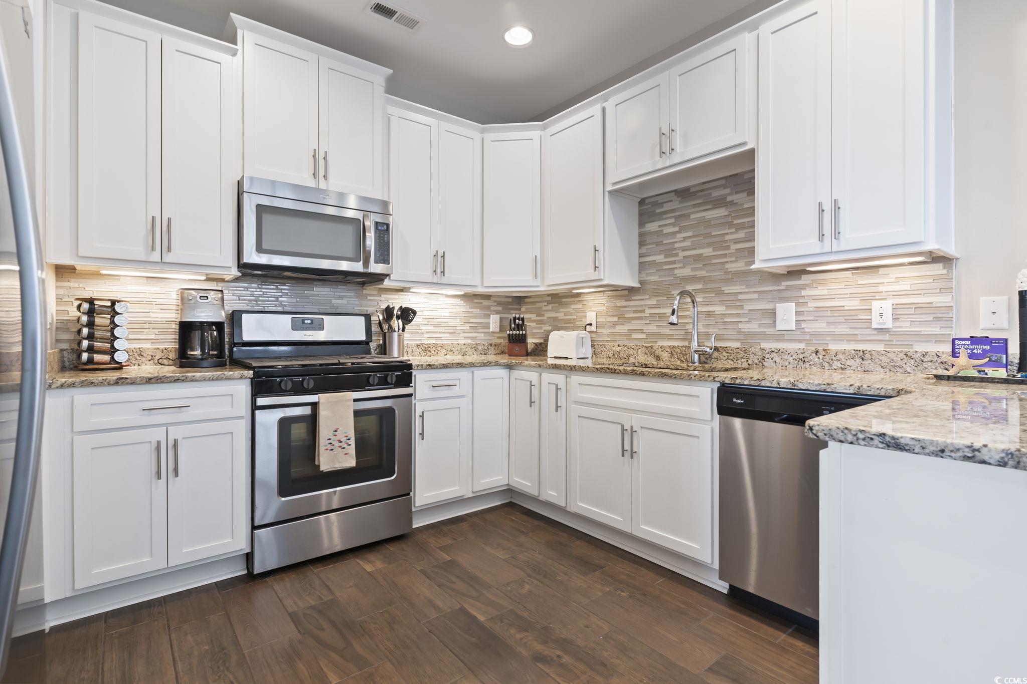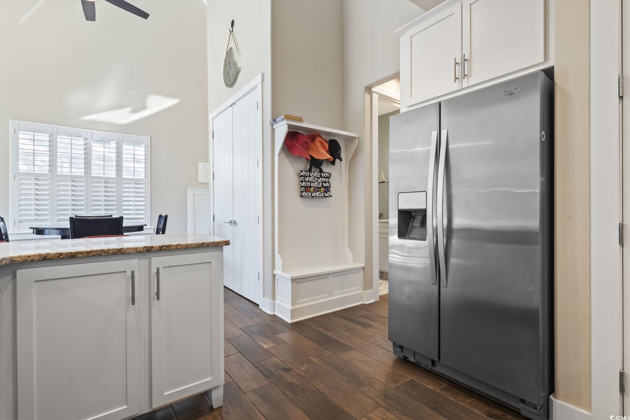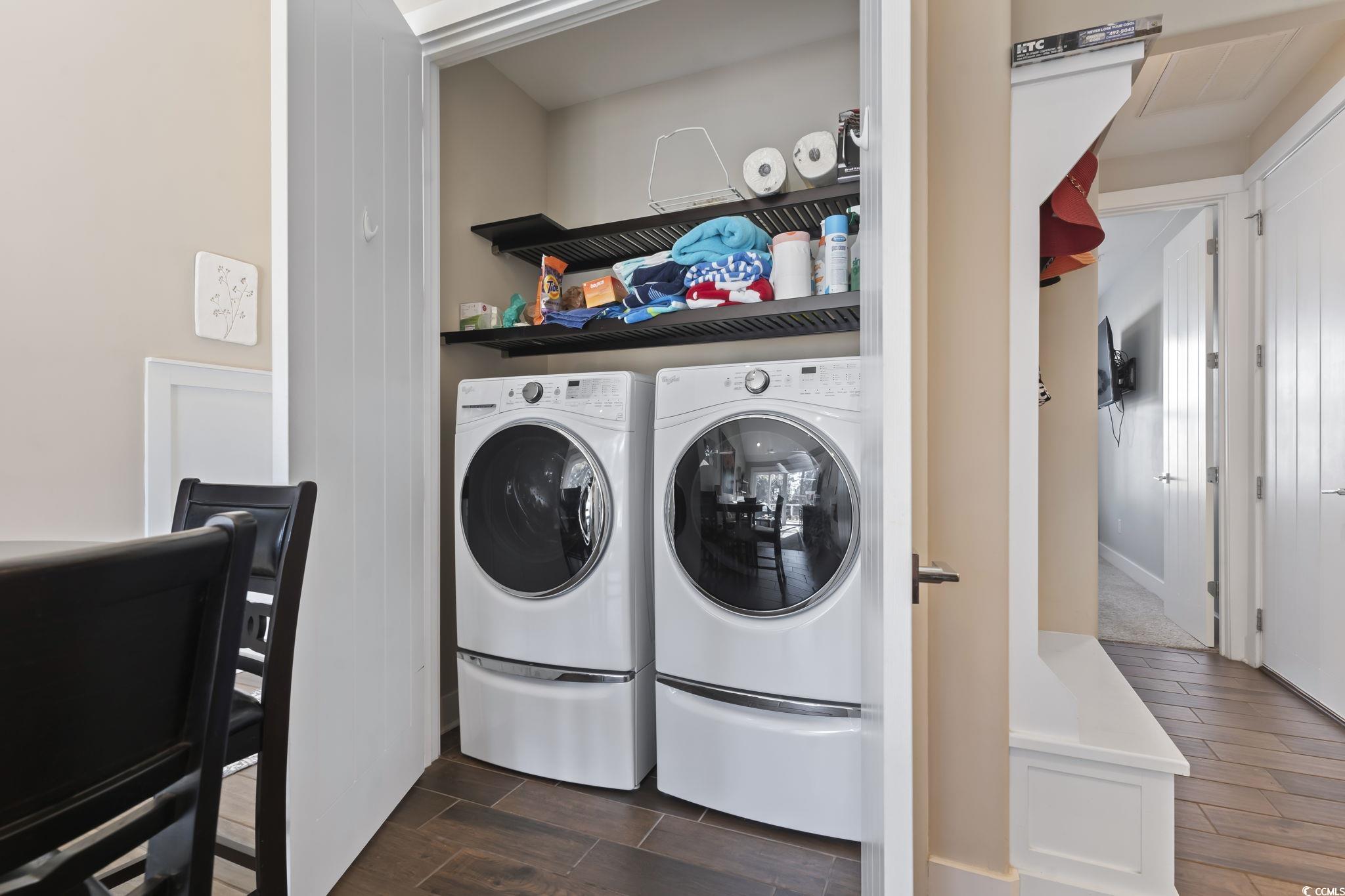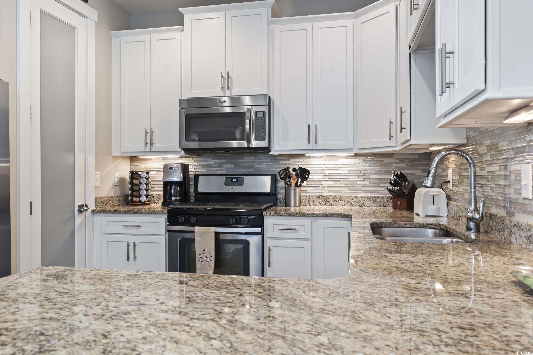 Welcome home to coastal luxury in a gated community that's just 650 yards from the Atlantic Ocean! This stunning home is one of just 8 exclusive properties in a private gated community, each one unique in its own way! Situated on a serene lake, it features a 27' x 10' treated wood deck with picturesque water views, as well as access to a community dock perfect for fishing or relaxing. The deck also has a custom remote controlled retractable awning that covers the entire back patio for shade. Inside, the first-floor master bedroom boasts elegant upgrades, including a tray ceiling, crown molding throughout, and a custom-tiled walk-in shower with bench seat in the master bath. The home also offers high-end finishes such as plantation shutters, soaring cathedral ceilings in the living area, custom closet shelving, and 42” wall cabinets in the kitchen. The kitchen is spacious and complemented by stainless steel appliances including a gas range, beautiful tiled backsplash, and luxurious granite countertops. The living room lets in tons of natural light with an oversized sliding glass door that overlooks the lake, enjoy the ease of remote controlled blinds to cover the door or raise them up to take in the views. As a BONUS, upstairs you will find a versatile LOFT space that can be used as a second living area, office, game room, extra sleeping quarters, or a cozy retreat for relaxation. The options are endless! A garage with epoxy flooring and pull down attic storage is great for all of your storage needs. Landscaping is included in the HOA fee for low maintenance ease of living. This move-in-ready home, just steps away from the beach and close to restaurants, shopping, dining and more, won’t last long—schedule your showing today before it’s gone!