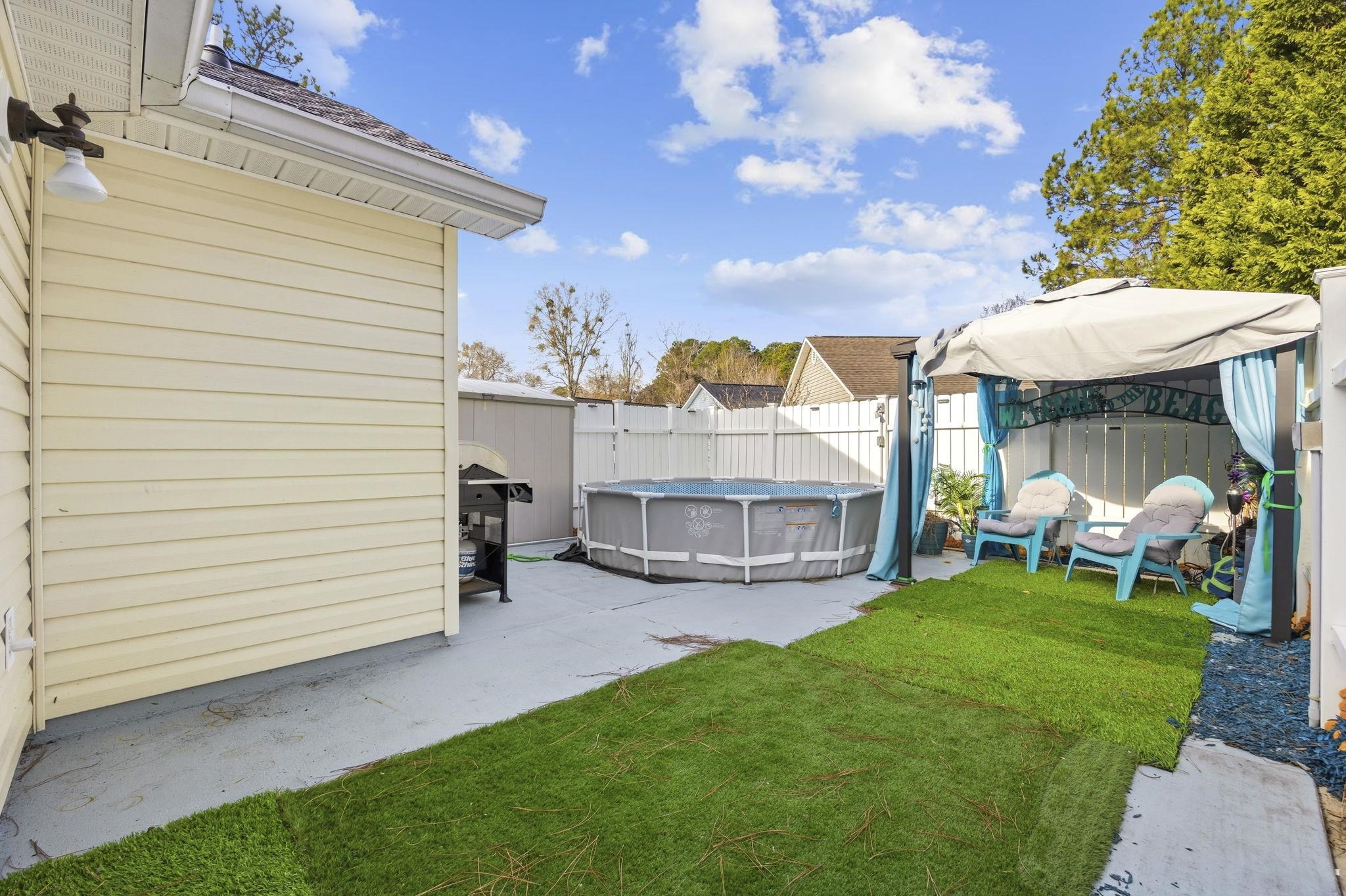 Welcome to Myrtle Beach Golf & Yacht, a highly desirable gated community offering 24-hour security, a clubhouse, and a community pool. This charming 3-bedroom, 2-bath detached home welcomes you with an open and airy feel, plenty of windows, and abundant natural light throughout. Just off the main living area, the primary suite offers a comfortable retreat featuring an ensuite bath with a double vanity, providing both privacy and convenience. Step into the living room with vaulted ceilings, creating a bright and inviting space that flows seamlessly into the eat-in kitchen. The kitchen is equipped with a breakfast bar, stainless steel refrigerator and microwave, and ample room for casual dining or entertaining. Etched glass sliding doors lead from the living area out to the private back patio, featuring low-maintenance artificial turf, ideal for relaxing or hosting outdoor gatherings. A detached storage shed provides convenient extra space for outdoor storage. Two additional bedrooms share a second full bath, and a dedicated laundry room complete with washer and dryer adds everyday convenience. The single-car garage provides additional storage and functionality. Residents of Myrtle Beach Golf & Yacht enjoy resort-style amenities including tennis courts, a basketball court, shuffleboard courts, horseshoe pits, a children’s play area, a pavilion, and an RV lot. All of this is set in a peaceful location just minutes from shopping, dining, and the beach.