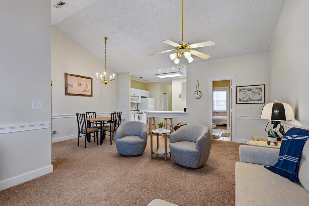 An exceptional opportunity awaits in the highly desirable Riverwalk community, beautifully located along the Intracoastal Waterway and overlooking the serene Arrowhead Golf Course. This furnished third-floor condo offers 1 bedroom and 1½ baths, ready for immediate enjoyment. Relax on your private balcony and take in the sights as golfers make their way down the fairway toward the 5th green of the Cypress Course, with a partial view of one of the community pools as well. The spacious great room is ideal for enjoying the peaceful surroundings and features vaulted ceilings and updated furnishings. Sliding glass doors in the dining area lead directly to the balcony, enhancing indoor-outdoor living. The open kitchen overlooks the main living space and includes a full appliance package and breakfast bar. The primary bedroom also boasts a vaulted ceiling, while the ensuite bath features a tub/shower combination and a convenient stacked washer and dryer. A half bath is thoughtfully included for guests. Riverwalk is one of the few Grand Strand communities offering an indoor heated pool, along with two outdoor pools and a recently updated fitness center. The low HOA fee covers water and sewer, basic cable, property insurance, and all amenities. Priced to sell, this condo is a fantastic value in a prime location.