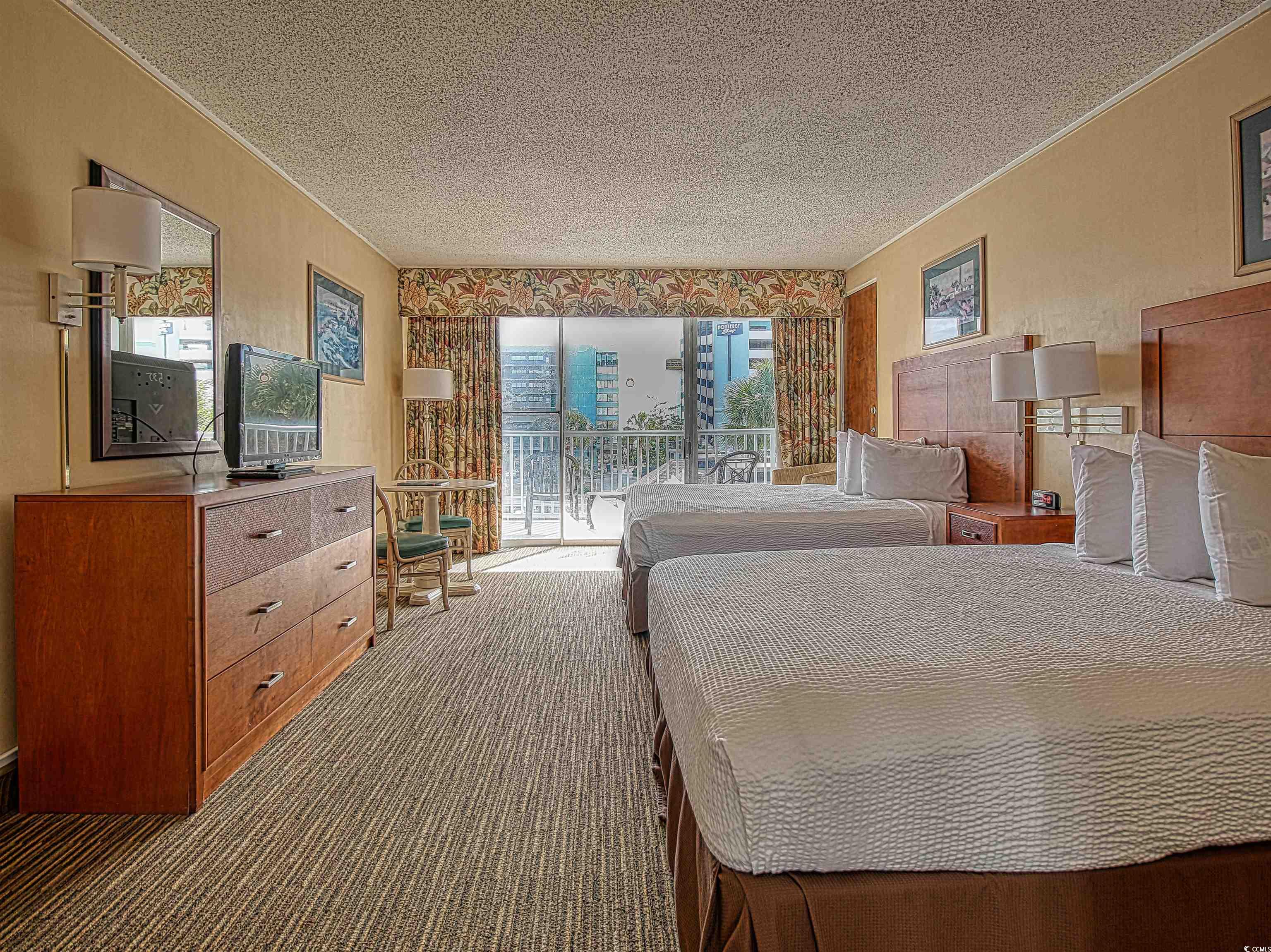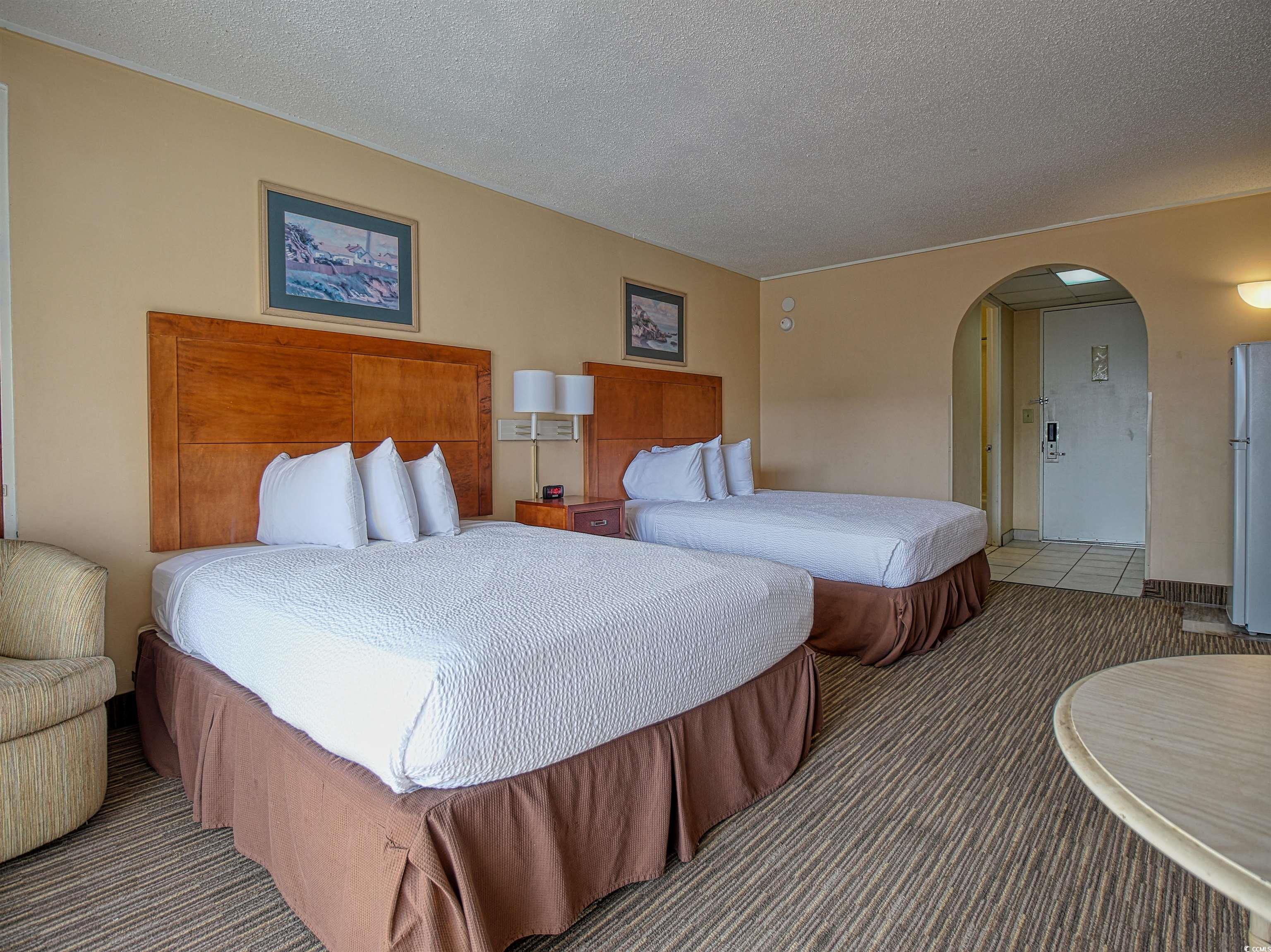 Coastal comfort meets convenience in this beautifully appointed efficiency unit. Enjoy a private balcony with views of the courtyard pool and hot tub, just steps from the ocean for easy beach days. Inside, two queen beds provide a restful night’s sleep, while a functional kitchenette—featuring a sink, coffee maker, cooktop, microwave, and refrigerator—takes care of quick meals and snacks. Located in a prime spot near shopping, golf, dining, and nightlife, this inviting suite offers the perfect blend of relaxation and accessibility for an unforgettable coastal getaway.