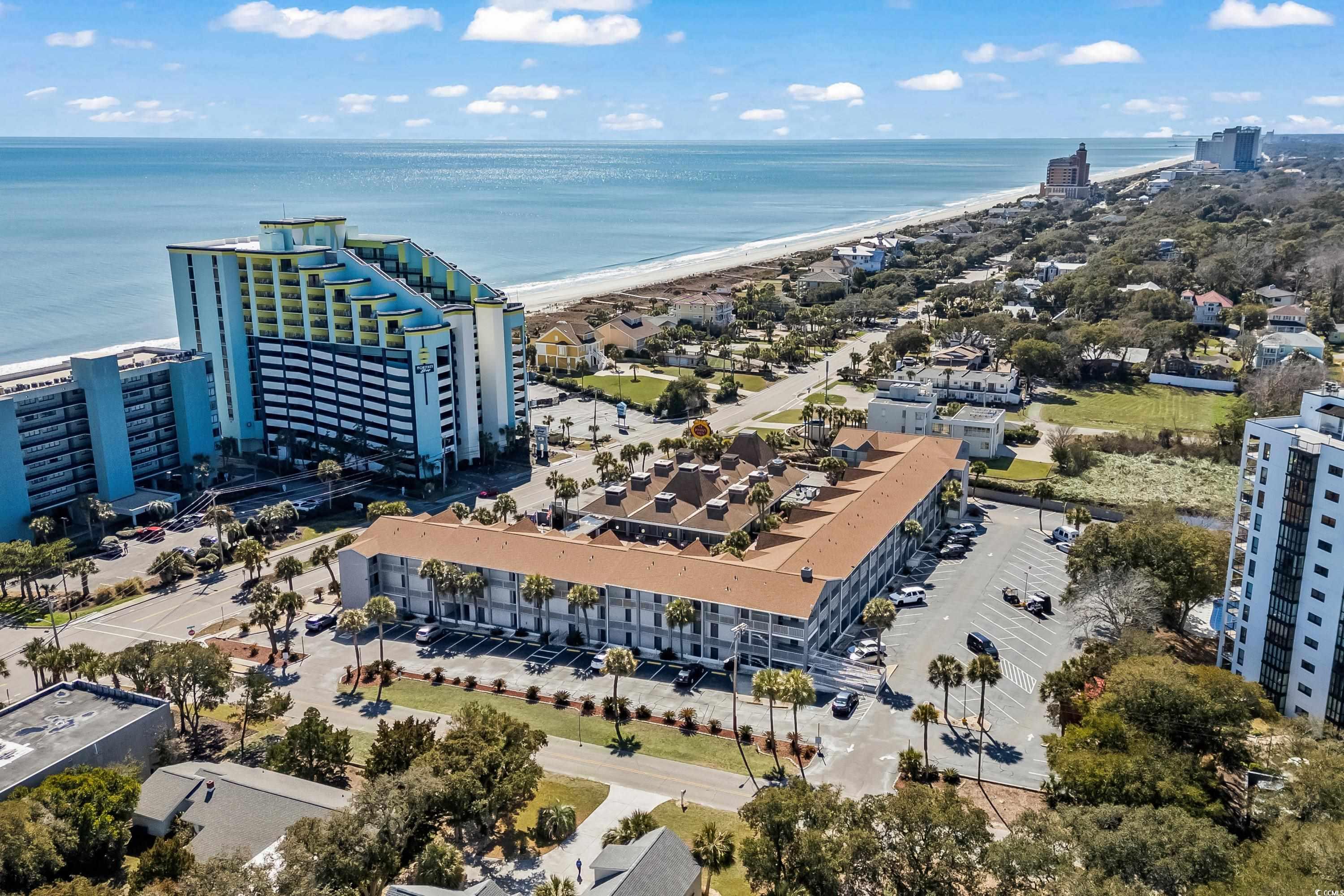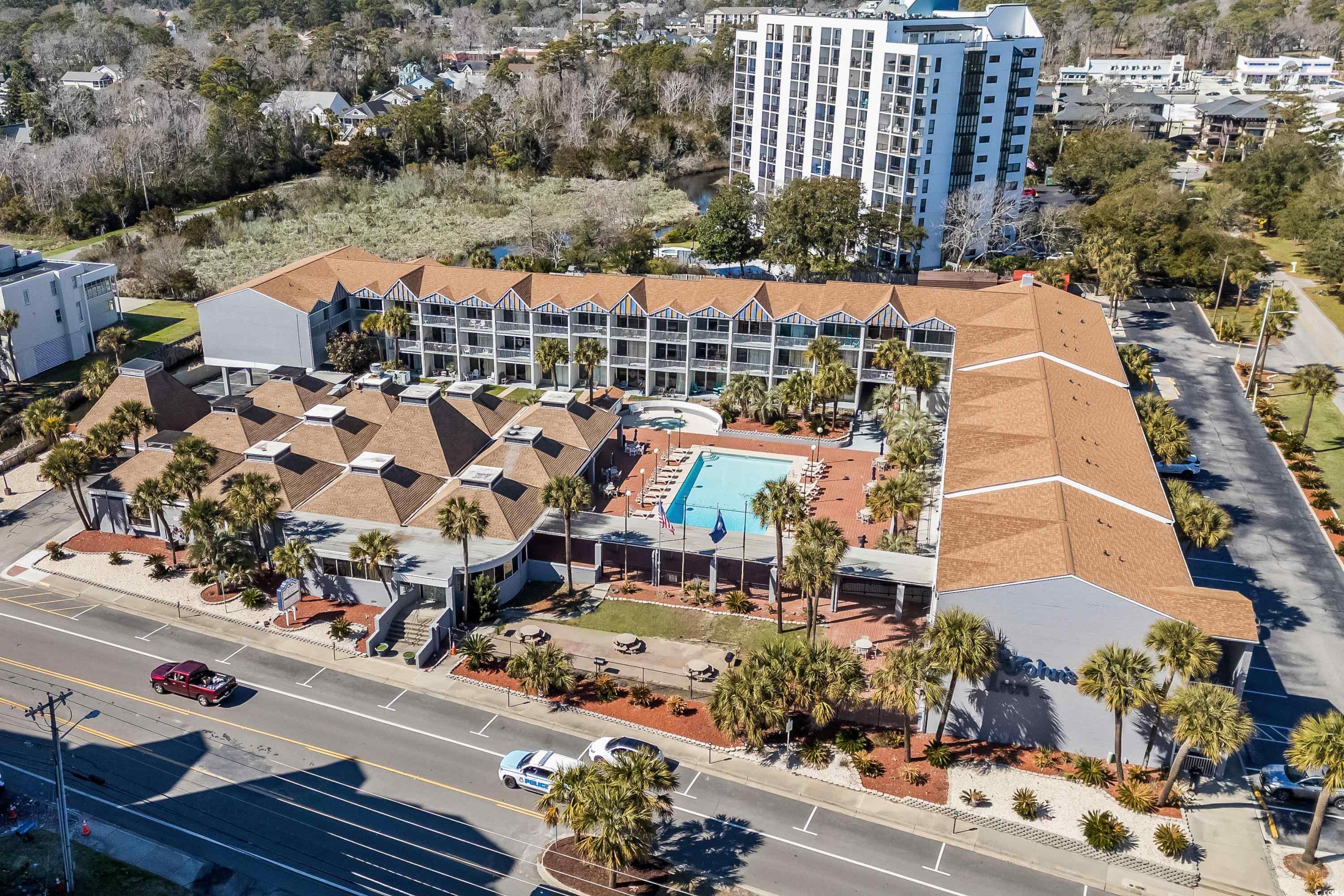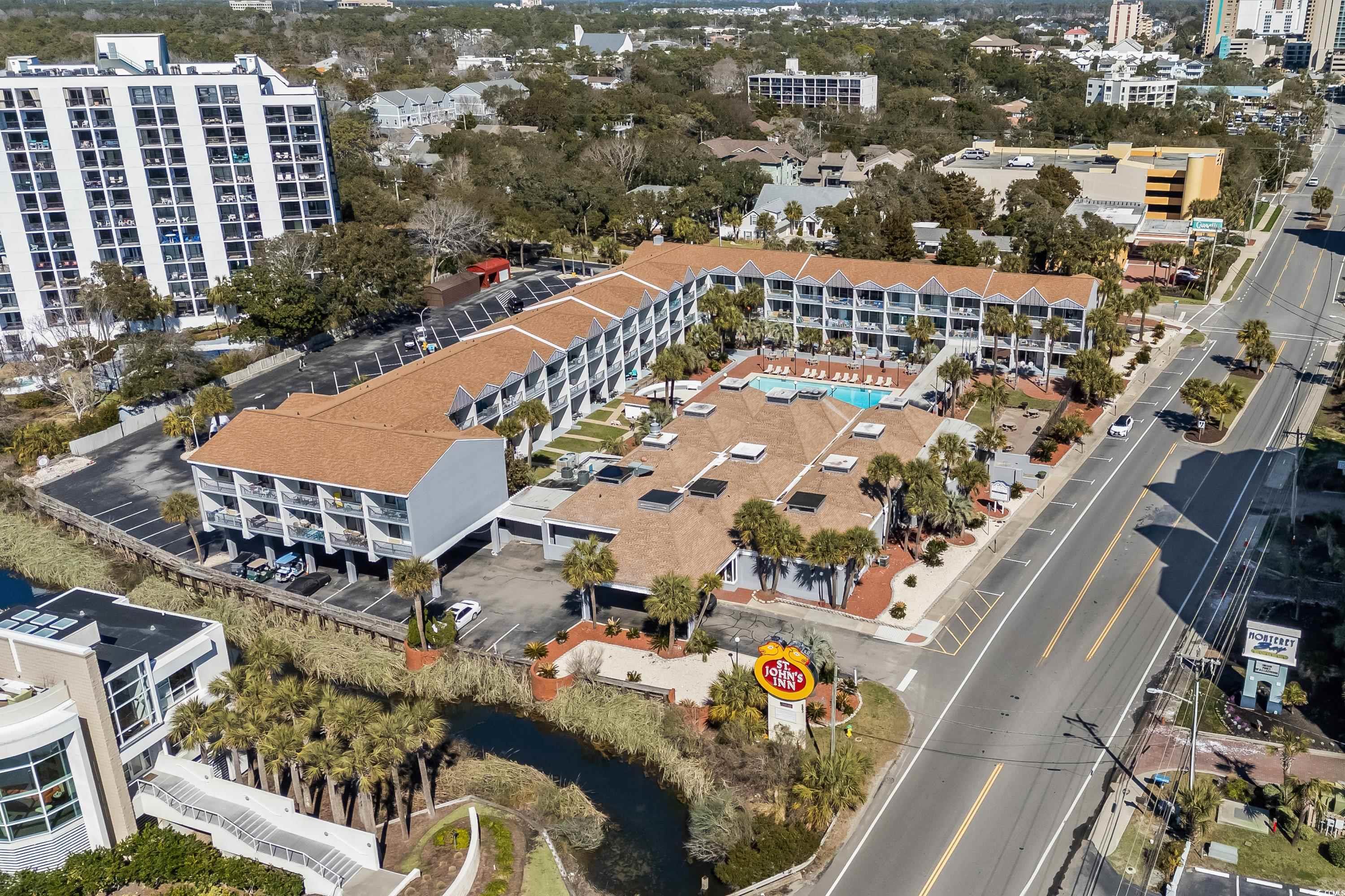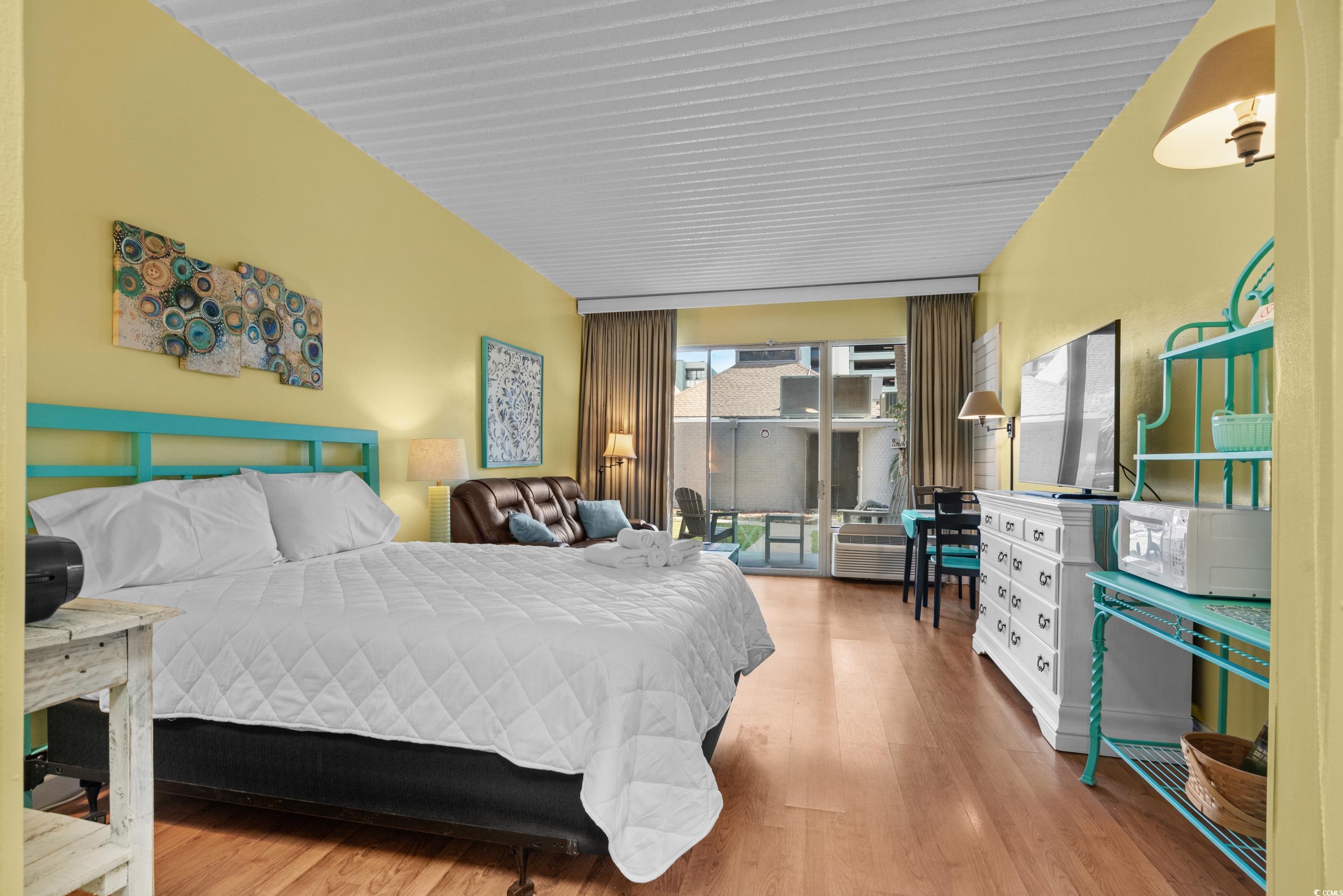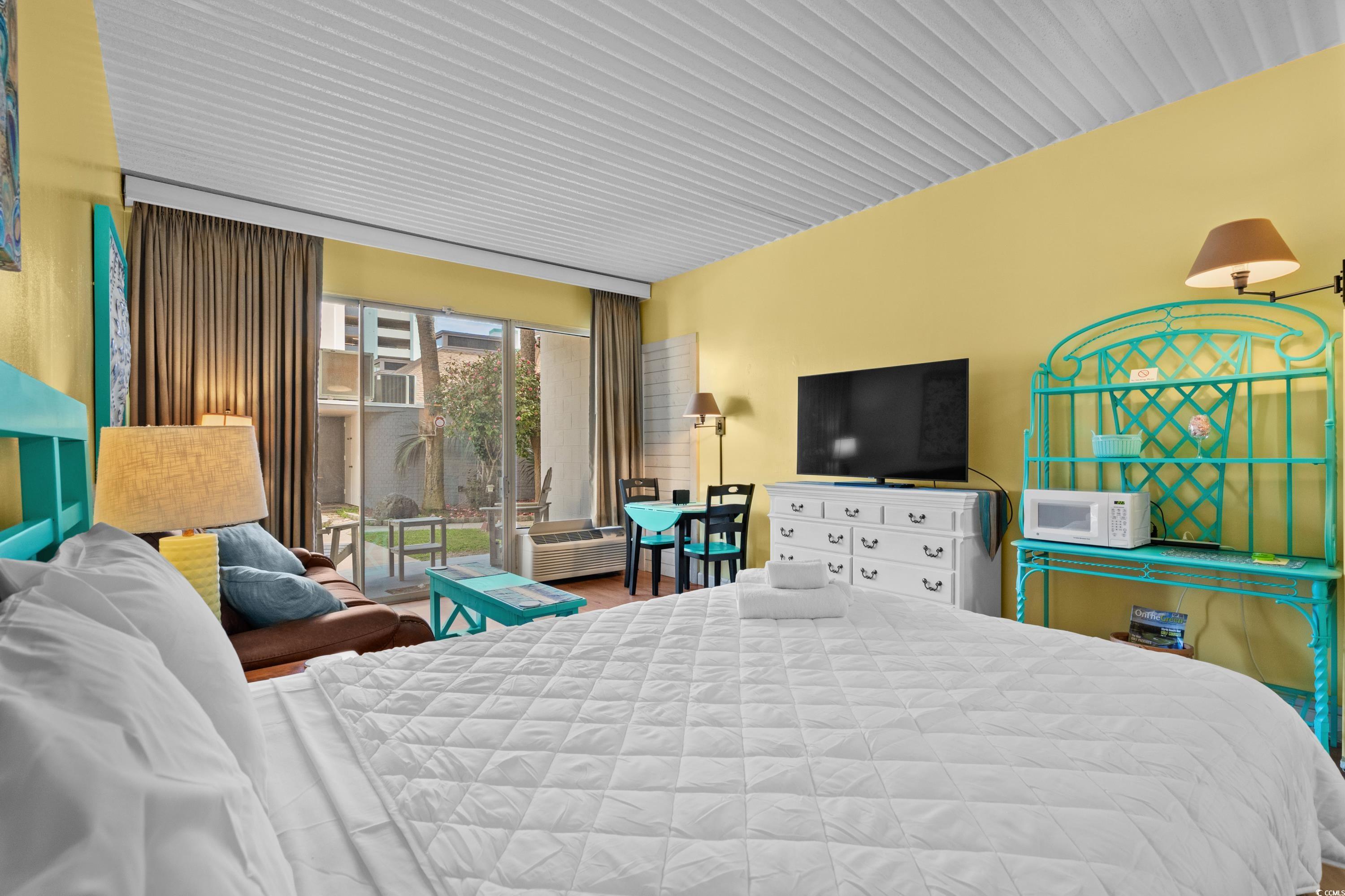 Nestled in the nostalgic charm of St. John’s Inn, this beautifully renovated first-floor efficiency condo offers the perfect blend of comfort and coastal relaxation. Just steps from the shimmering shores, this beachside retreat is designed for effortless living and unwinding. Inside, LVP and tile floors create a cool, breezy feel underfoot, while the thoughtfully equipped kitchenette—featuring a two-burner cooktop, microwave, refrigerator, and coffee maker—has everything you need for easy meals and morning coffee before hitting the beach. The cozy leather sofa and two-person dinette provide the perfect space to kick back, while the plush king bed ensures restful nights after sun-soaked days. Step out onto the covered back patio to enjoy the salty breeze with your favorite drink in hand. Or, take a dip in the gorgeous swimming pool and lounge on the sun deck, soaking up the laid-back Myrtle Beach vibes. Plus, with a convenient on-site laundry room, extended stays are a breeze. With St. John’s Inn having just undergone a total renovation, this charming coastal hideaway is ready for you to move in, unwind, and make memories by the sea!