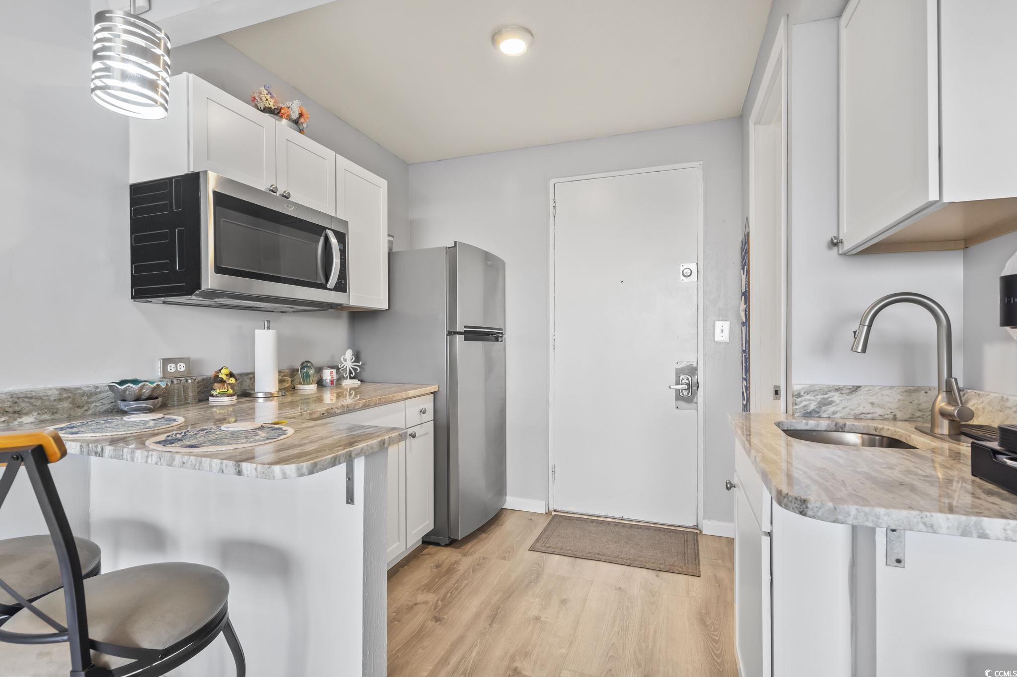 Great location second row condo. Newly refurbished complex with improvements. Unit has been upgraded with new flooring, cabinetry, quartz countertops, Stainless steel appliances and furnishings. As part of the complex renovation, this unit has a new balcony and railings overlooking the pool with view of ocean and amazing sunsets. One of the best views from complex. Walk across street to ocean and golf carts are permitted. The complex features an elevator, large pool, sun deck, hot tub and a grilling/picnic table area. HOA fee included all utilities electric, water/sewer and cable/internet Conveniently located north of Golden Mile close to airport, shopping, dining, medical and entertainment. Square footage is approximate and not guaranteed. Buyer responsible for verification.