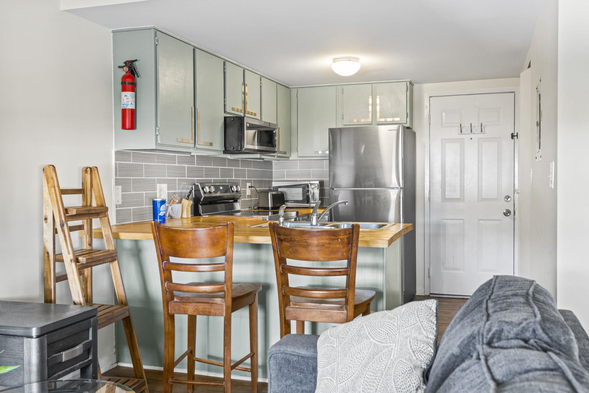 Updated 2nd-floor efficiency condo in gated Myrtle Beach Golf & Yacht Club! Looking for a low-maintenance condo close to the beach with security and amenities? This updated efficiency condo on the second floor of the Savannah Building is located in the Myrtle Beach Golf & Yacht Club, a gated Myrtle Beach community known for its peaceful setting and convenient location. It's a great option for buyers searching for an affordable primary residence, second home, or investment property near the coast. Step inside and enjoy a bright, open living space with luxury vinyl plank flooring throughout and two large windows that bring in plenty of natural light. The updated full kitchen features a butcher block countertop, breakfast bar, stainless steel appliances, tiled backsplash, and freshly painted cabinetry, creating a clean and functional space for everyday living. The layout feels comfortable and efficient, with room to relax, dine, and unwind after a day at the beach. The ensuite bathroom has been updated with a modern vanity and a tub/shower combination, offering both style and practicality. Living here feels calm and easy, with quiet mornings, soft natural light, and a sense of privacy provided by the second-floor location. Myrtle Beach Golf & Yacht Club is a gated community with 24-hour security and offers residents access to amenities including an outdoor community pool, tennis courts, laundry facilities, and more. The location is convenient to shopping, dining, entertainment, golf courses, and major roadways, with a quick drive to the Atlantic Ocean and area beaches. Whether you're looking for a simple coastal retreat or a full-time home near everything Myrtle Beach has to offer, this updated efficiency condo delivers comfort, convenience, and a relaxed coastal lifestyle in a secure community. Measurements are not guaranteed. Buyer is responsible for verifying.