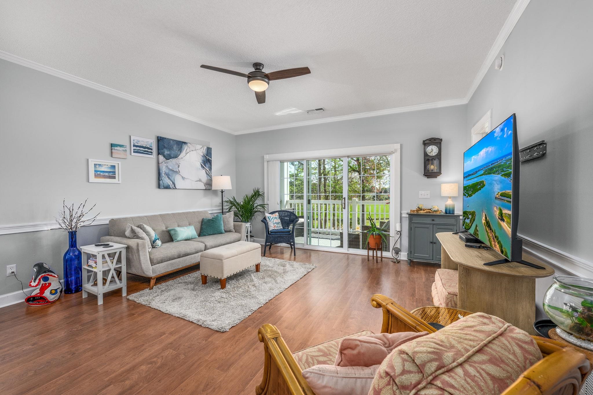 Immaculately updated and ideally positioned, this 2-bedroom, 2-bath end-unit condo in Riverwalk offers a rare combination of privacy, natural light, and stunning views. The unique angle of the building provides picturesque vistas of the golf course, pond, and pool, creating a serene and scenic backdrop from nearly every room. Inside, the condo features durable LVP flooring throughout the main living areas and newer carpet in the bedrooms for added comfort. Expansive windows fill the space with natural light, enhancing the open and airy feel. The kitchen is well-appointed with a stainless steel stove, new refrigerator, tiled countertops, and a spacious breakfast bar, perfect for casual dining or entertaining. The open-concept living and dining areas flow seamlessly, with sliding glass doors leading to an oversized balcony complete with attached storage and breathtaking views. The primary suite also enjoys direct balcony access, along with a walk-in closet and private en-suite bath. The secondary bedroom is thoughtfully positioned at the front of the condo, offering privacy and convenient access to the second bathroom. Located just steps from the pool, this unit provides easy access to Riverwalk's resort-style amenities, including indoor and outdoor pools and a fitness center. Conveniently situated near Myrtle Beach International Airport, premier golf courses, shopping, dining, and entertainment, this move-in-ready condo is perfect as a primary residence, vacation retreat, or investment opportunity. Be sure to ask you agent about the lender credit being offered on this property.