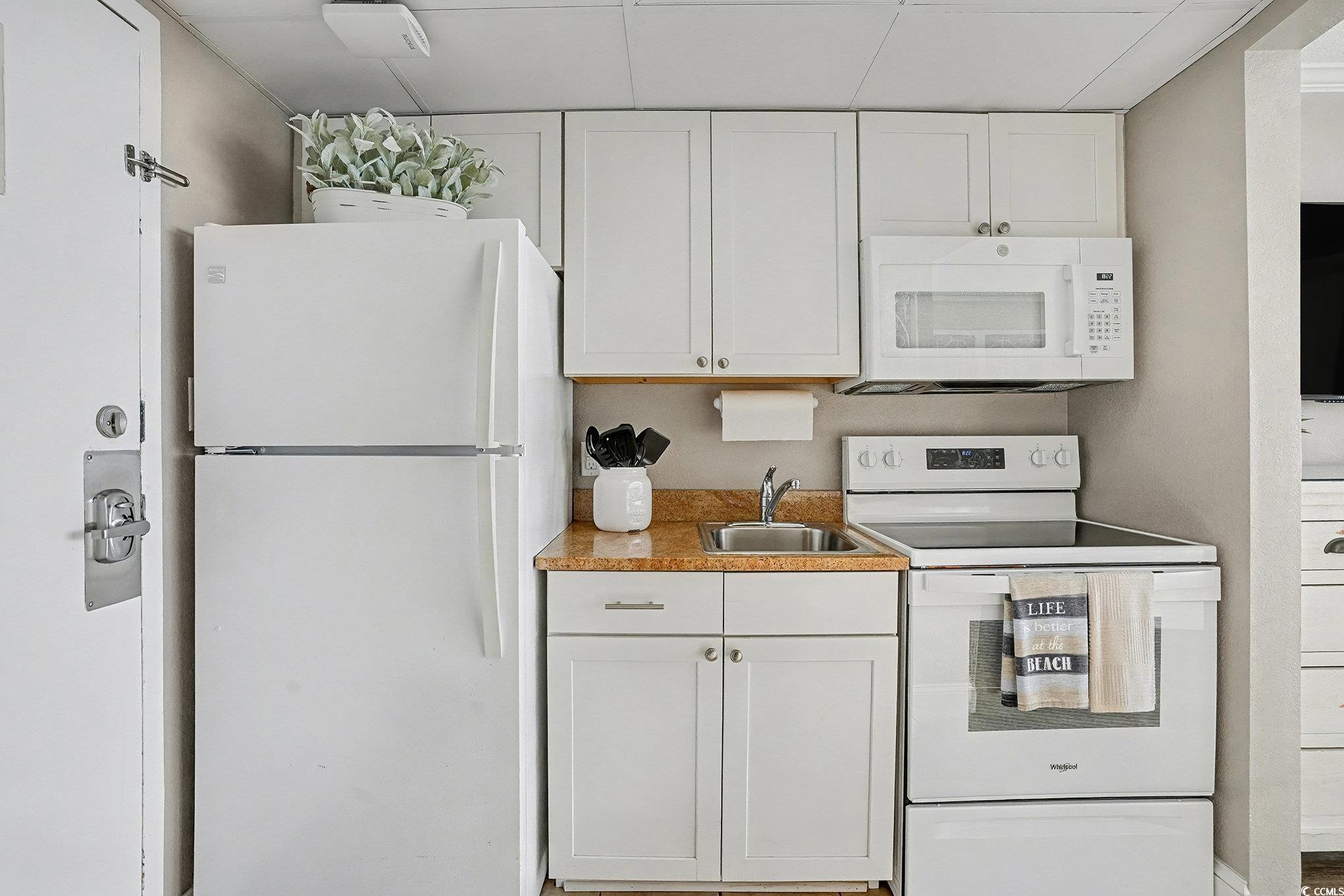 Wake up to the sound of the ocean and step into your own slice of coastal paradise, this beautifully updated efficiency unit at the highly sought-after Caravelle Resort offers both an ideal full-time residence or a personal vacation getaway, giving you flexibility without compromise. It's an excellent option for anyone looking to relocate and embrace true coastal living. Boasting a spacious oceanfront balcony with stunning views, this charming retreat features tile flooring in the kitchen and bath, granite countertops, crown molding, a fully equipped kitchen with a new stove and microwave, refrigerator, oven, and ample cabinet space, plus a new HVAC system for comfort year-round. The bedroom/living area is thoughtfully furnished with a flat-screen TV, queen platform bed, twin sleeper sofa, and a tasteful dining table with chairs, perfect for relaxing while taking in the breathtaking scenery. The full bath includes a vanity and tub/shower combo, and the private balcony provides the perfect backdrop for morning coffee, evening cocktails, or peaceful downtime with the ocean as your constant companion. Caravelle Resort elevates the experience with incredible amenities including indoor and outdoor pools, a lazy river, hot tub, kiddie pool, fitness room, game room, laundromat, gift shop, Marco Polo pool bar and grill, Pirates Cove ice cream and sandwich shop, and the onsite Santa Maria Restaurant. Situated in the heart of Myrtle Beach and close to shopping, dining, golf, and entertainment, this unit truly stands out as the perfect coastal retreat, whether you're seeking a smart investment or your own beachfront escape.
