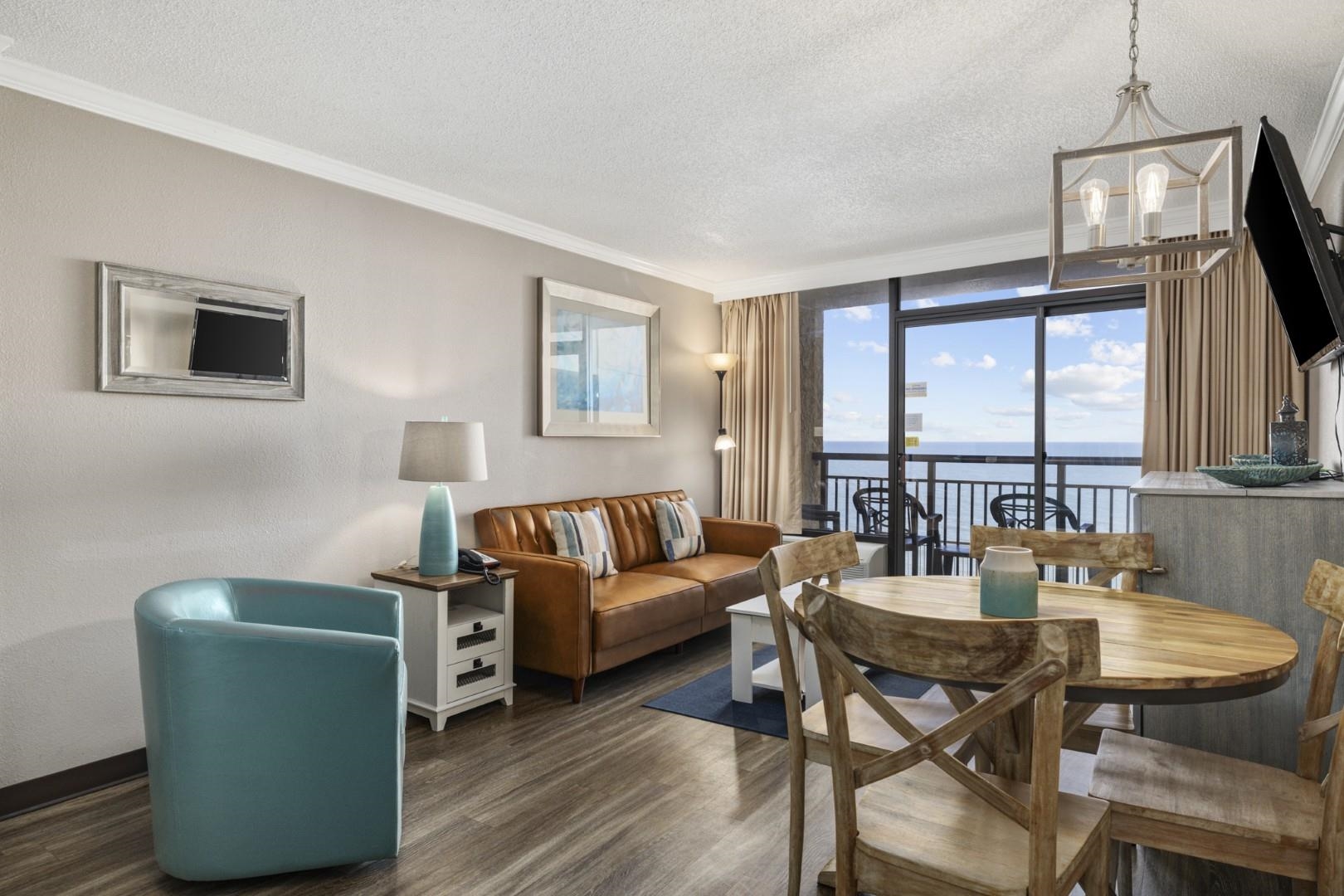 This bright and beautiful 1 bedroom, 1 bath oceanfront condo is ideally located along the Golden Mile at the Caravelle Resort, offering unbeatable ocean views from the living room and private balcony through floor-to-ceiling sliding doors. Top features include direct oceanfront positioning, a private balcony, abundant natural light, and vinyl plank flooring throughout the living areas with tile in the kitchen and bath. Additional highlights include a kitchen with granite countertops and ample cabinet space, a bedroom furnished with a king bed, a Murphy bed in the living room, and a bath with a granite vanity and tub/shower combo. Located in the Caravelle Resort along the Golden Mile, owners enjoy direct beach access and outstanding amenities including indoor and outdoor pools, a water park, lazy river, hot tubs, fitness center, arcade, dining options, and more?making this a great primary residence, vacation getaway, or investment property just minutes from shopping, dining, golf, and entertainment.