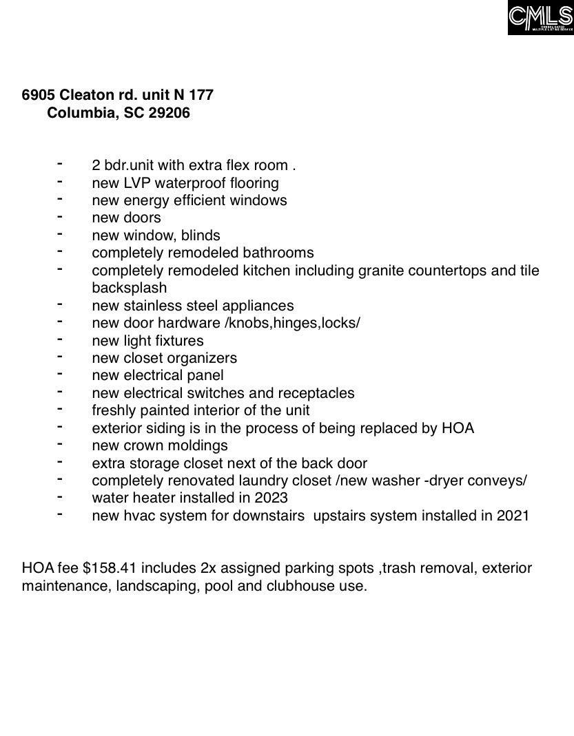 Motivated Seller!Stop renting and start building equity with this exceptional, fully renovated end-unit townhouse offering 2 bedrooms plus a versatile bonus room and 1.5 updated bathrooms—move-in ready and packed with upgrades.Enjoy fresh interior paint, crown molding, brand-new waterproof LVP flooring, new blinds, and energy-efficient windows that flood the home with natural light. The renovated kitchen features granite countertops, tile backsplash, and all-new stainless steel appliances (refrigerator conveys). Both bathrooms have been completely updated with modern finishes.Major improvements include new light fixtures, interior doors, hardware, closet organizers, locks, hinges, a fully renovated laundry closet (washer and dryer convey), and a new electrical panel with updated switches and receptacles. Mechanical systems have also been addressed with a new downstairs HVAC (2025), upstairs system from 2021, and a water heater replaced in 2023.Additional highlights include an exterior storage closet just outside the back door and two assigned parking spaces. The HOA fee of $158.80/month includes exterior maintenance, landscaping, trash removal, community pool, clubhouse, and lake access.Quietly located in a peaceful corner of the community, this turnkey home offers outstanding value and low-maintenance living. Schedule your showing today—this one won’t last. Disclaimer: CMLS has not reviewed and, therefore, does not endorse vendors who may appear in listings.