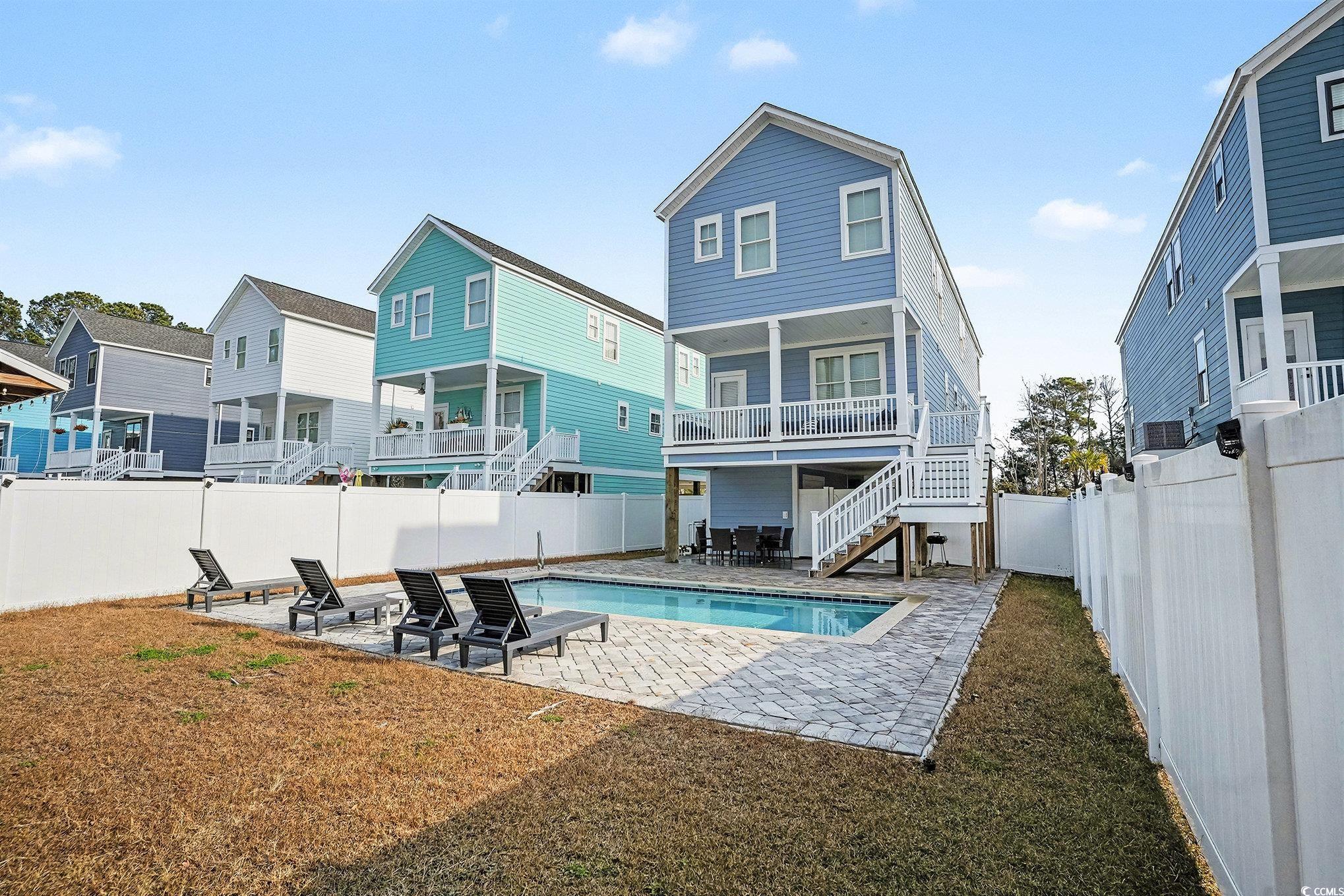 This beautifully appointed, fully furnished, 5 bedroom, 5.5 bath, raised beach home features an elevator, a private pool, comfortably sleeps 16 and is only .4/mile to the beaches of Garden City. Built in 2023 this coastal beauty has picturesque views of the marsh with glimpses of the ocean just over the horizon. This attractive, modern beach home is situated perfectly for Seaside living, whether as a primary residence, a second home vacation retreat or a turn-key investment property. Each bedroom features its own private en-suite bathroom complete with granite counter tops and tile floors, ensuring maximum comfort, convenience and privacy for all. The large primary bedroom contains a king bed, its own private covered balcony overlooking the marsh of Garden City, as well as a walk-in tiled shower, double vanity and a generous walk-in closet. The fully equipped kitchen includes granite counter tops, a farmhouse-style sink, abundant cabinetry and stainless-steel appliances making it ideal for entertaining and everyday living. Also Included are six large screen smart TV’s (75” in Living room, 55” in each bedroom) and Samsung Washer and Dryer. The convenient elevator services all three levels which helps with both groceries and luggage. The back yard is fully fenced and along with the tropical palm trees surrounds the private pool creating a perfect space for family gatherings and outdoor enjoyment. Short term rentals are allowed, and the home is not in an HOA. Attached are rental projections from a local property management company based on actual 2025 rental numbers they achieved at a neighboring home with an identical layout, this highlights the strong income potential of this exceptional property. Close to great restaurants, shops, fishing, wonderful entertainment and only 1 block to the Sanford D. Cox community park