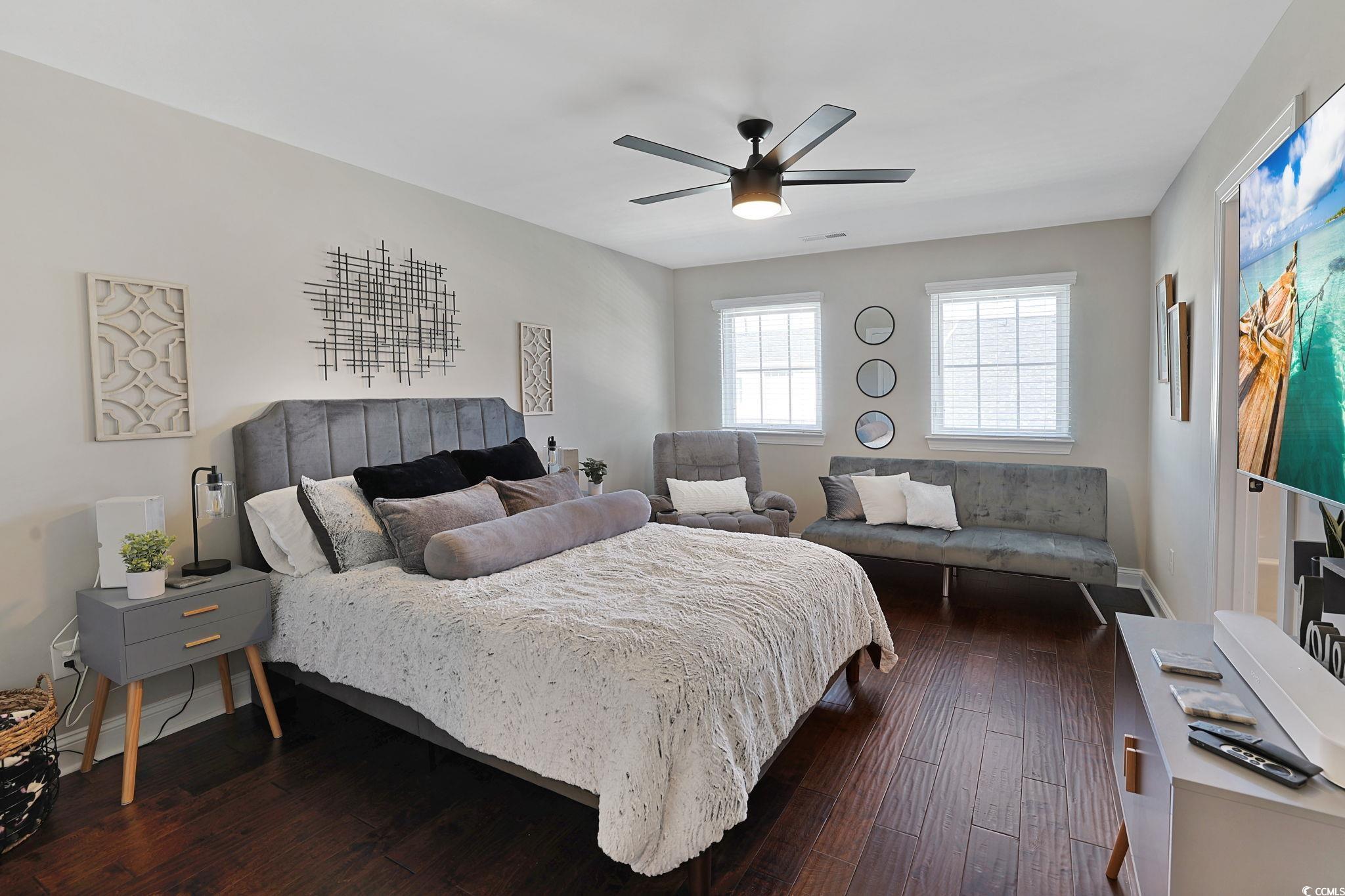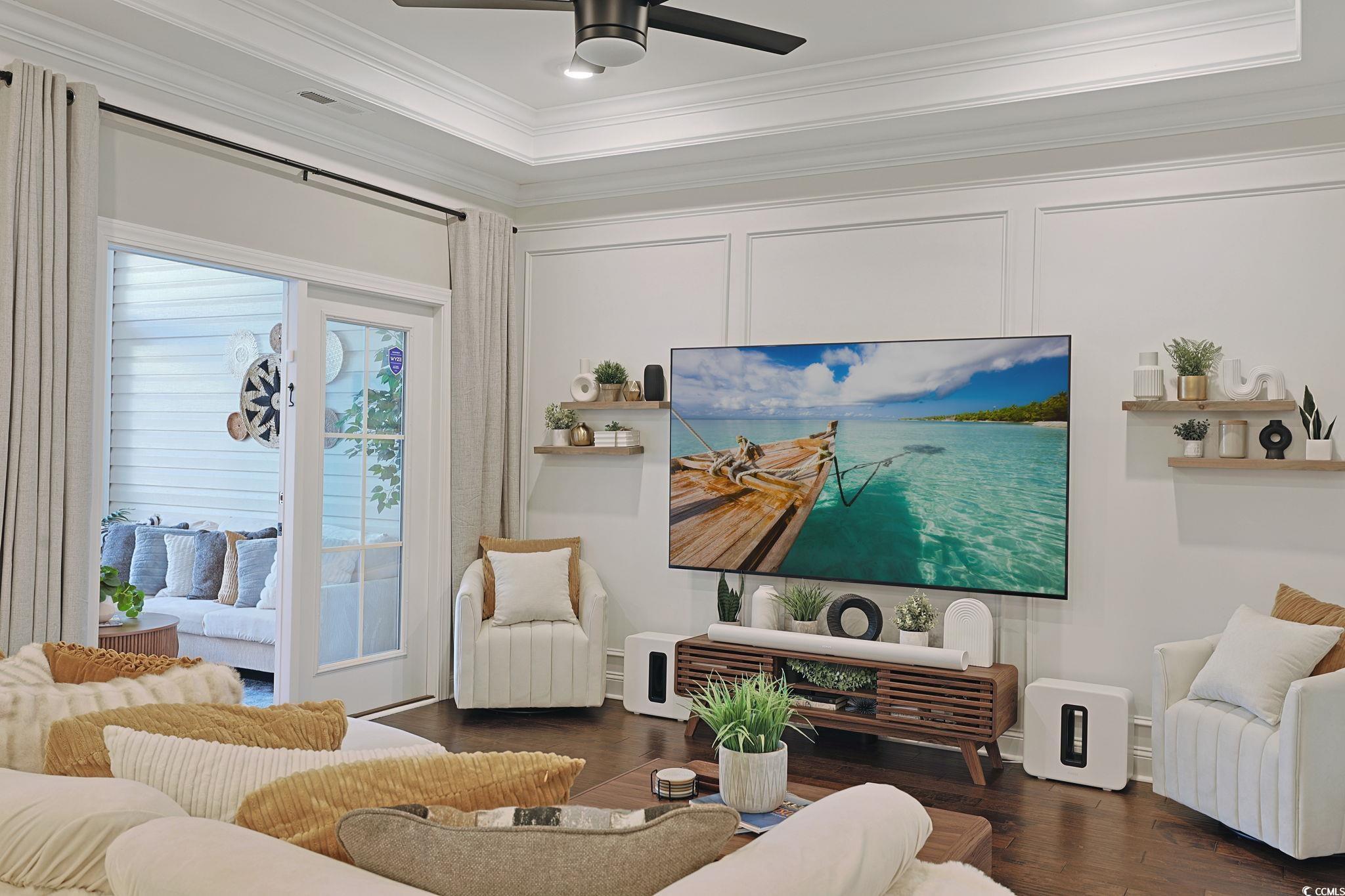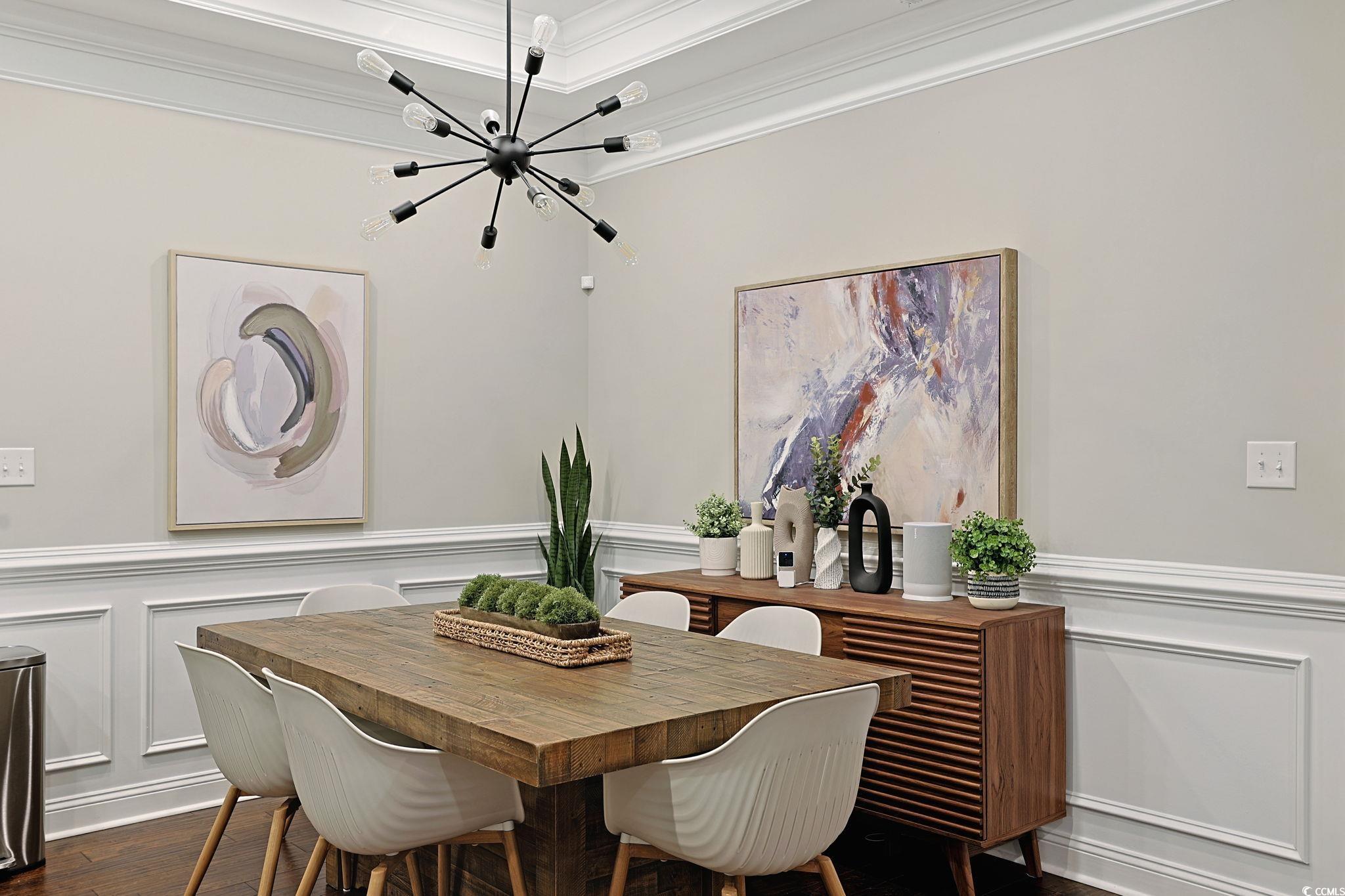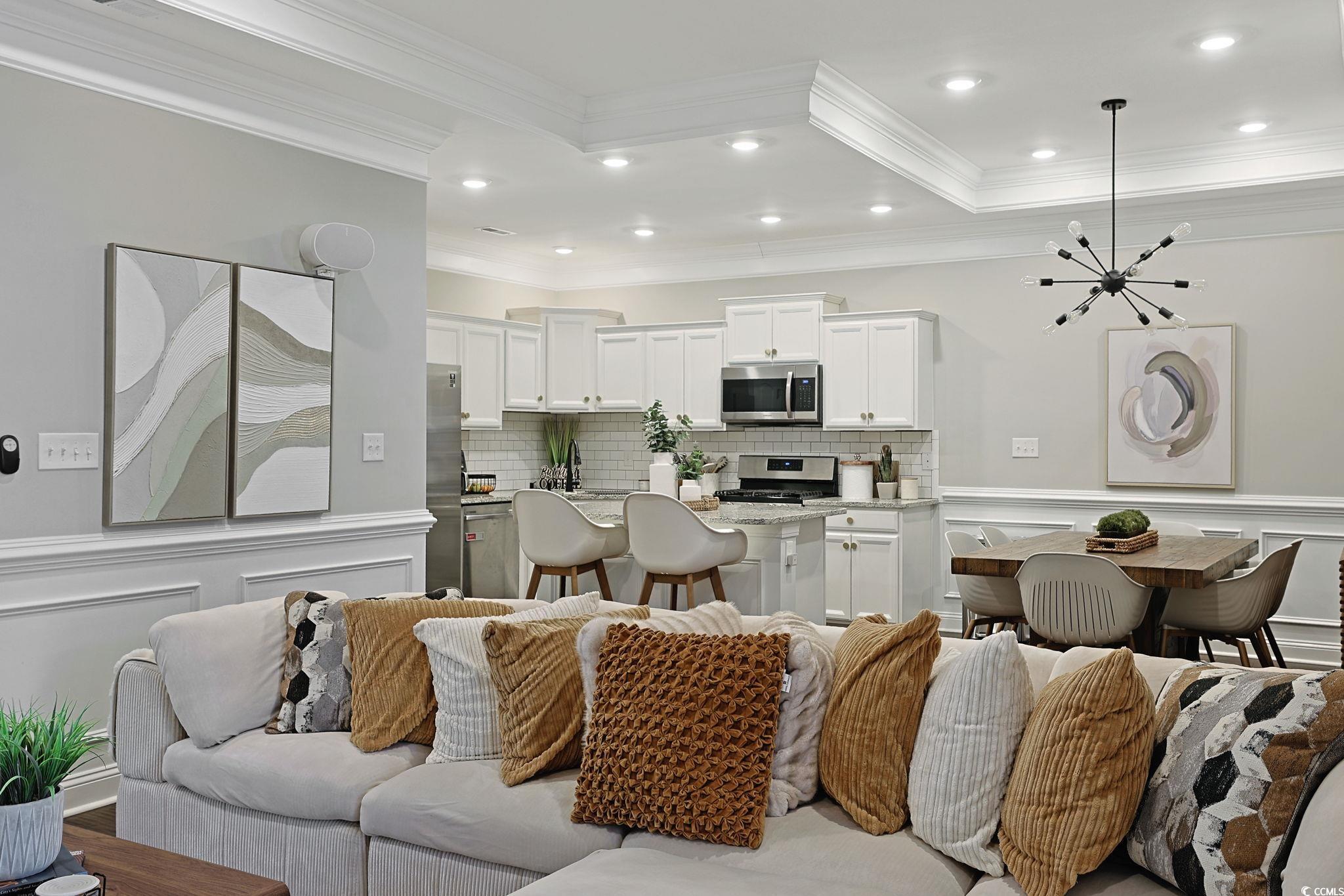 Presenting this luxurious 3 bedroom 2.5 bath townhome located in the very popular Queens Court community. This piece of paradise features an open floor plan with engineered wood & tile flooring, smooth flat 9 foot ceilings, elegant chair railing with shadow box paneling, crown moulding, recessed lighting, a guest powder room, a formal dining area, and a comfortable living room that showcases a sliding glass door that opens up to the delightful sunroom. The family friendly kitchen is equipped with a stainless steel appliance package that includes a gas range, built-in microwave, dishwasher, refrigerator, granite counter tops, a kitchen island, a breakfast bar, cabinets topped with crown moulding, and a practical pantry. The main level primary suite offers a rectangular raised-panel wainscoting that covers the full height of the wall (floor-to-ceiling), creating a dramatic backdrop. The panels are framed with crisp molding and painted in a high-gloss finish, which gives the wall depth and a luxurious feel, single step tray ceiling with a fan, private access to the double door primary bath hosting a vanity with dual sinks, a water closet, a deluxe step-in shower, and a large walk-in closet. As you venture upstairs you will find a memorable second master suite offering a ceiling fan, nice sized closet, and private access to a full bath. The second level is completed with an additional bedroom, a full guest bath, and a versatile bonus room. The main level of this exquisite home also includes a delightful back patio with a gas grill, lots of extra closet spaces, a laundry room, and a two car attached garage. This townhome affords you easy access to the beach and golfing along with all of the other activities and happenings in Myrtle Beach including fun eateries, award winning off-Broadway shows, public fishing piers, and intriguing shopping adventures along the Grand Strand. Conveniently located to your everyday needs, including grocery stores, banks, post offices, medical centers, doctors’ offices, and pharmacies. Check out our state of the art 3-D Virtual Tour.