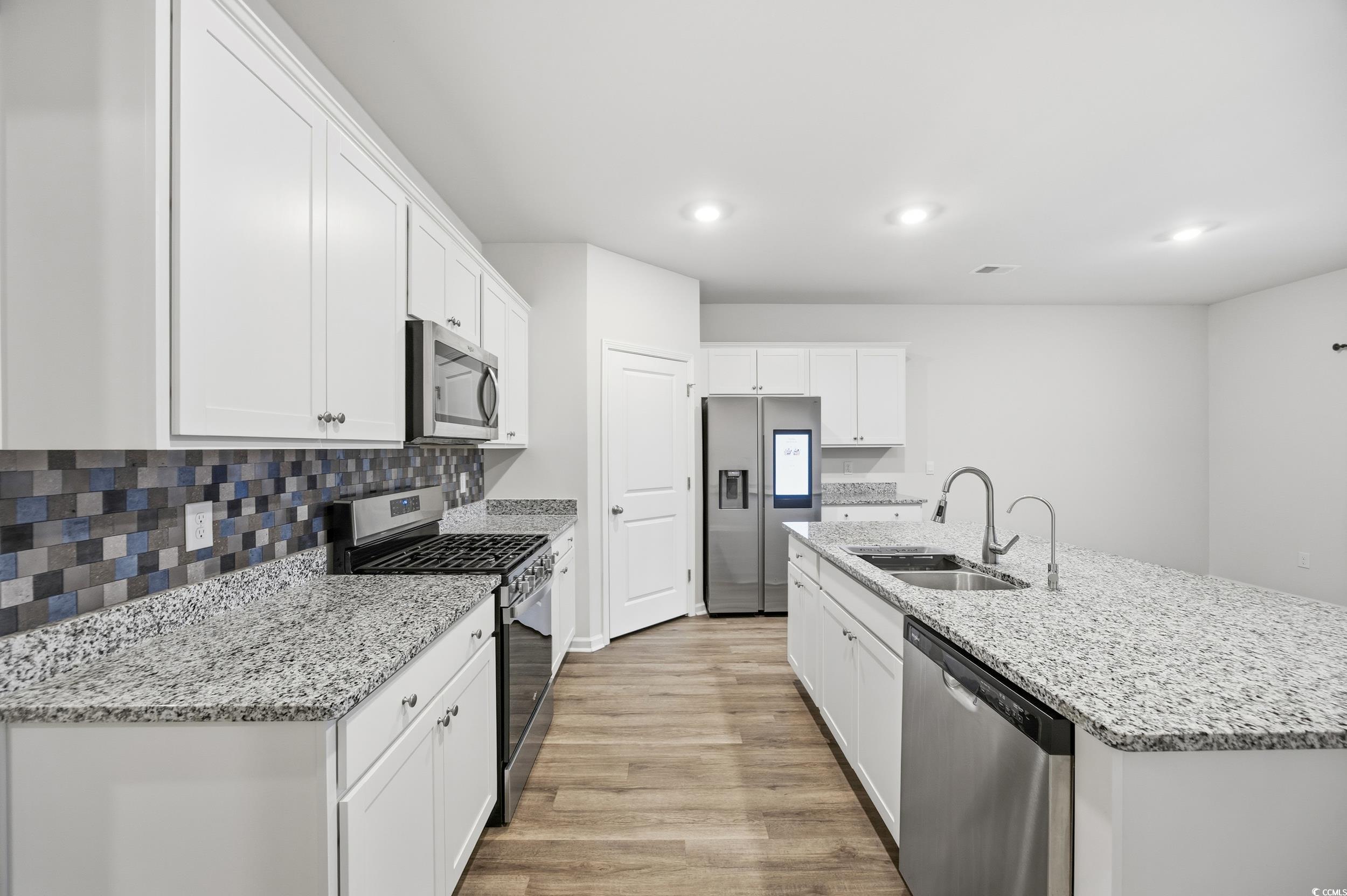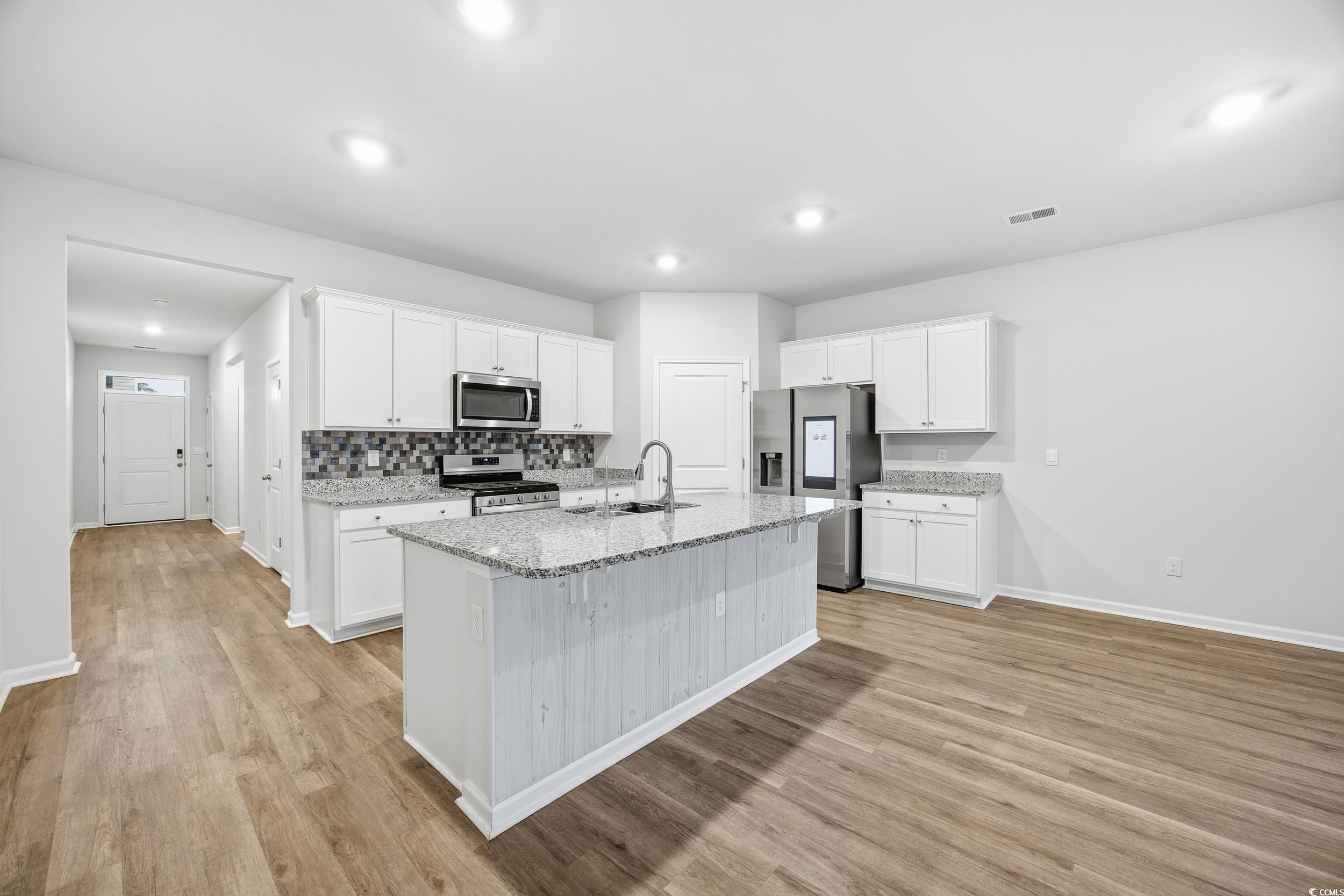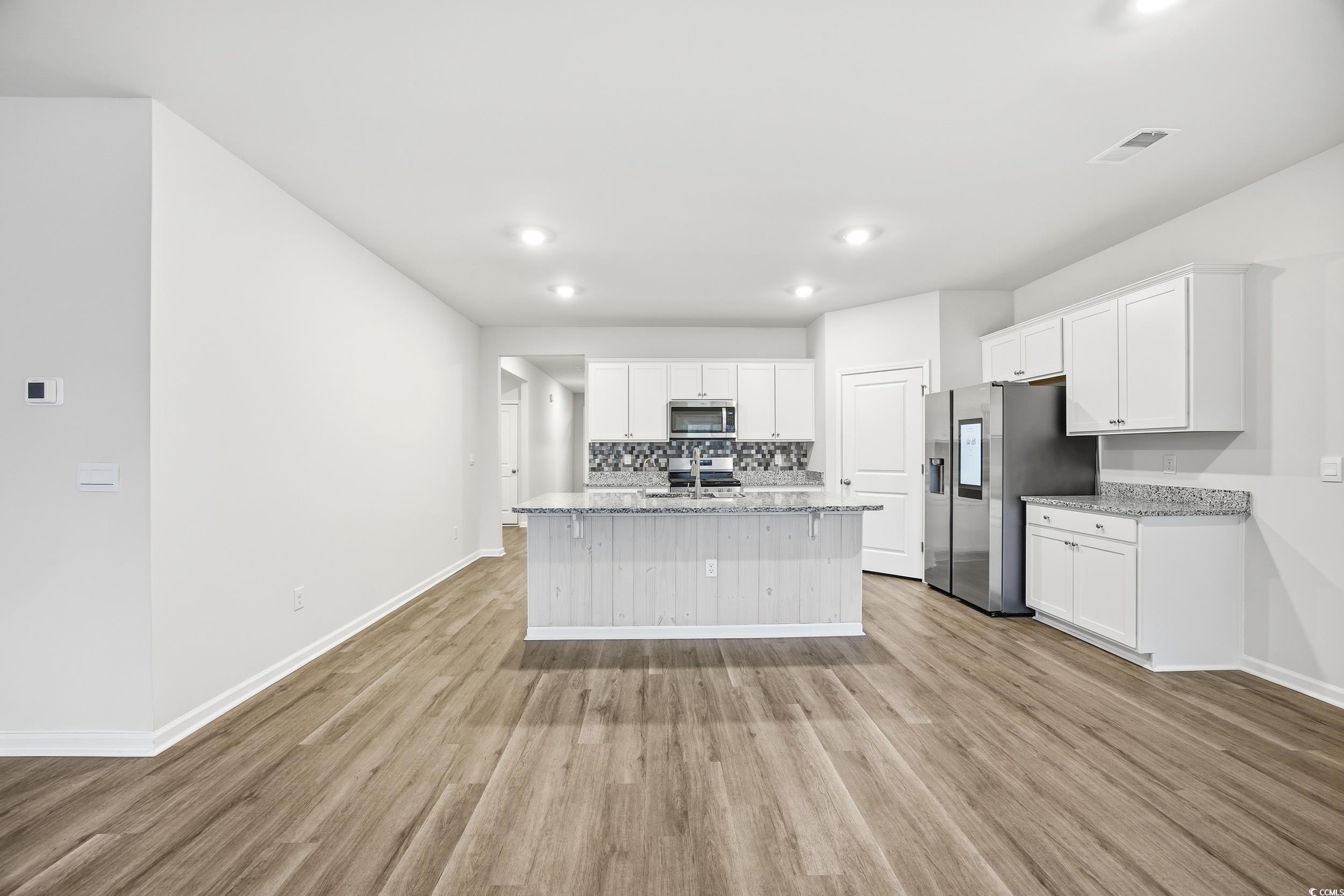 Step into this meticulously maintained 4-bedroom, 2-bath home that blends modern comfort with everyday convenience, all set against a peaceful golf course backdrop. Immaculately maintained inside and out, this home offers an inviting open-concept layout that ties the living, dining, and kitchen areas together in one bright, connected space—ideal for relaxing evenings or easy hosting. The kitchen stands ready for action with granite countertops, stainless steel appliances, an oversized island, ample cabinetry, and a walk-in pantry. Smart home connectivity keeps life running smoothly, while updated lighting and ceiling fans add a fresh, stylish touch. Durable LPV flooring flows throughout the main living areas. The primary suite provides a quiet retreat with a spacious bathroom featuring double vanities, a walk-in shower, and a dedicated linen closet. Three additional bedrooms offer flexibility for guests, a home office, or hobby spaces. Outside, enjoy peaceful views from your screened-in back porch overlooking the golf course, or step onto the extended concrete patio—perfect for grilling or cornhole Saturdays. The fenced-in backyard is ideal for pets or play, and the home’s gutter downspouts have been thoughtfully routed away for proper drainage. Move-in ready, beautifully cared for, and situated in a highly desirable setting—this home checks all the boxes.