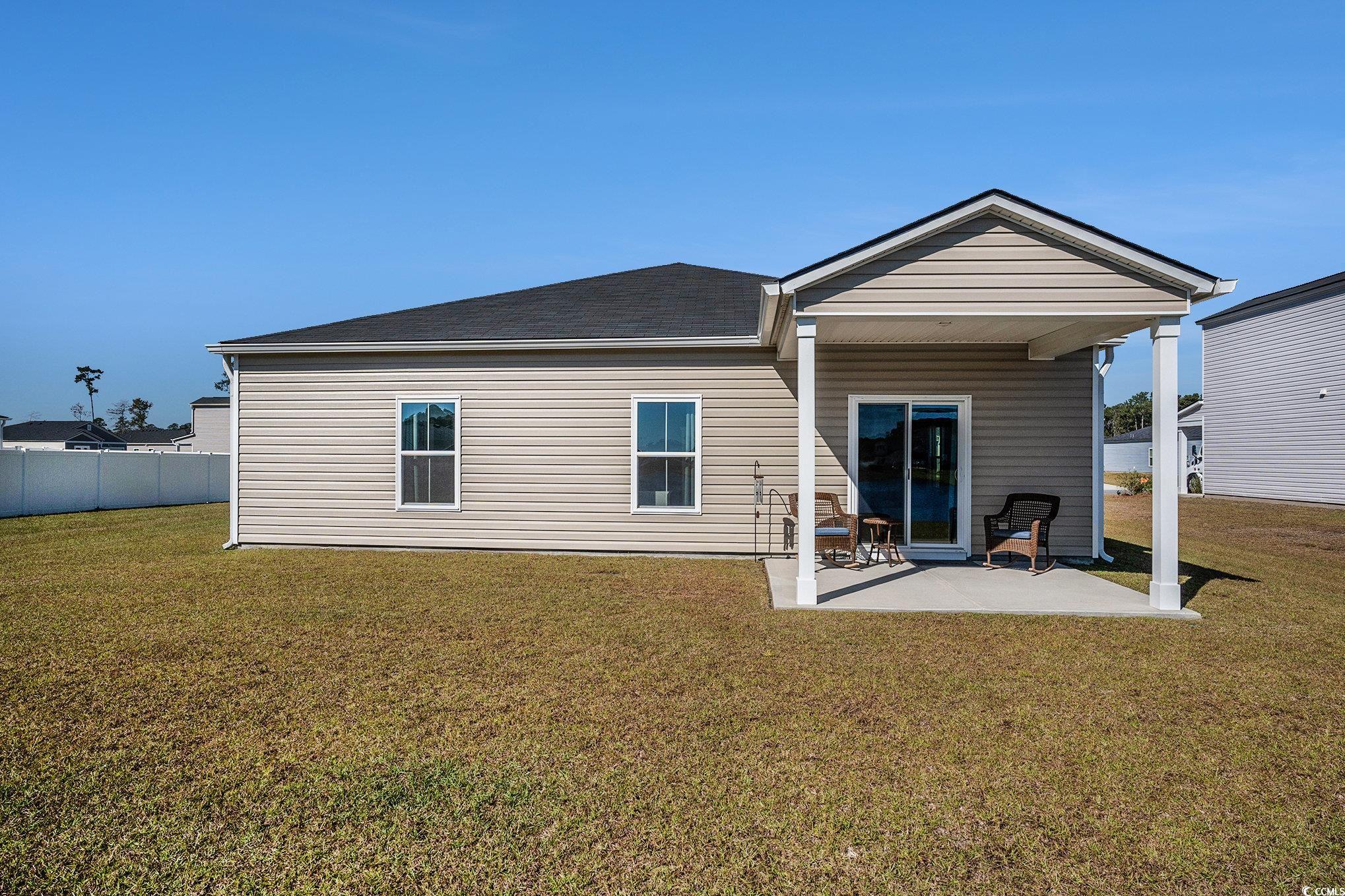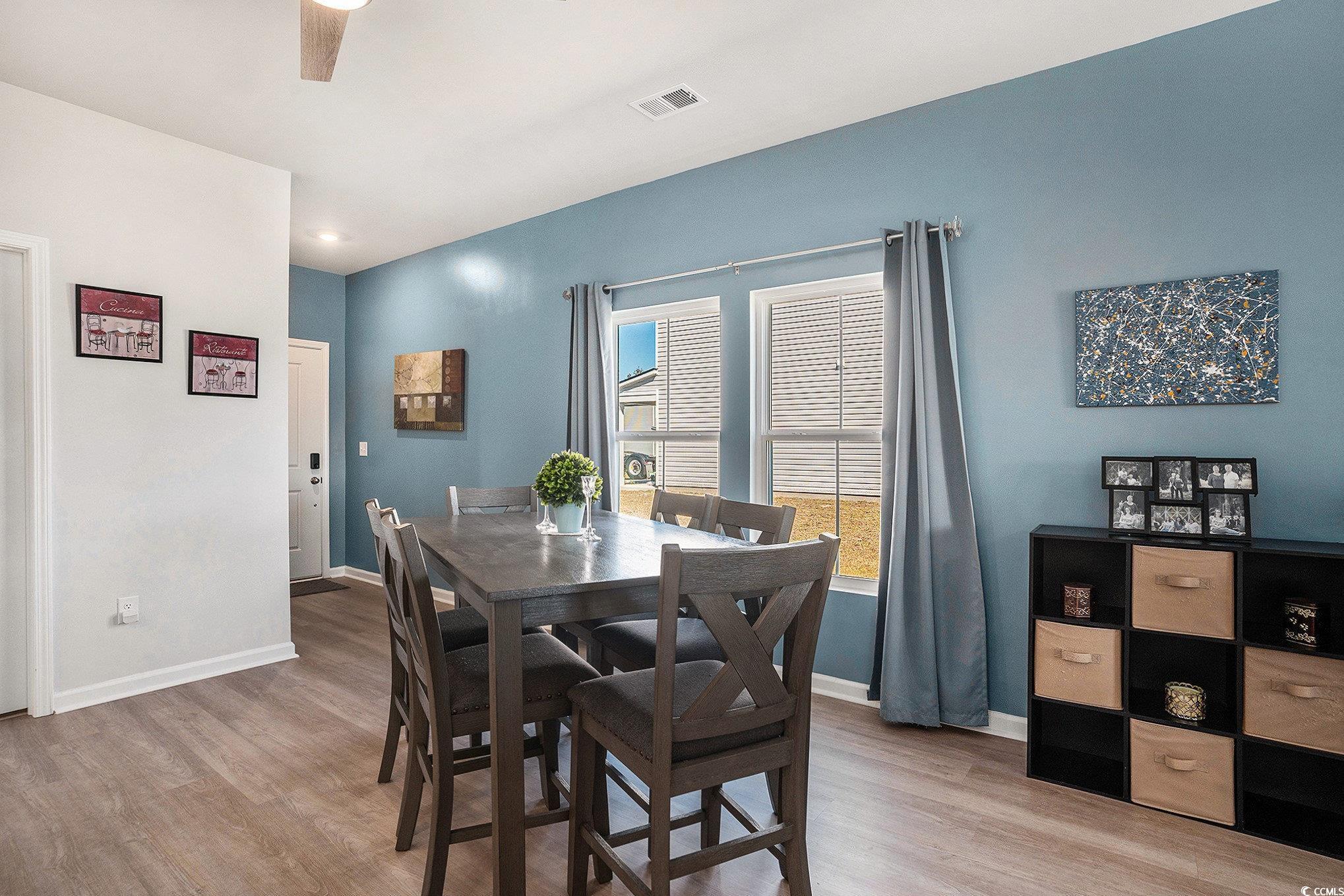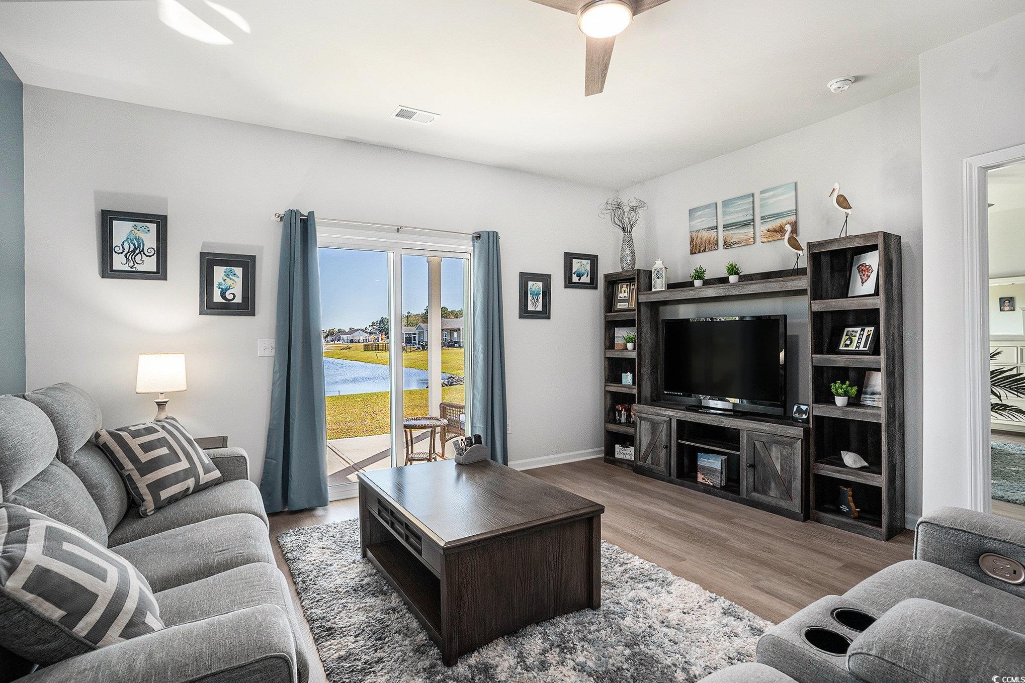 Welcome to this beautiful 4-bedroom, 2-bath home located in the Saddle Ridge community. As you enter through the foyer, you’re greeted by a spacious open layout featuring a large dining area perfectly situated between the kitchen and living room. The kitchen offers stainless steel appliances including a refrigerator, dishwasher, range, and microwave, along with granite countertops, a stylish backsplash, an island, garbage disposal, and a gas range fueled by a propane tank. The living room is bright and open with a ceiling fan and sliding glass doors leading to a covered porch where you can enjoy relaxing views of the pond. The owner’s suite is tucked away at the rear of the home and features a ceiling fan, walk-in closet, and a private bath with a double-sink vanity and walk-in shower. Three additional bedrooms are located at the front of the home along with a full bathroom that includes a tub/shower combo and vanity. The home also features durable vinyl flooring throughout, a tankless hot water heater, and a two-car garage. Residents of Saddle Ridge enjoy a community pool, clubhouse, playground, and picnic area. Conveniently located just minutes from grocery stores, restaurants, retail, schools, and the charming downtown Conway area, this home combines comfort, convenience, and modern living.
