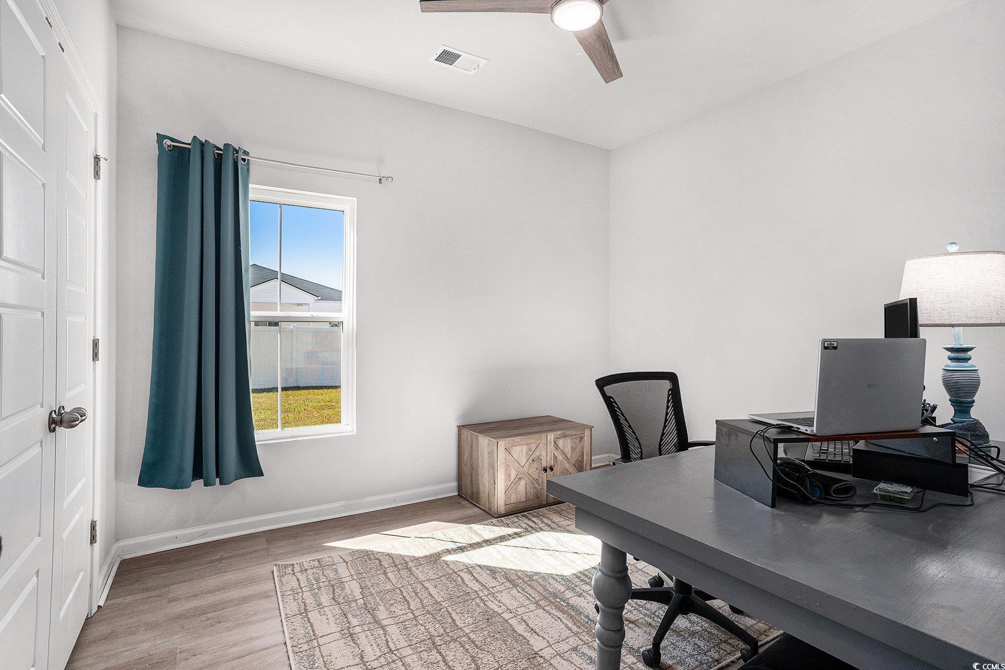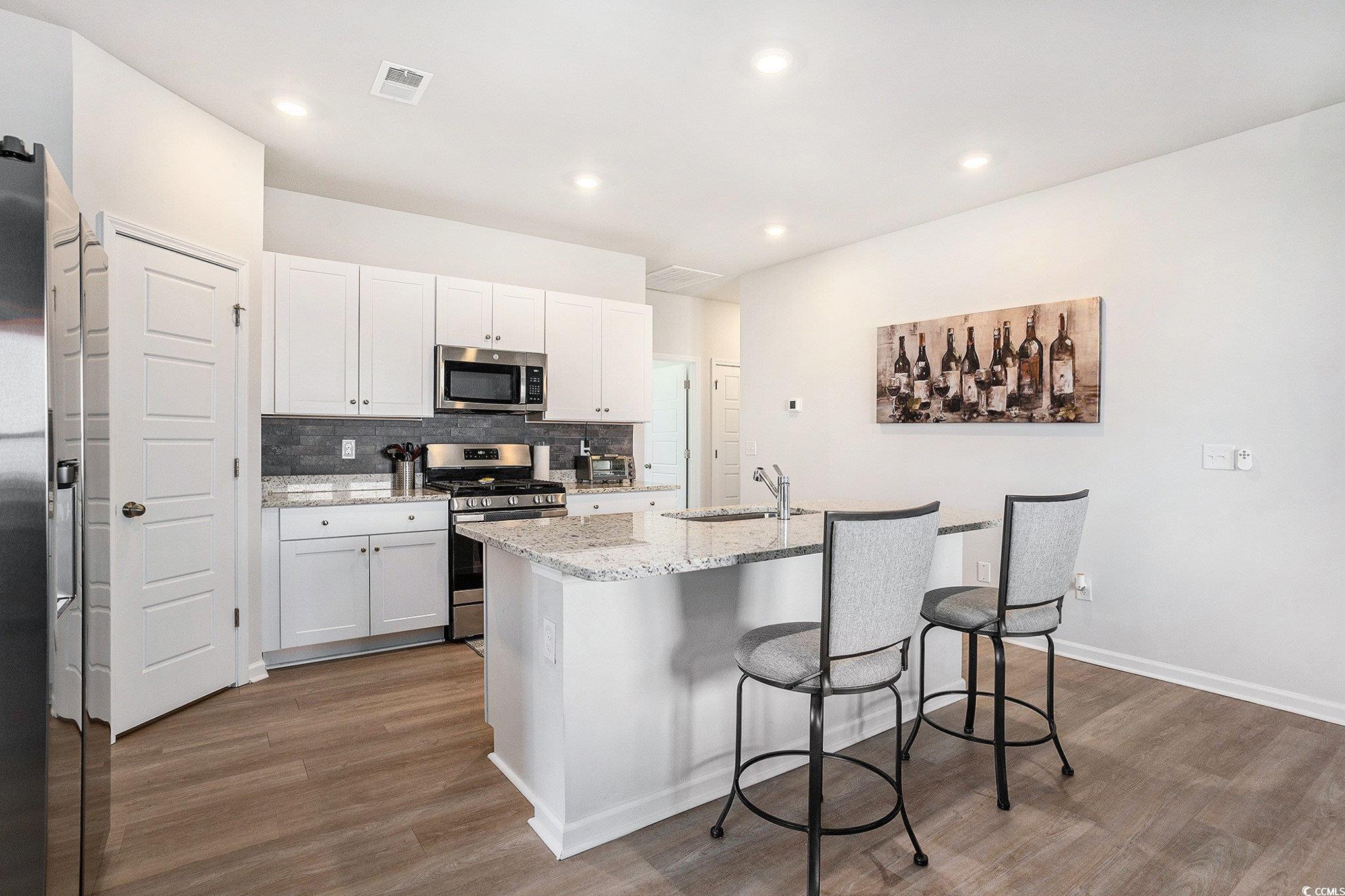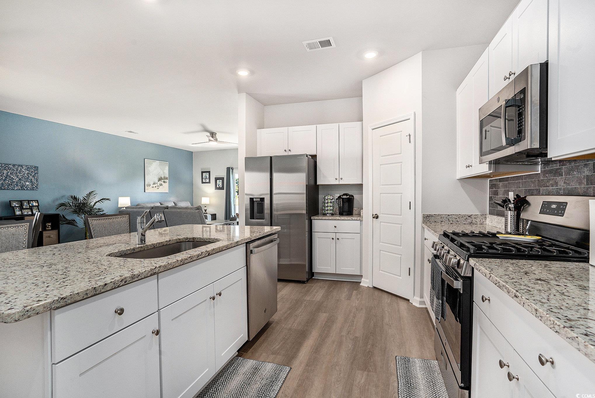 Welcome to this beautiful 4-bedroom, 2-bath home located in the Saddle Ridge community. As you enter through the foyer, you’re greeted by a spacious open layout featuring a large dining area perfectly situated between the kitchen and living room. The kitchen offers stainless steel appliances including a refrigerator, dishwasher, range, and microwave, along with granite countertops, a stylish backsplash, an island, garbage disposal, and a gas range fueled by a propane tank. The living room is bright and open with a ceiling fan and sliding glass doors leading to a covered porch where you can enjoy relaxing views of the pond. The owner’s suite is tucked away at the rear of the home and features a ceiling fan, walk-in closet, and a private bath with a double-sink vanity and walk-in shower. Three additional bedrooms are located at the front of the home along with a full bathroom that includes a tub/shower combo and vanity. The home also features durable vinyl flooring throughout, a tankless hot water heater, and a two-car garage. Residents of Saddle Ridge enjoy a community pool, clubhouse, playground, and picnic area. Conveniently located just minutes from grocery stores, restaurants, retail, schools, and the charming downtown Conway area, this home combines comfort, convenience, and modern living.