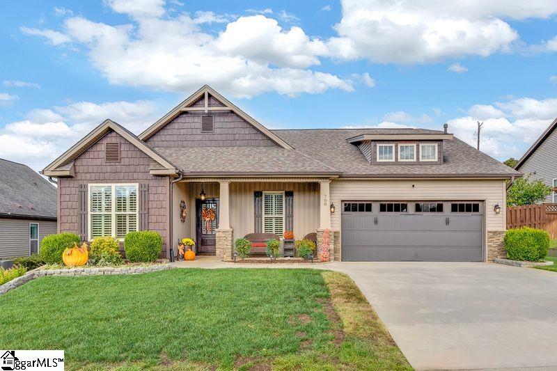 Stunning and beyond immaculate, this 4BR, 2BA beauty offers the elevated finishes and design you're searching to find. Truly like new and move-in ready, the curb appeal and inviting front porch greet you with a warm welcome. You'll love the open floor plan with artful accents, custom shiplap and plantation shutters - all locally crafted from genuine poplar. The striking kitchen highlights the home with a spacious island with bar seating, upgraded cabinets and granite, beaded glass doors, convection/induction range, subway tile backsplash, new faucet and the customized pantry of your dreams. The bright and airy dining and living spaces in this home are sure to make your gatherings memorable and everyday living easy with a cozy gas fireplace and a great flow. The Four Season sunroom will be a favorite place to relax and enjoy nature year-round, equipped with mini-split heating and a/c, beautiful windows, hardwood floors and access to the stamped concrete patio. The 5" hand scraped hardwood flooring continues into the spacious main floor owner's suite. With two customized walk-in closets, dual vanity, soaking tub and separate shower, this stylish space makes for easier mornings and tranquil evenings. Two additional bedrooms and a full bath are situated on the main floor, each with customized closet systems. The walk-in laundry offers custom cabinets with newer LG washer and dryer included. The fourth bedroom on the upper level is flexible to serve as a home office, media room or gym. More standout features include: privacy fenced back yard, new lighting & plumbing fixtures throughout, 2-zone Lennox HVAC, epoxy garage floor, full-yard irrigation system, freshly painted interior including the 2-car garage, and new switch & outlet plates. There's also a built-in security system and a walk-in attic with abundant storage. All kitchen appliances convey and the location can't be beat with easy access to both Greenville and Spartanburg and 15 minutes to GSP Int'l Airport. Built by Stonewood Homes, you'll appreciate the character, thoughtful details and meticulous care and craftsmanship with over 2,100 sq ft of modern yet classic living space.