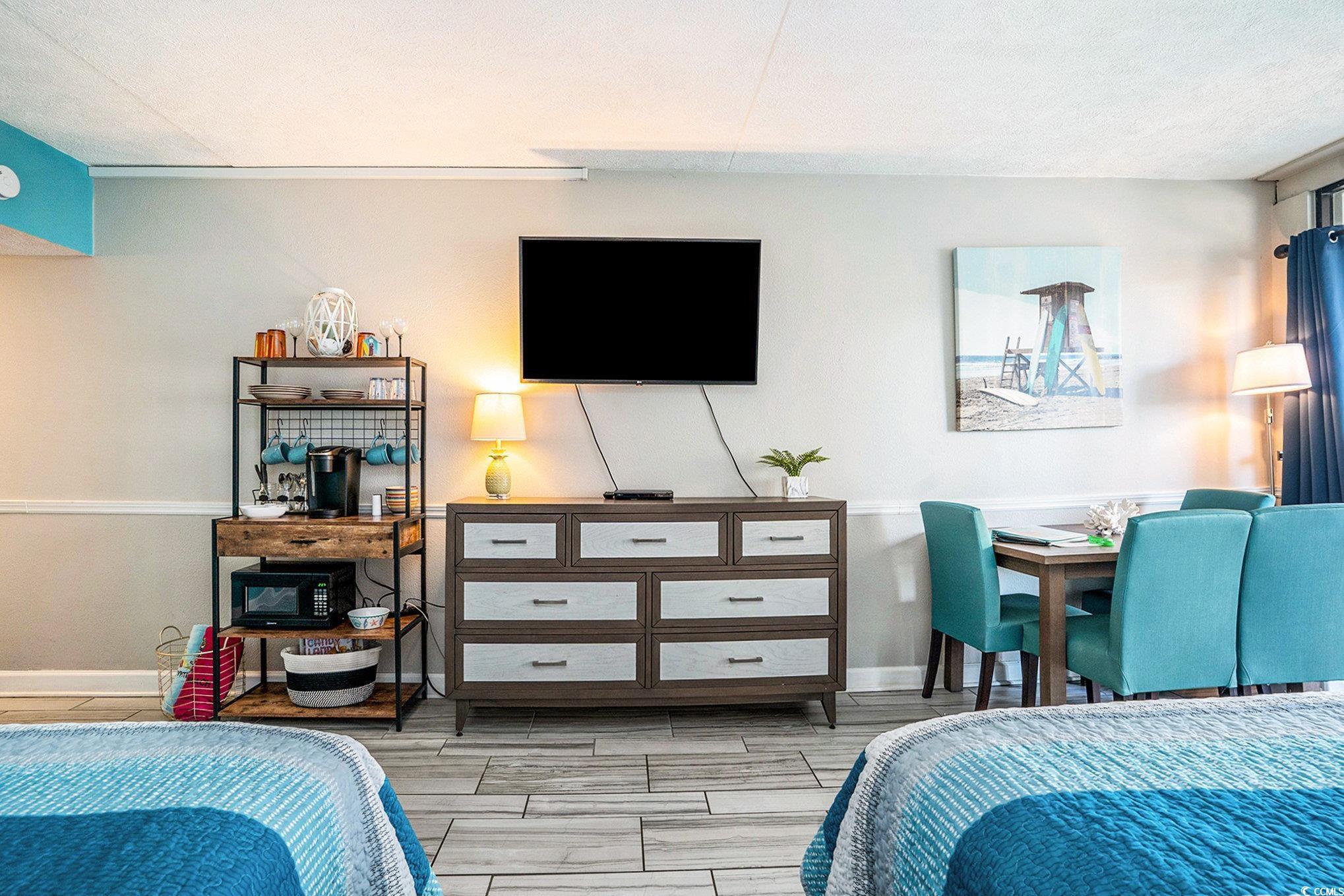 Welcome to this stunning efficiency ocean-view condo located in the renowned Grande Cayman Resort in Myrtle Beach! This condo perfectly combines comfort, style, and convenience for your ideal coastal retreat. As you enter, you'll be greeted by a kitchenette featuring granite countertops, a microwave, and a refrigerator-perfect for those quick meals or snacks. The upgraded LVP flooring throughout the unit adds a modern and appealing touch to the living space. Sleep comfortably in the two queen-sized beds, accommodating your family and friends with ease. The bathroom is elegantly designed with a granite countertop and a stylish shower tub combo with tile shower. Step outside to your private balcony and soak in the breathtaking panoramic views of the Atlantic Ocean, making it the perfect spot for morning coffee or evening relaxation. This condo is being sold fully furnished, offering a turn-key opportunity for new owners to move in and start enjoying the beach lifestyle right away. The Grande Cayman Resort enhances your vacation experience with a variety of amenities. Take a refreshing dip in the oceanfront outdoor pool, unwind in the indoor pool, or float along the lazy river. For endless entertainment, enjoy the water park, sauna, fitness center, and miniature golf, there's something for everyone! Culinary delights are just a stone's throw away, with fantastic dining options like Due South at 72nd, Turtle Bay Cafe, a Tiki Bar, and Starbucks conveniently located within the resort. This condo is not just a great vacation home; it also serves as an excellent investment property. Don't wait, schedule your showing today!