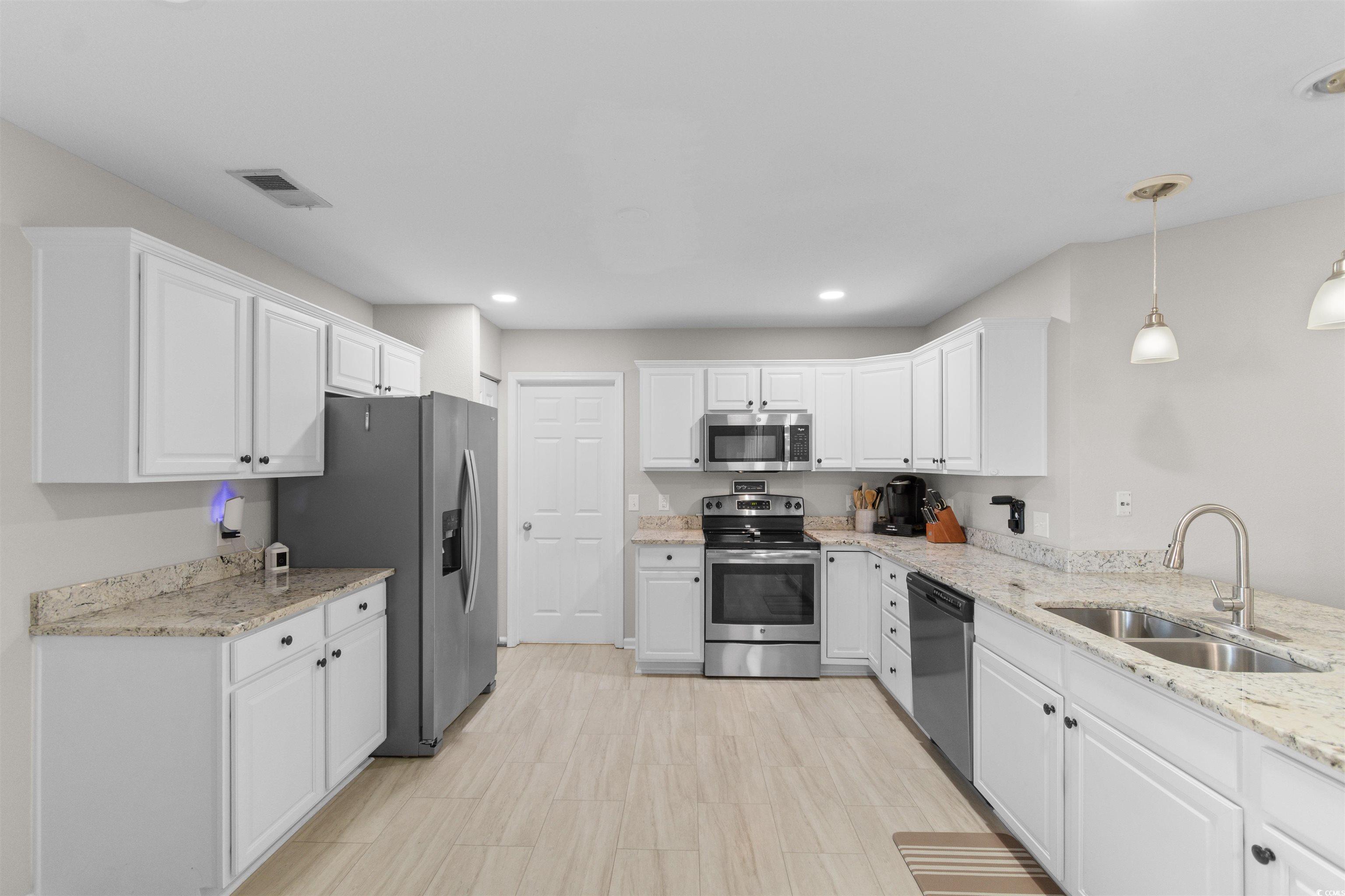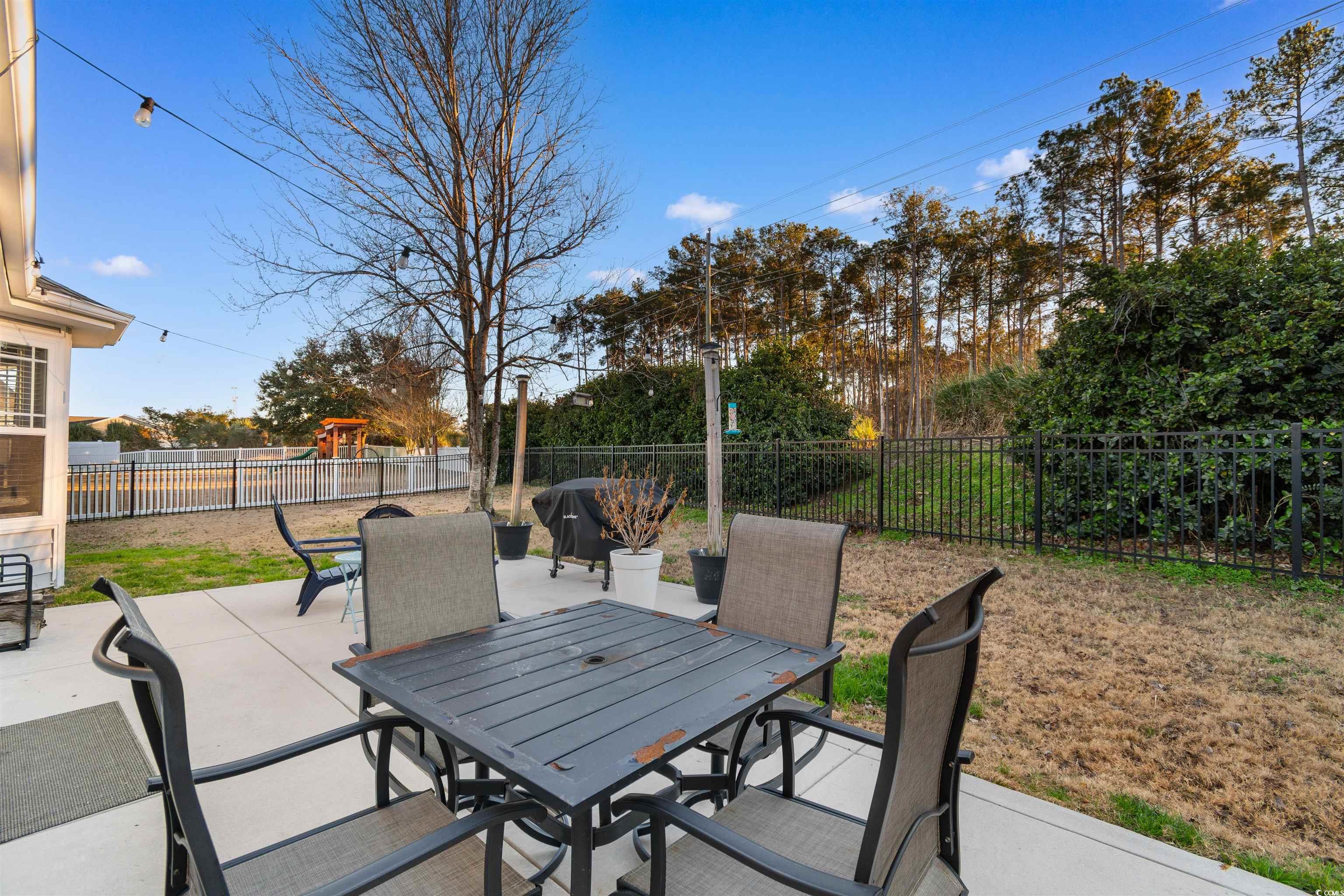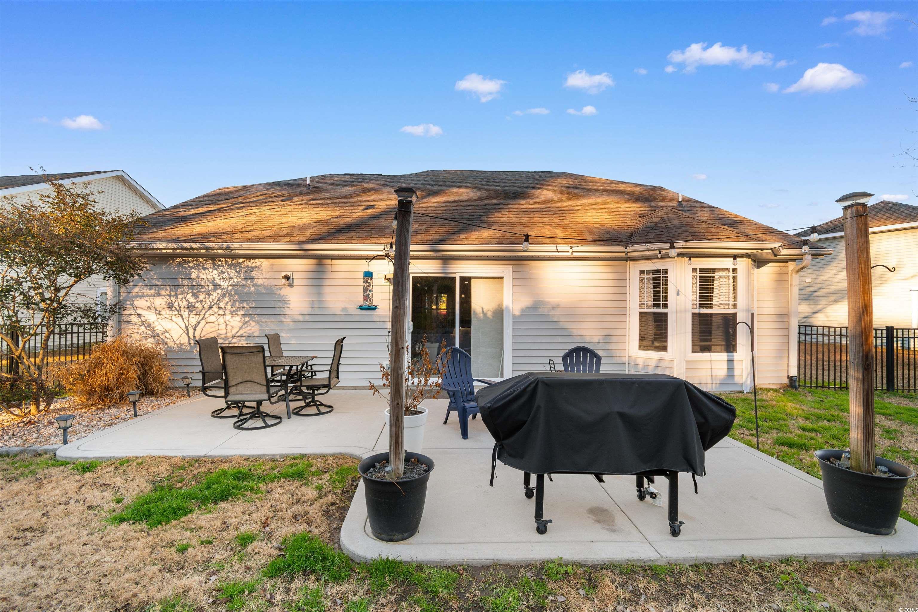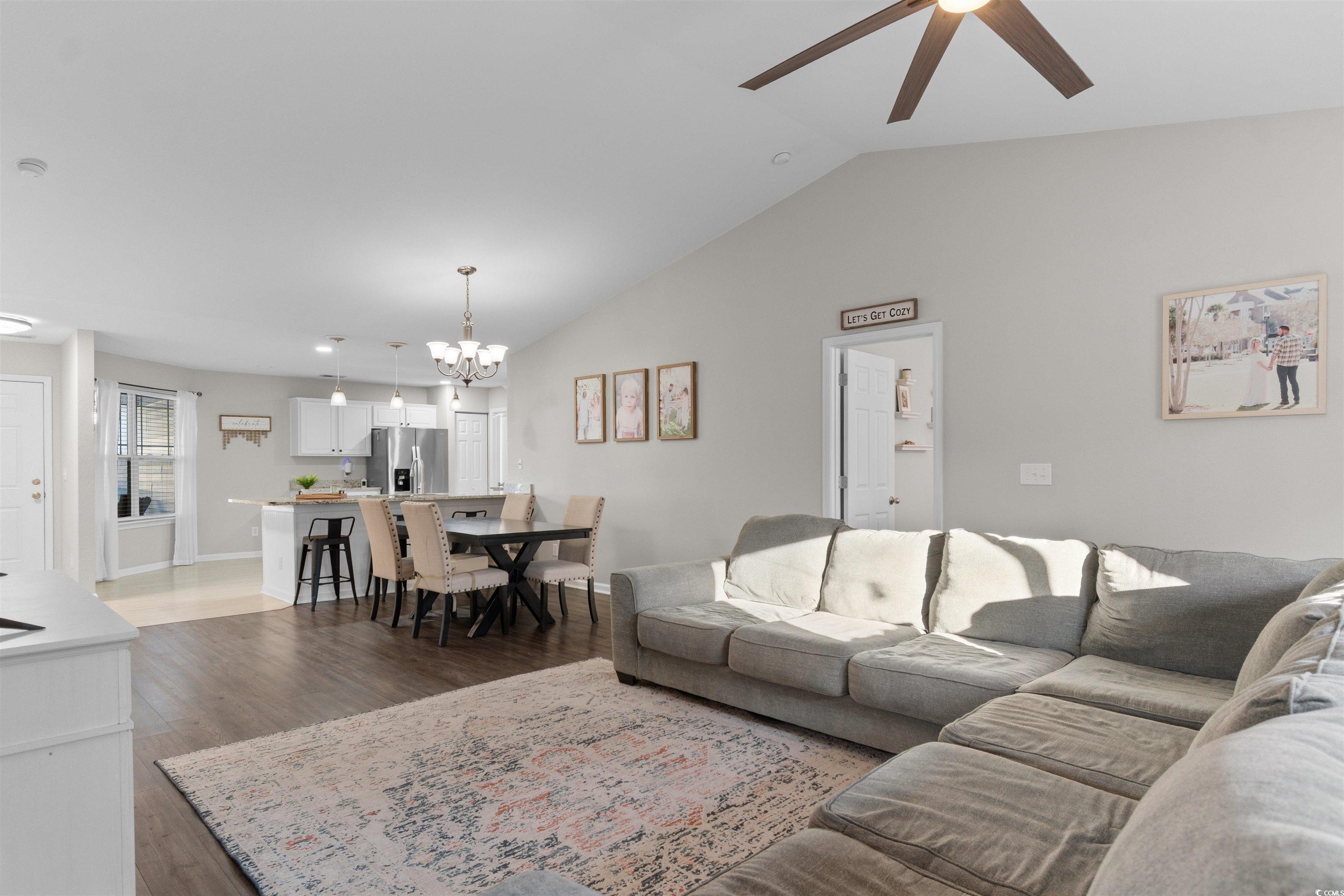 Located within the St. James School District, this 3-bedroom, 2-bath home provides a thoughtful layout and access to outstanding community amenities. A versatile flex space off the living room offers options for a home office, playroom, or creative space. The open-concept living, kitchen, and dining area features vaulted ceilings and a large ceiling fan, creating a bright and comfortable gathering space. The spacious kitchen is designed for both function and entertaining, featuring granite countertops, stainless steel appliances, and a bar counter large enough for four stools. A split-bedroom floor plan enhances privacy, with ceiling fans in every bedroom and no carpet throughout for easy maintenance. The primary suite includes a bay window bump-out and an en-suite bath with dual vanities, a soaking tub, and a separate shower. Step outside to a fenced backyard with a large patio offering ample space for a grilling area and outdoor dining table, perfect for enjoying time outdoors. Residents also enjoy a newly renovated community center, pickleball and tennis courts, basketball court, and a large swimming pool. Perfectly positioned for everyday convenience, with the beach, airport, shopping, grocery stores, and dining all just a short drive away.