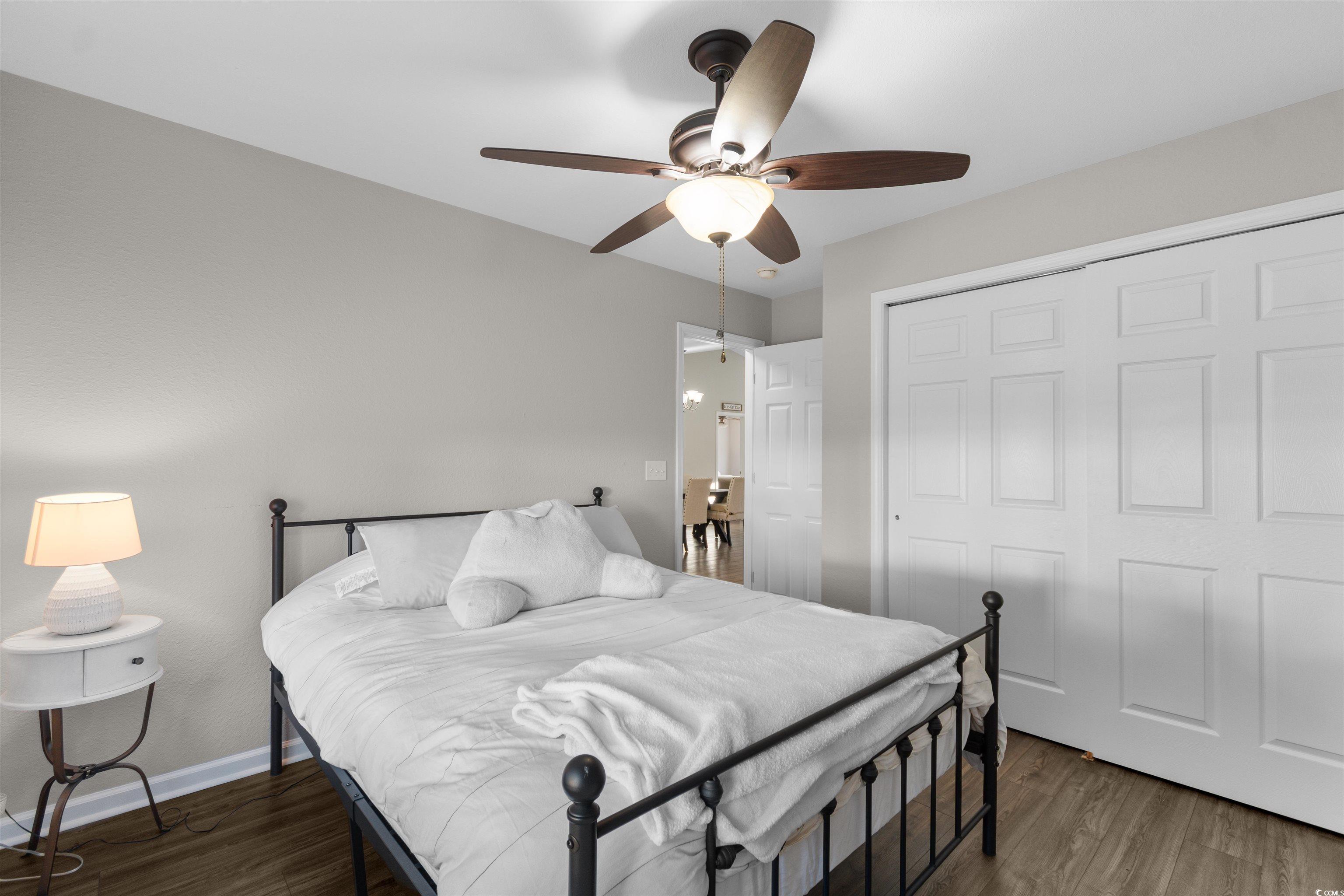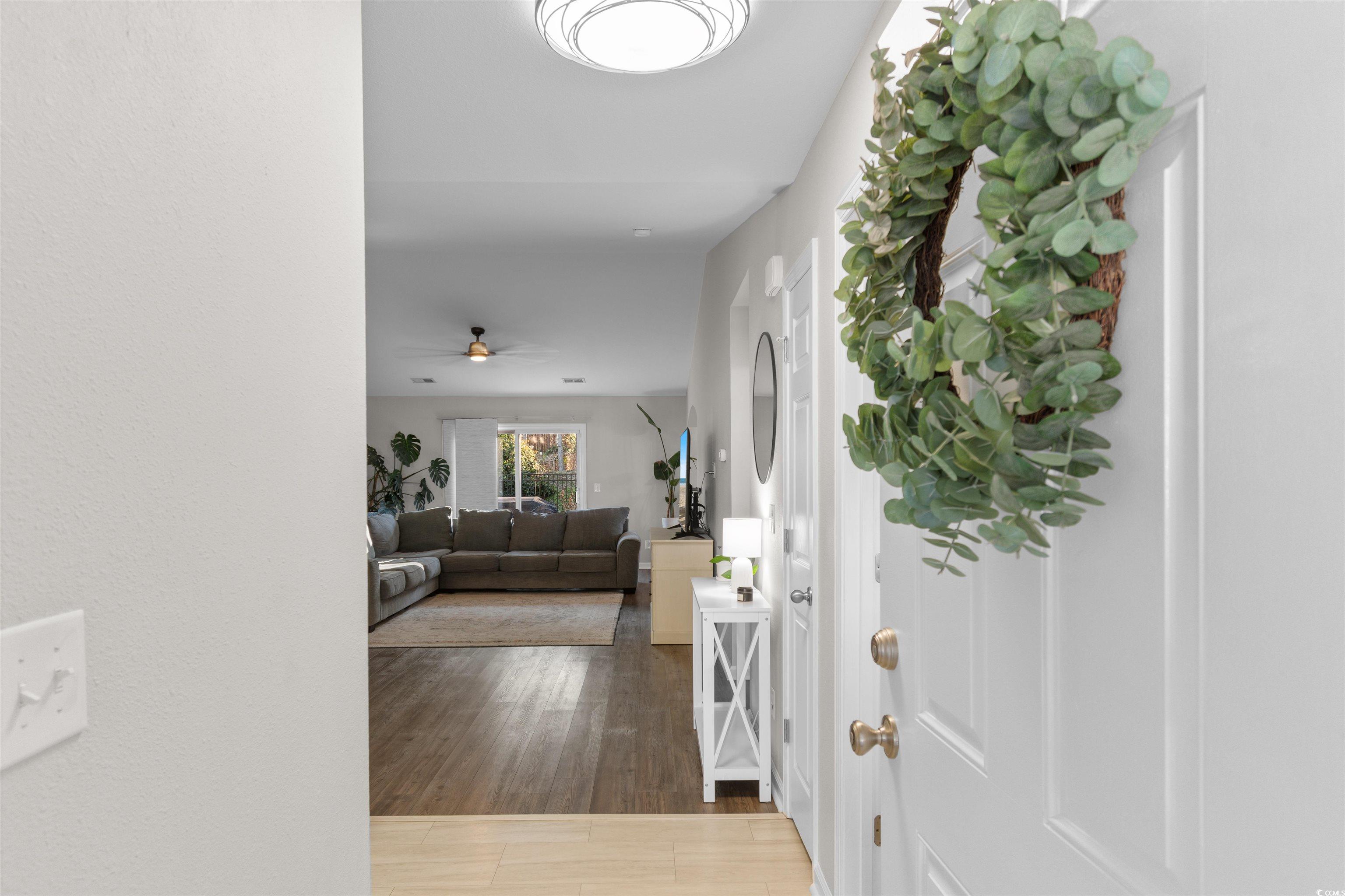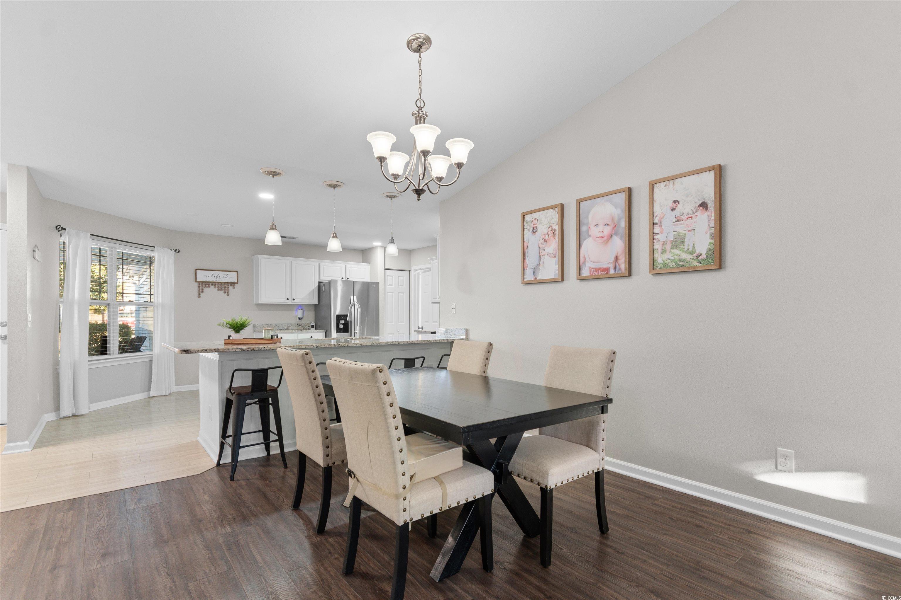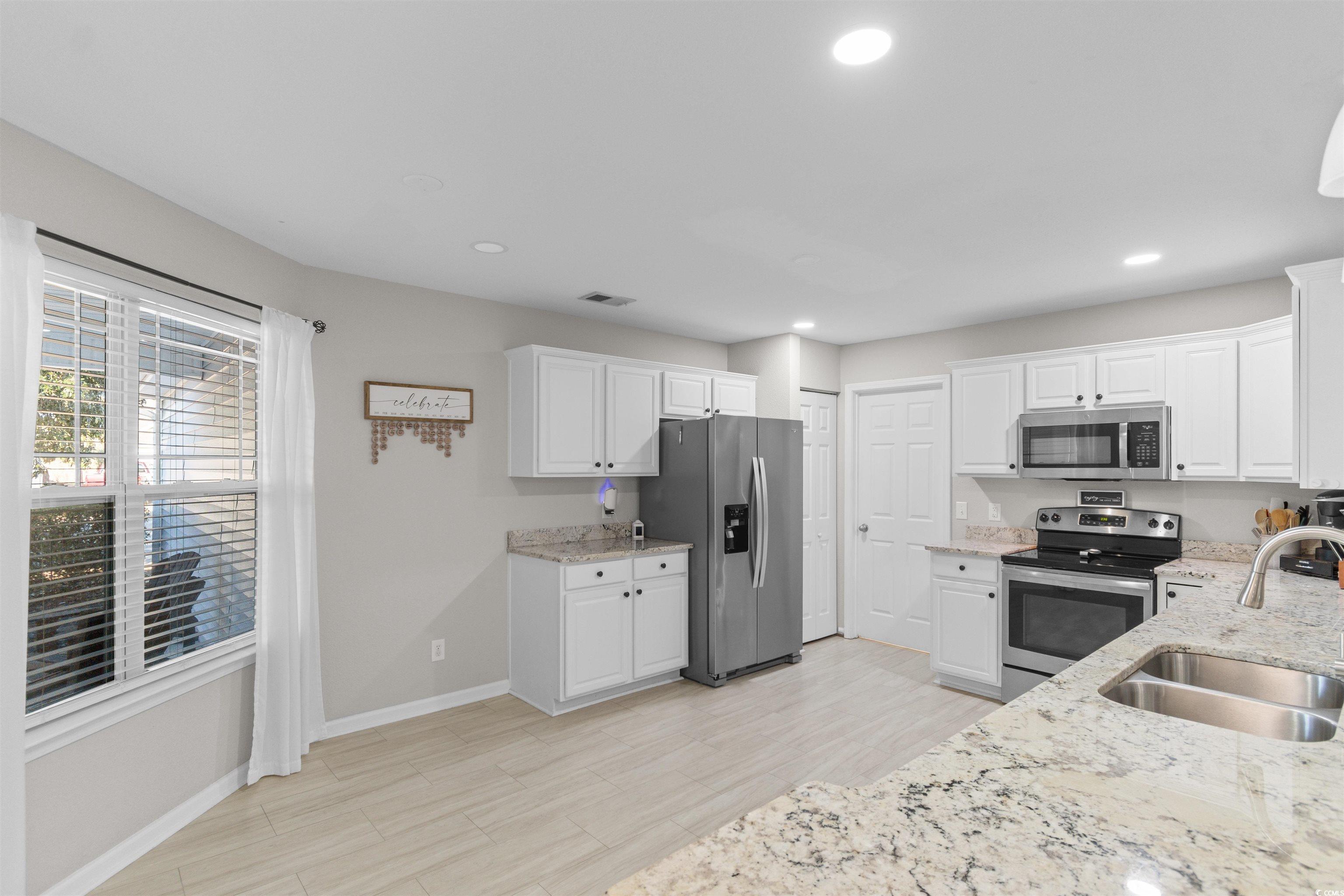 Located within the St. James School District, this 3-bedroom, 2-bath home provides a thoughtful layout and access to outstanding community amenities. A versatile flex space off the living room offers options for a home office, playroom, or creative space. The open-concept living, kitchen, and dining area features vaulted ceilings and a large ceiling fan, creating a bright and comfortable gathering space. The spacious kitchen is designed for both function and entertaining, featuring granite countertops, stainless steel appliances, and a bar counter large enough for four stools. A split-bedroom floor plan enhances privacy, with ceiling fans in every bedroom and no carpet throughout for easy maintenance. The primary suite includes a bay window bump-out and an en-suite bath with dual vanities, a soaking tub, and a separate shower. Step outside to a fenced backyard with a large patio offering ample space for a grilling area and outdoor dining table, perfect for enjoying time outdoors. Residents also enjoy a newly renovated community center, pickleball and tennis courts, basketball court, and a large swimming pool. Perfectly positioned for everyday convenience, with the beach, airport, shopping, grocery stores, and dining all just a short drive away.