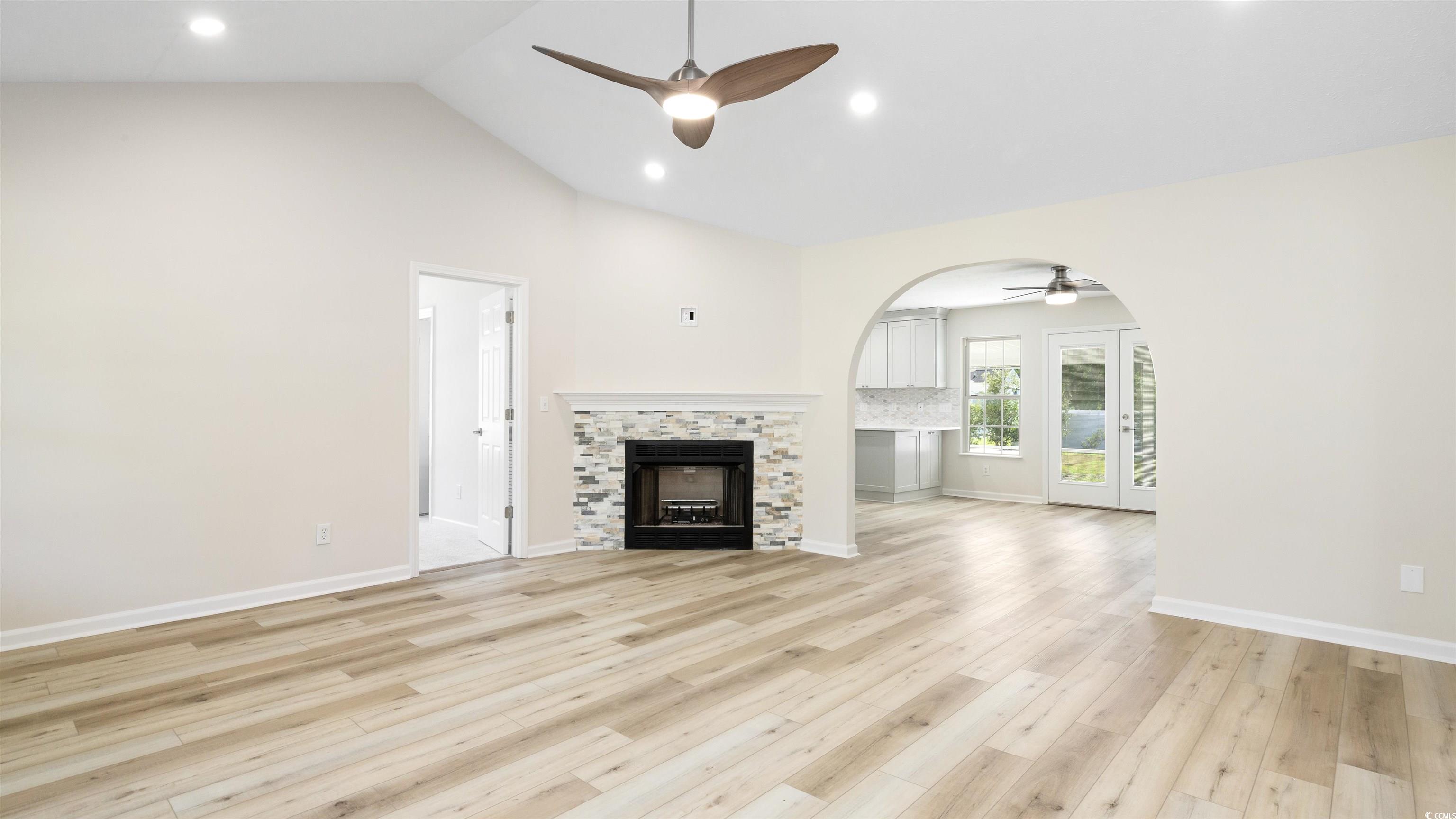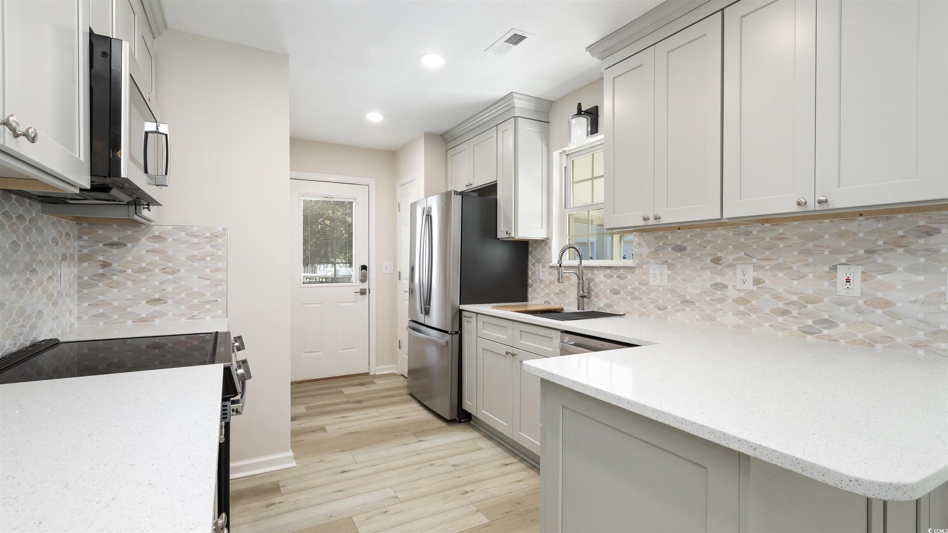 Newly renovated and move-in ready! This stunning 3-bedroom, 2-bath home sits on a spacious half-acre lot near the Hwy 31 and Hwy 707 interchange, offering no HOA fees. Features include vaulted ceilings, arched entryways, recessed lighting, a cozy gas fireplace, and a formal dining area with French doors leading to a screened-in patio. The updated kitchen showcases new cabinetry with crown molding, ample counter space, a pantry, and new stainless steel appliances. The primary suite offers a vaulted ceiling, large walk-in closet, and private bath with a tiled walk-in shower. Enjoy the oversized detached two-car garage, storage shed, large backyard, and inviting front porch. Conveniently located near beaches, golf, restaurants, shopping, and all Myrtle Beach and Murrells Inlet attractions.