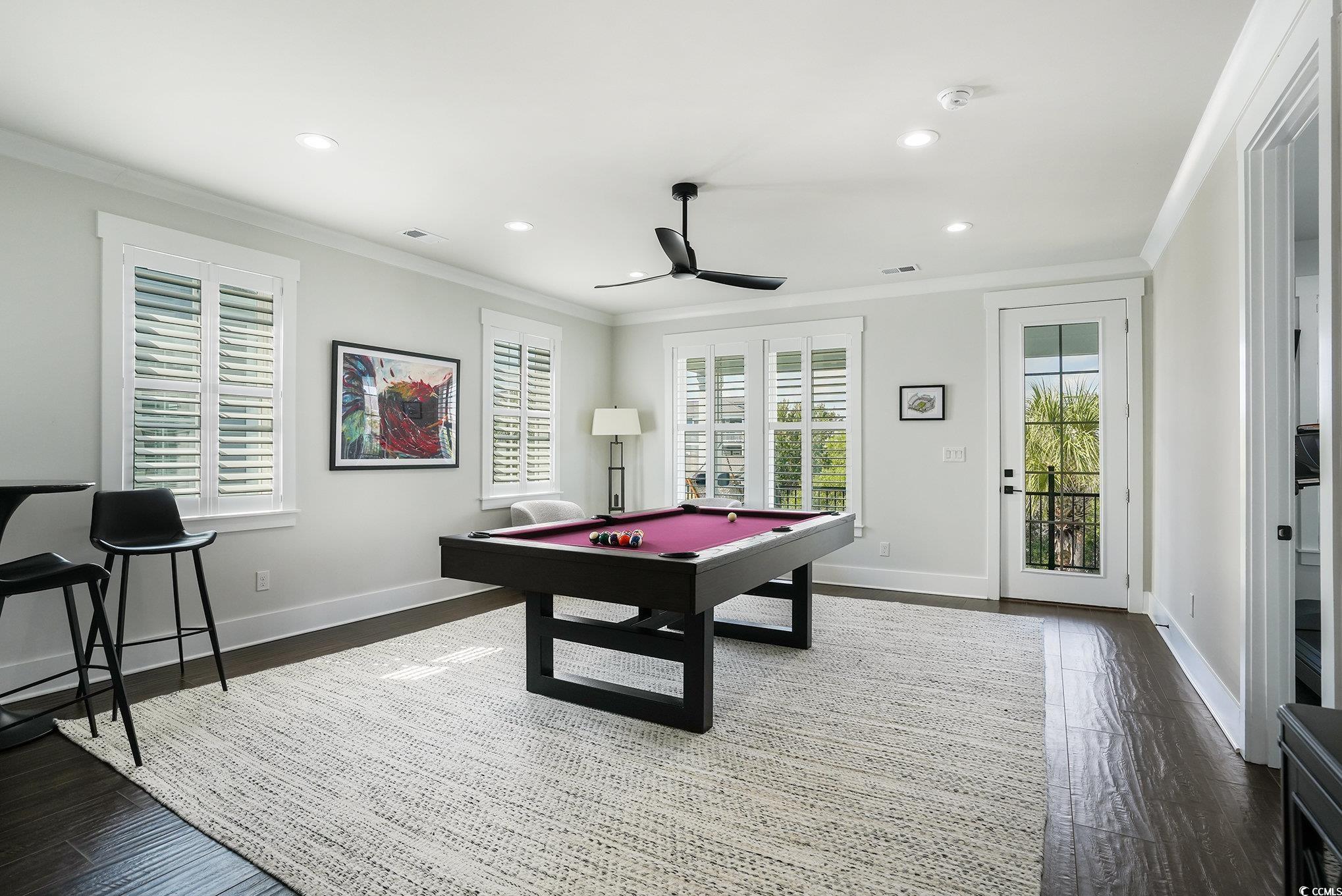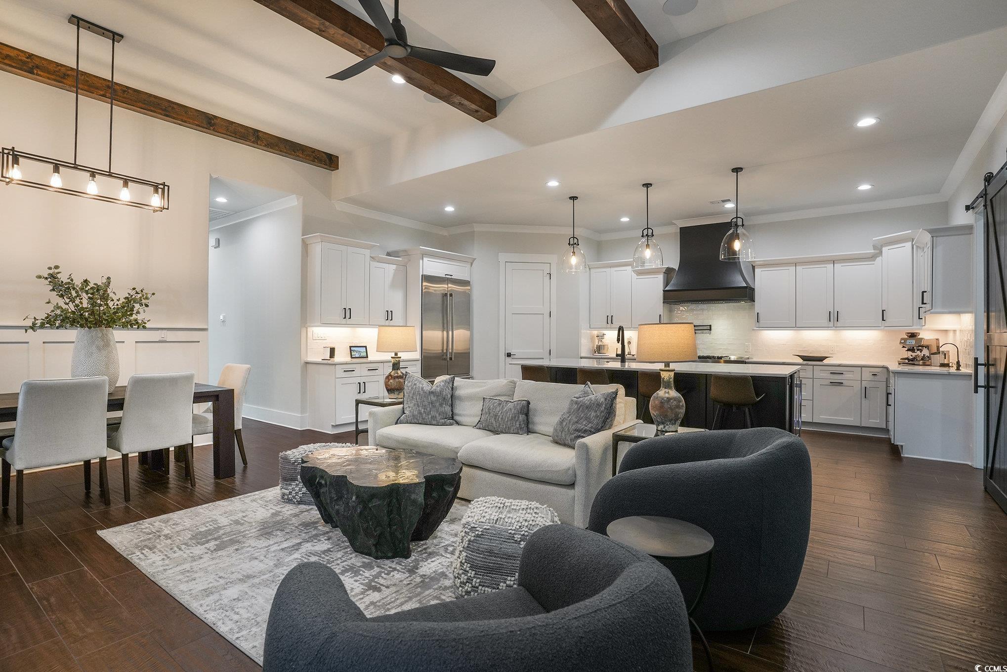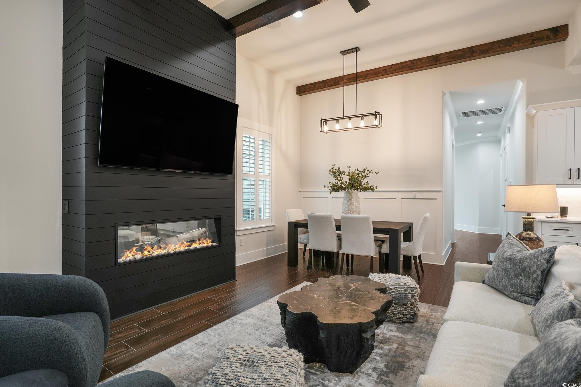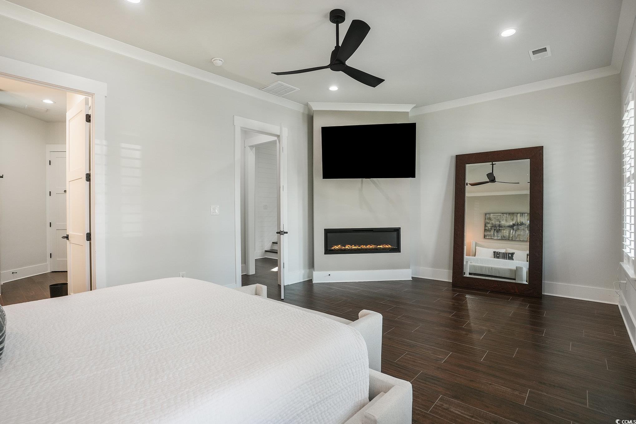 Welcome to this stunning Charleston-style, designer-built home in the prestigious gated community of Waterway Palms Plantation. This elegant residence combines timeless Southern charm with modern luxury, offering a perfect balance of indoor comfort and outdoor living. From the moment you arrive, you’ll be drawn to the home’s double front porches, coastal blue Hardie Plank siding, and inviting arched double-door entry. The lush landscaping with palms and magnolia trees frames the property beautifully, setting the tone for the refined living experience inside. The heart of this home is a bright, open-concept living and kitchen area that seamlessly blends style, warmth, and functionality. Anchored by a dramatic shiplap fireplace with a sleek linear flame. The living room features exposed wood beams, wide-plank flooring, and an abundance of natural light that pours in through windows and glass doors, leading to a private screened-in porch. It’s an inviting space designed for both everyday relaxation and entertaining guests. The adjoining chef’s kitchen is a true showpiece, featuring a massive island with seating for four, custom cabinetry, and designer lighting. Culinary enthusiasts will appreciate the JennAir appliances, the professional 10-burner gas range with dual ovens, warming drawer, custom vent hood, and convenient pot filler, while the built-in wine fridge and Chick-Fil-A style nugget ice maker elevate hosting. Enjoy pristine, refreshing water throughout the home with a whole-house water filtration system, complemented by a reverse osmosis purification system that supplies the nugget ice machine and water fountain tap. The kitchen flows effortlessly into the dining area, highlighted by elegant millwork, modern lighting, and room for family gatherings. Every detail of this space has been carefully curated. The luxurious first-floor primary suite is a true retreat, blending comfort and sophistication with thoughtful details throughout. The spacious bedroom is bathed in natural light from the large windows and elegantly finished with plantation blinds for privacy. A modern fireplace adds warmth and elegance, creating a cozy spot to unwind at the end of the day. The soft neutral palette, wood-look tile flooring, and stylish pendant lighting on each side of the bed provide a serene and upscale atmosphere. The en-suite bathroom is designed with spa-like finishes, including a double sink vanity with striking black countertops, contemporary mirrors, and designer fixtures. The oversized walk-in steam shower showcases floor-to-ceiling custom tilework, multiple showerheads, and built-in shelving for a sleek yet functional experience. Completing the suite is a generous walk-in closet system with custom shelving, drawers, and abundant hanging space, offering both organization and style. Beyond the primary suite, this home offers thoughtfully designed secondary bedrooms and versatile spaces that adapt to your family’s lifestyle. Each additional bedroom features neutral color palettes, creating welcoming retreats for family and visitors. Each bedroom also features their own bathrooms allowing privacy for family or guests. At the top of the stairs, the open loft serves as a game room and second living area, complete with access to the upper balcony. With room for a pool table, lounge seating, or media setup, it’s an entertainer’s dream. Tucked just off the loft, a flexible space is currently set up as a home gym, complete with large windows, durable flooring, and room for equipment or transform the space to your needs. Outdoor living shines with a retractable phantom-screened porch, full summer kitchen with Green Egg platform, and a gas-fed fire pit courtyard, all wrapped in classic southern charm with covered porches and a balcony. Waterway Palms Plantation is a coveted gated community on the Intracoastal Waterway offering resort-style amenities from a clubhouse and pool to tennis, playground, and private boat launch.