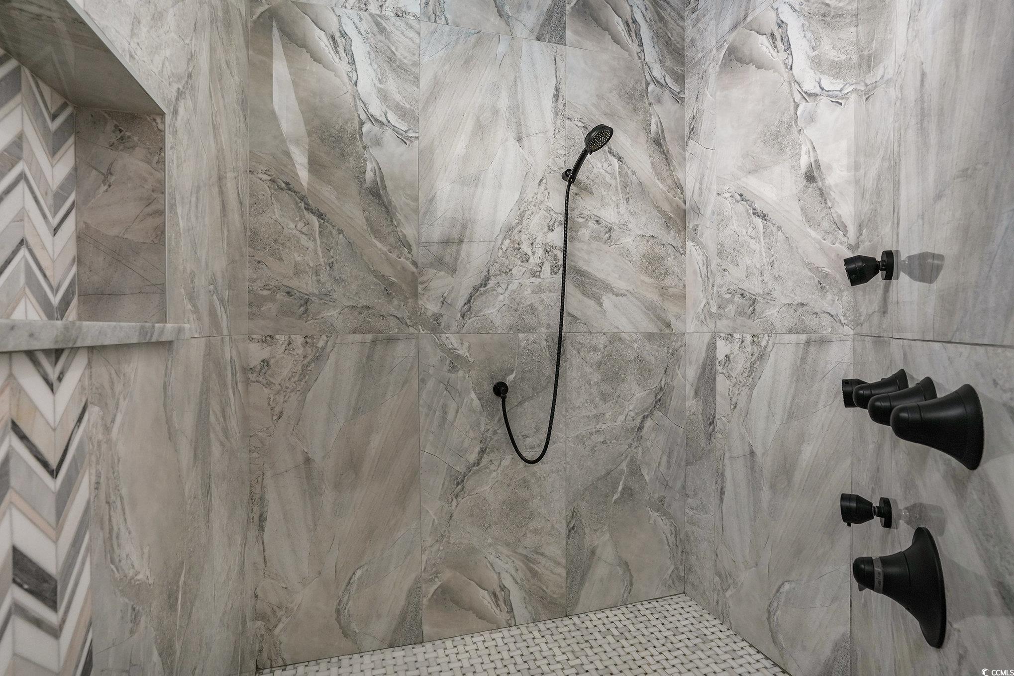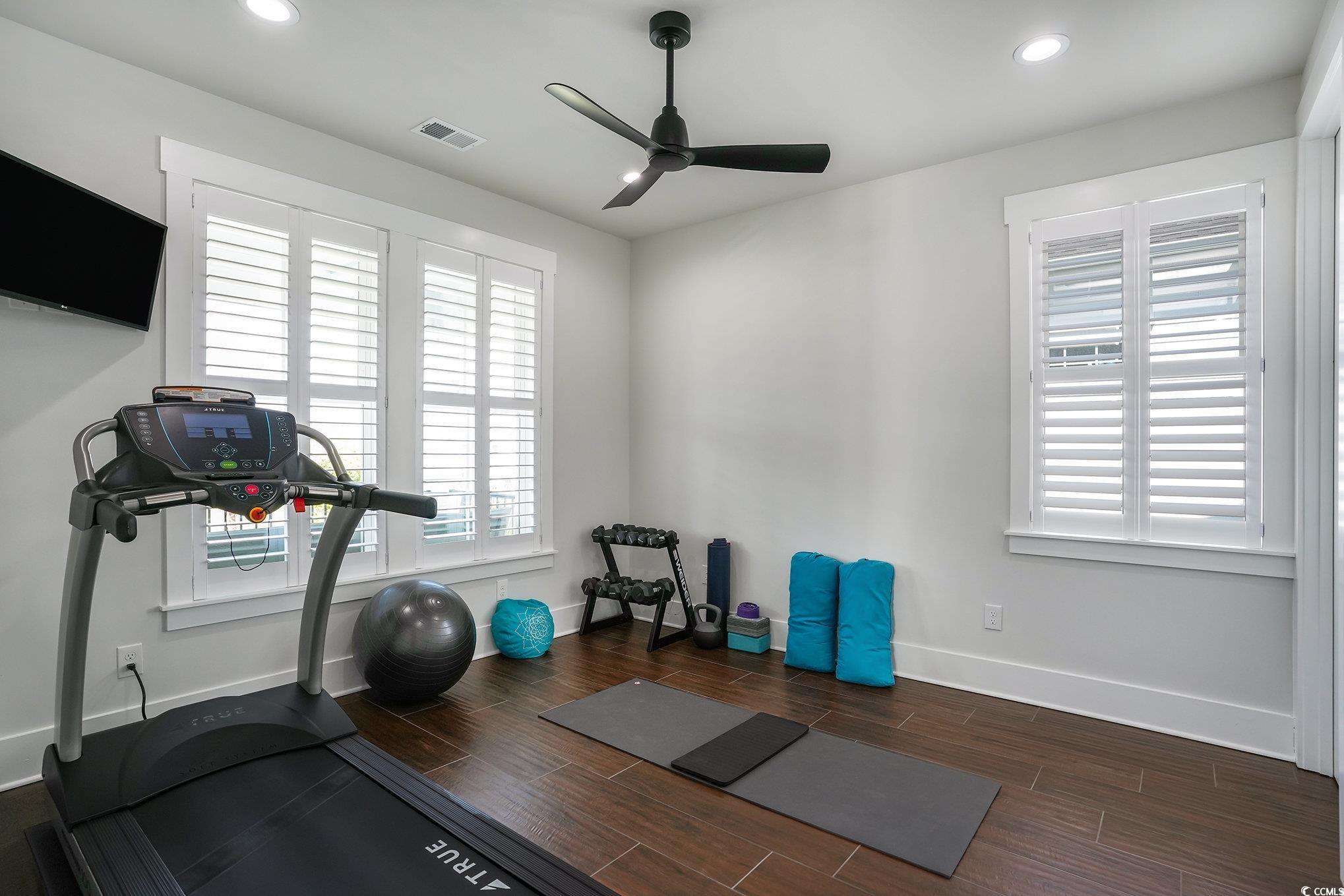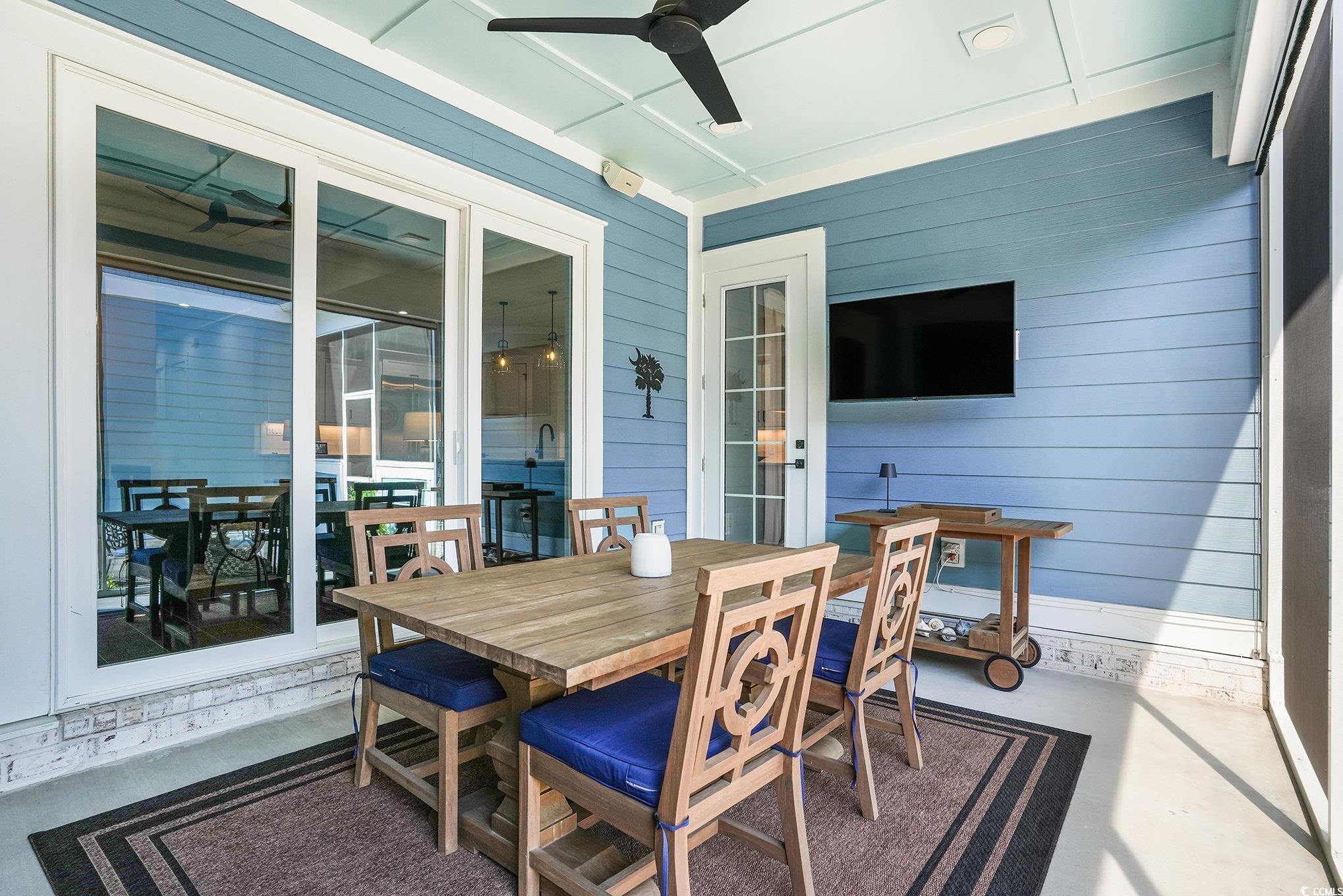 Welcome to this stunning Charleston-style, designer-built home in the prestigious gated community of Waterway Palms Plantation. This elegant residence combines timeless Southern charm with modern luxury, offering a perfect balance of indoor comfort and outdoor living. From the moment you arrive, you’ll be drawn to the home’s double front porches, coastal blue Hardie Plank siding, and inviting arched double-door entry. The lush landscaping with palms and magnolia trees frames the property beautifully, setting the tone for the refined living experience inside. The heart of this home is a bright, open-concept living and kitchen area that seamlessly blends style, warmth, and functionality. Anchored by a dramatic shiplap fireplace with a sleek linear flame. The living room features exposed wood beams, wide-plank flooring, and an abundance of natural light that pours in through windows and glass doors, leading to a private screened-in porch. It’s an inviting space designed for both everyday relaxation and entertaining guests. The adjoining chef’s kitchen is a true showpiece, featuring a massive island with seating for four, custom cabinetry, and designer lighting. Culinary enthusiasts will appreciate the JennAir appliances, the professional 10-burner gas range with dual ovens, warming drawer, custom vent hood, and convenient pot filler, while the built-in wine fridge and Chick-Fil-A style nugget ice maker elevate hosting. Enjoy pristine, refreshing water throughout the home with a whole-house water filtration system, complemented by a reverse osmosis purification system that supplies the nugget ice machine and water fountain tap. The kitchen flows effortlessly into the dining area, highlighted by elegant millwork, modern lighting, and room for family gatherings. Every detail of this space has been carefully curated. The luxurious first-floor primary suite is a true retreat, blending comfort and sophistication with thoughtful details throughout. The spacious bedroom is bathed in natural light from the large windows and elegantly finished with plantation blinds for privacy. A modern fireplace adds warmth and elegance, creating a cozy spot to unwind at the end of the day. The soft neutral palette, wood-look tile flooring, and stylish pendant lighting on each side of the bed provide a serene and upscale atmosphere. The en-suite bathroom is designed with spa-like finishes, including a double sink vanity with striking black countertops, contemporary mirrors, and designer fixtures. The oversized walk-in steam shower showcases floor-to-ceiling custom tilework, multiple showerheads, and built-in shelving for a sleek yet functional experience. Completing the suite is a generous walk-in closet system with custom shelving, drawers, and abundant hanging space, offering both organization and style. Beyond the primary suite, this home offers thoughtfully designed secondary bedrooms and versatile spaces that adapt to your family’s lifestyle. Each additional bedroom features neutral color palettes, creating welcoming retreats for family and visitors. Each bedroom also features their own bathrooms allowing privacy for family or guests. At the top of the stairs, the open loft serves as a game room and second living area, complete with access to the upper balcony. With room for a pool table, lounge seating, or media setup, it’s an entertainer’s dream. Tucked just off the loft, a flexible space is currently set up as a home gym, complete with large windows, durable flooring, and room for equipment or transform the space to your needs. Outdoor living shines with a retractable phantom-screened porch, full summer kitchen with Green Egg platform, and a gas-fed fire pit courtyard, all wrapped in classic southern charm with covered porches and a balcony. Waterway Palms Plantation is a coveted gated community on the Intracoastal Waterway offering resort-style amenities from a clubhouse and pool to tennis, playground, and private boat launch.