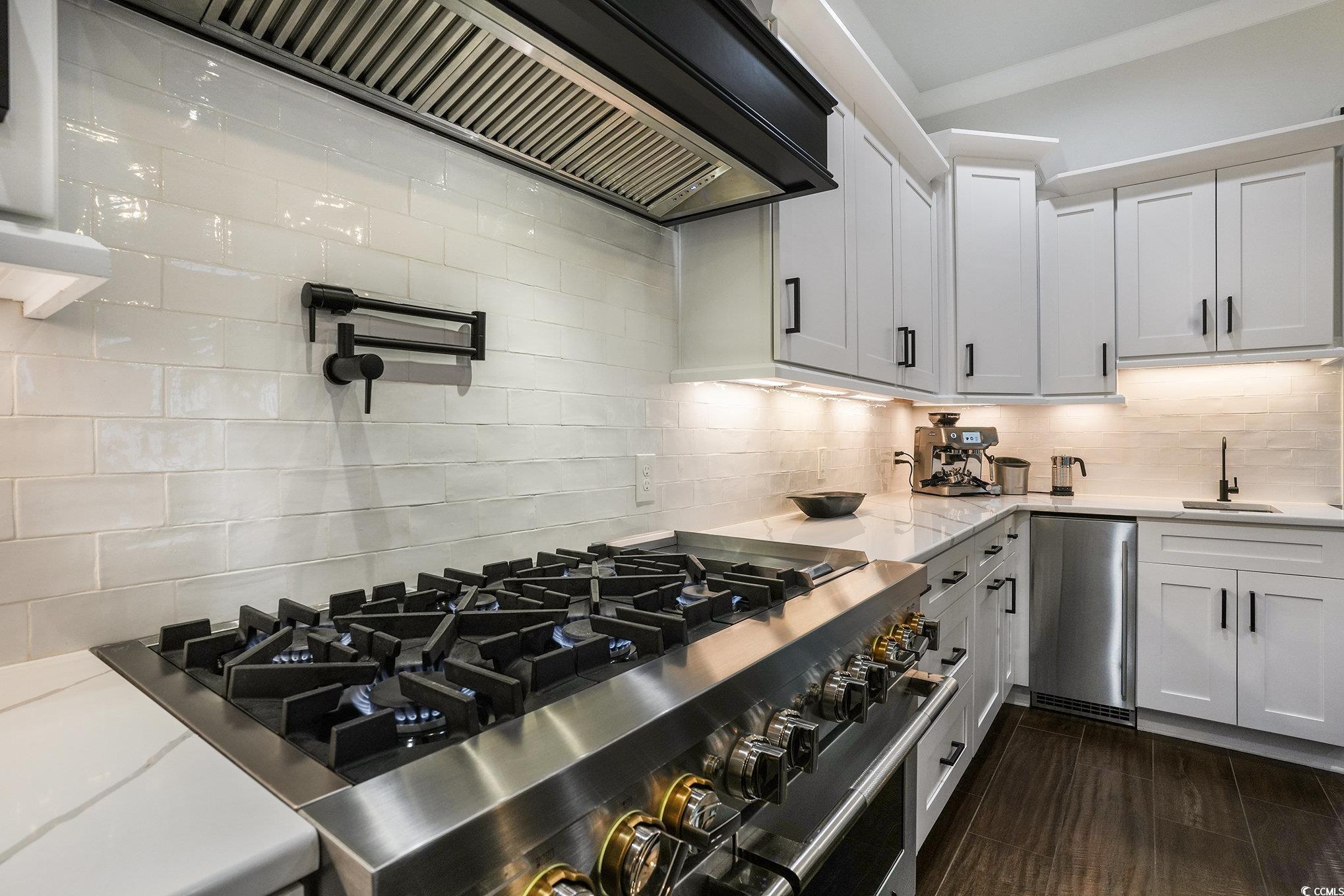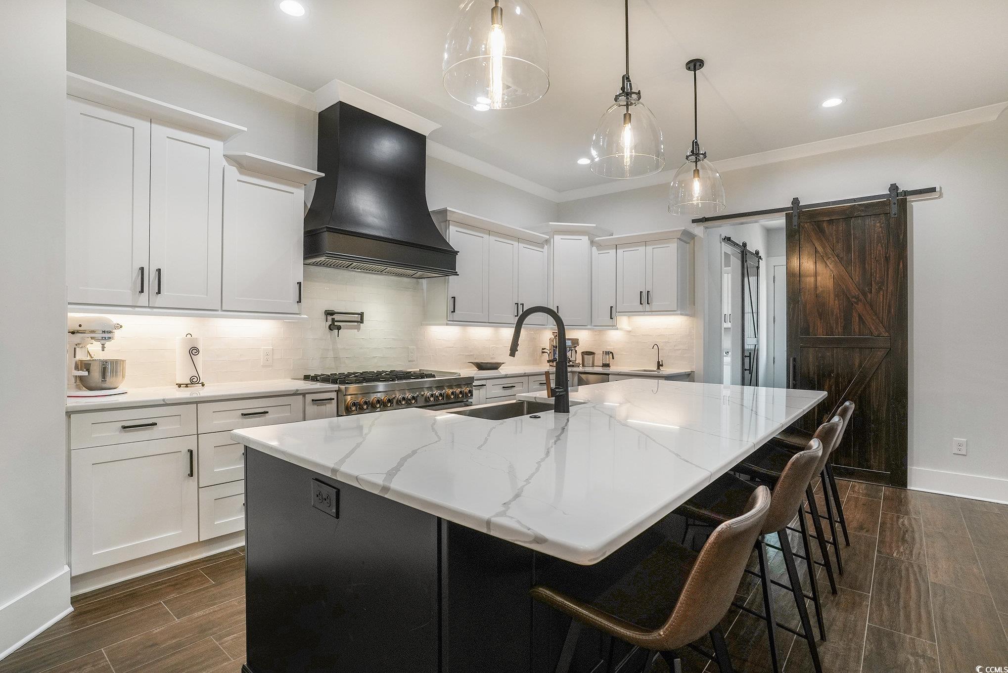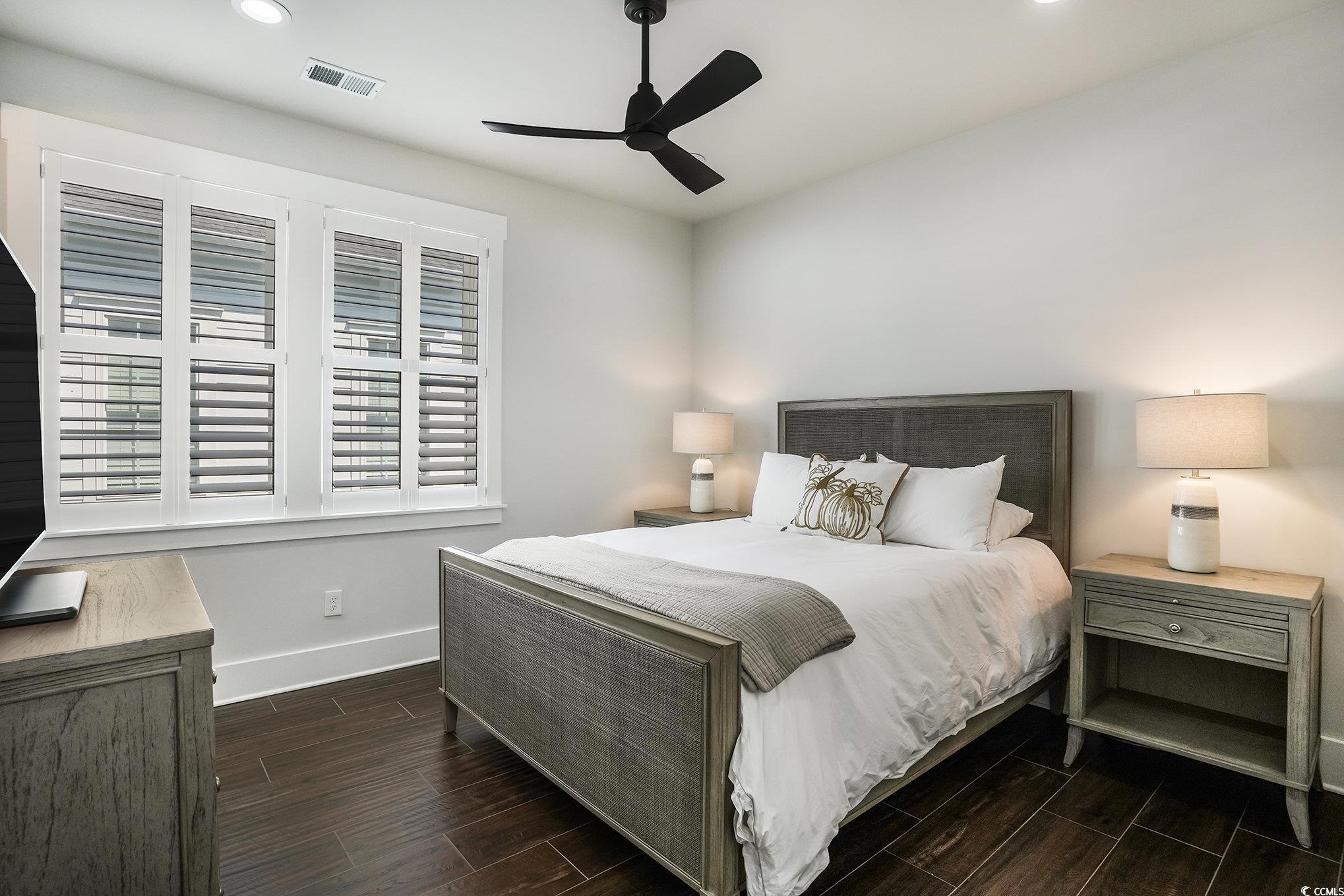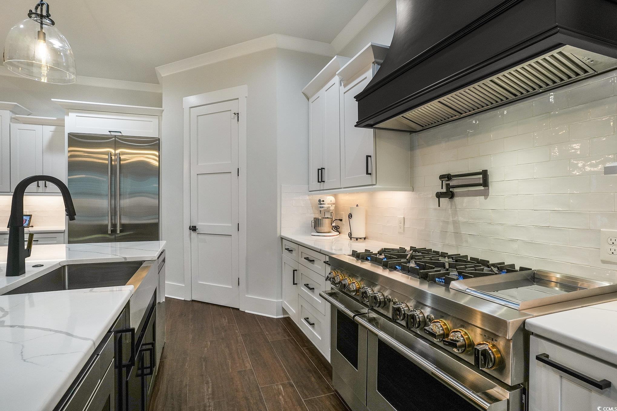 Welcome to this stunning Charleston-style, designer-built home in the prestigious gated community of Waterway Palms Plantation. This elegant residence combines timeless Southern charm with modern luxury, offering a perfect balance of indoor comfort and outdoor living. From the moment you arrive, you’ll be drawn to the home’s double front porches, coastal blue Hardie Plank siding, and inviting arched double-door entry. The lush landscaping with palms and magnolia trees frames the property beautifully, setting the tone for the refined living experience inside. The heart of this home is a bright, open-concept living and kitchen area that seamlessly blends style, warmth, and functionality. Anchored by a dramatic shiplap fireplace with a sleek linear flame. The living room features exposed wood beams, wide-plank flooring, and an abundance of natural light that pours in through windows and glass doors, leading to a private screened-in porch. It’s an inviting space designed for both everyday relaxation and entertaining guests. The adjoining chef’s kitchen is a true showpiece, featuring a massive island with seating for four, custom cabinetry, and designer lighting. Culinary enthusiasts will appreciate the JennAir appliances, the professional 10-burner gas range with dual ovens, warming drawer, custom vent hood, and convenient pot filler, while the built-in wine fridge and Chick-Fil-A style nugget ice maker elevate hosting. Enjoy pristine, refreshing water throughout the home with a whole-house water filtration system, complemented by a reverse osmosis purification system that supplies the nugget ice machine and water fountain tap. The kitchen flows effortlessly into the dining area, highlighted by elegant millwork, modern lighting, and room for family gatherings. Every detail of this space has been carefully curated. The luxurious first-floor primary suite is a true retreat, blending comfort and sophistication with thoughtful details throughout. The spacious bedroom is bathed in natural light from the large windows and elegantly finished with plantation blinds for privacy. A modern fireplace adds warmth and elegance, creating a cozy spot to unwind at the end of the day. The soft neutral palette, wood-look tile flooring, and stylish pendant lighting on each side of the bed provide a serene and upscale atmosphere. The en-suite bathroom is designed with spa-like finishes, including a double sink vanity with striking black countertops, contemporary mirrors, and designer fixtures. The oversized walk-in steam shower showcases floor-to-ceiling custom tilework, multiple showerheads, and built-in shelving for a sleek yet functional experience. Completing the suite is a generous walk-in closet system with custom shelving, drawers, and abundant hanging space, offering both organization and style. Beyond the primary suite, this home offers thoughtfully designed secondary bedrooms and versatile spaces that adapt to your family’s lifestyle. Each additional bedroom features neutral color palettes, creating welcoming retreats for family and visitors. Each bedroom also features their own bathrooms allowing privacy for family or guests. At the top of the stairs, the open loft serves as a game room and second living area, complete with access to the upper balcony. With room for a pool table, lounge seating, or media setup, it’s an entertainer’s dream. Tucked just off the loft, a flexible space is currently set up as a home gym, complete with large windows, durable flooring, and room for equipment or transform the space to your needs. Outdoor living shines with a retractable phantom-screened porch, full summer kitchen with Green Egg platform, and a gas-fed fire pit courtyard, all wrapped in classic southern charm with covered porches and a balcony. Waterway Palms Plantation is a coveted gated community on the Intracoastal Waterway offering resort-style amenities from a clubhouse and pool to tennis, playground, and private boat launch.