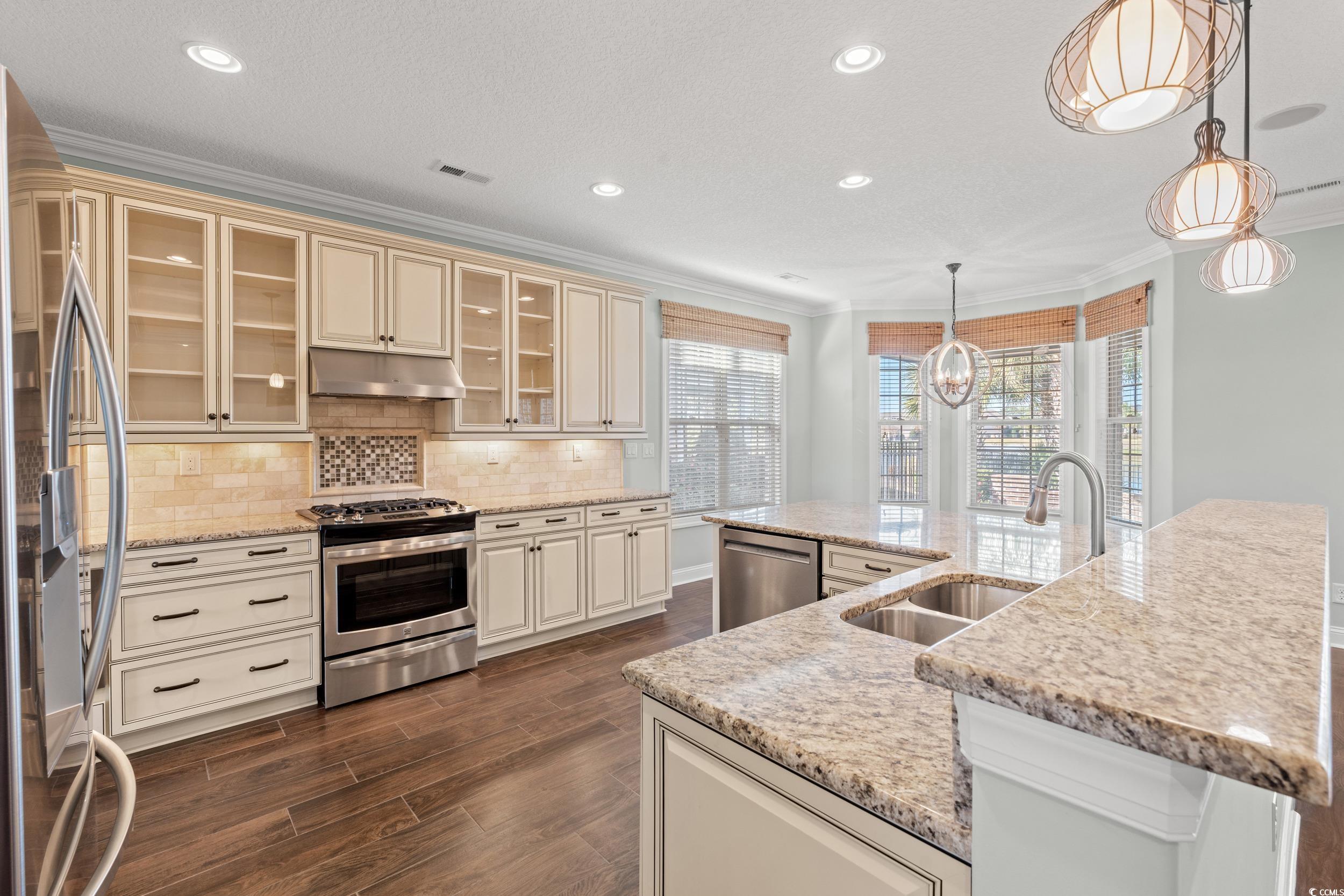 Come see this stunning custom built all brick home located in the most desired neighborhoods of Myrtle Beach-Grand Dunes. If you want a truly coastal designed private home with a resort like feel, this is it! Walk three blocks to the Ocean with private parking at the Ocean Club or three blocks to the Intercoastal Waterway for boating and fine dining. This home has 3 spacious bedrooms and 2.5 baths, a very open floor plan with a large gathering room, a beautiful kitchen that includes top of the line appliances, gas cooking, granite counter tops with counter seating, and a separate dining area with views of the lake and water fountain. The all-tile baths offer a spa with, a walk-in shower and more. You’ll fall in love with the outdoor living space that has a huge, covered lanai with remote screens, paver patio and decking. In addition, you’ll enjoy the custom closets, the extra storage areas, and the oversized finished garage with parking for two cars. This home is virtually maintenance free. This property has a low HOA fee, and is located close to the grocery stores, dining, hospitals, and membership to the Ocean Club.