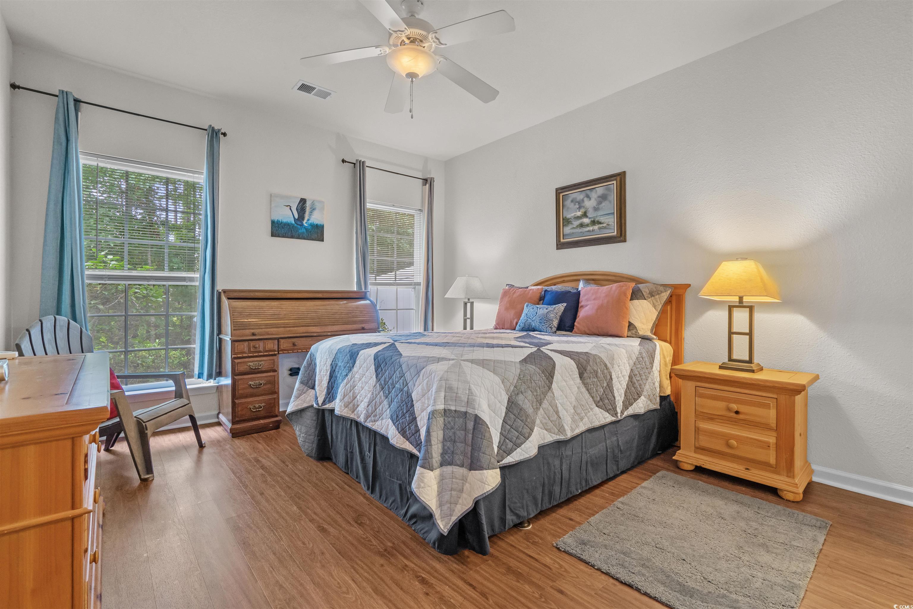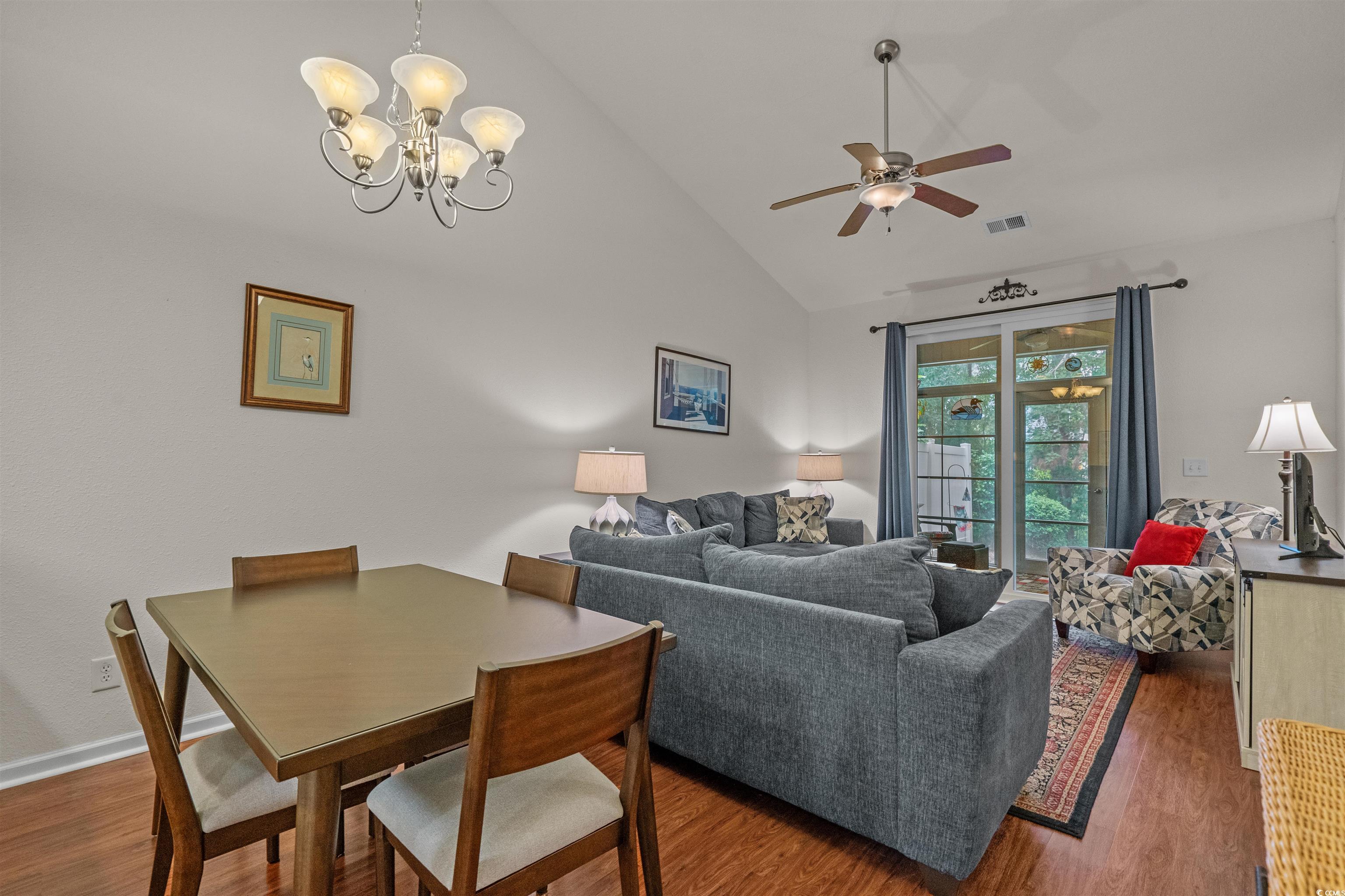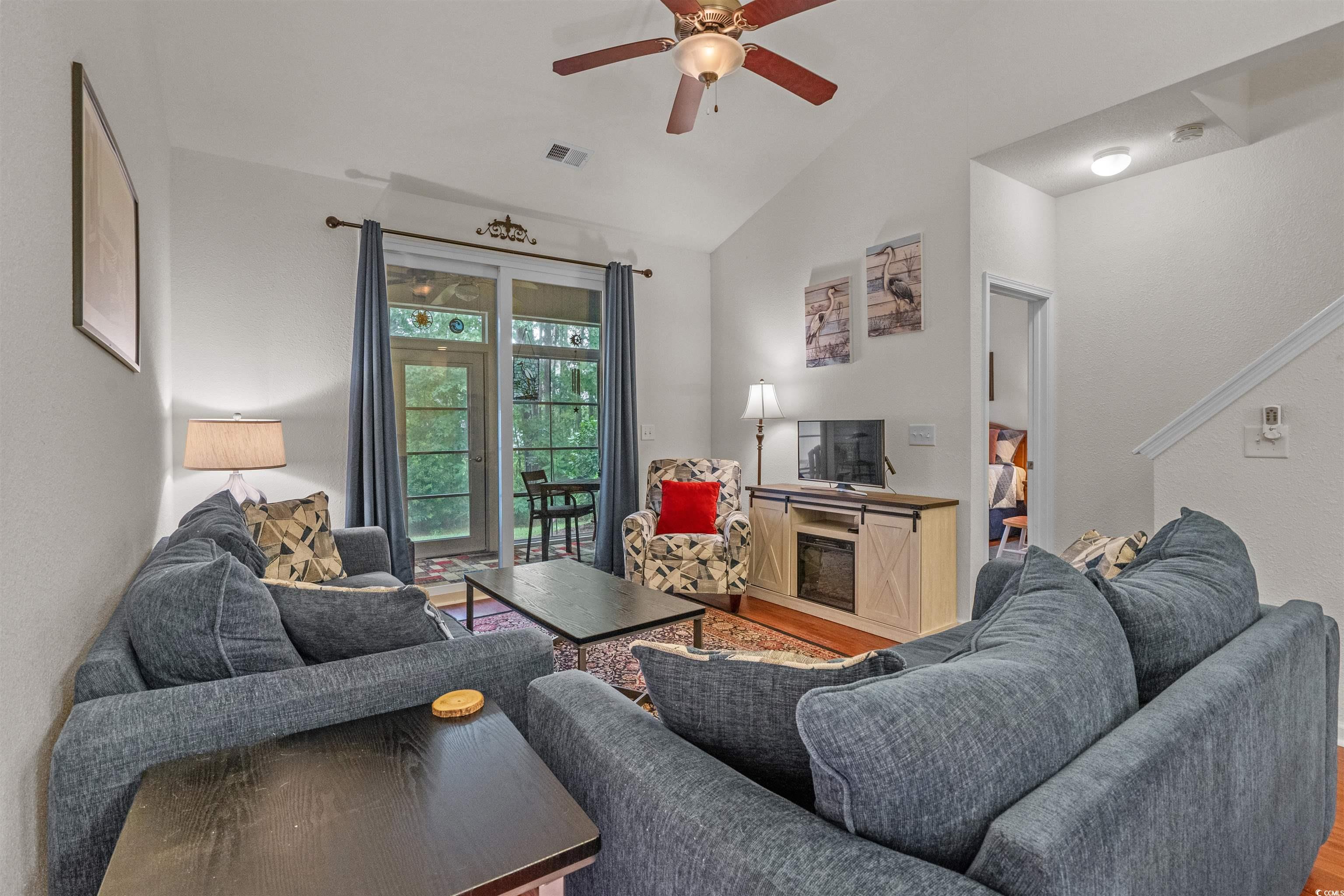 Welcome to this beautifully maintained and fully furnished 3-bedroom, 2.5-bathroom townhome-style condo in the highly sought-after Park West community of Murrells Inlet. Offering the perfect blend of comfort, style, and convenience, this spacious two-story residence is ideal for full-time living, vacationing, or as an investment. Step into a bright and airy living room featuring soaring vaulted ceilings, updated lighting, and laminate wood flooring that flows into the open-concept kitchen and dining area. The kitchen boasts abundant cabinetry, ample counter space, a center island, and a brand-new stainless steel refrigerator (2024). A convenient laundry closet with a washer and dryer is included. The first-floor primary suite offers a peaceful retreat, featuring large windows, a walk-in closet, and a private en-suite with dual sinks and a walk-in shower. Upstairs, two generously sized guest bedrooms and a full bath offer plenty of room for family and visitors. Enjoy your morning coffee on the welcoming front porch, or unwind in the rear screened-in porch enhanced with 2023 Sunspace WeatherMaster vinyl windows and ceiling fan—perfect for enjoying serene wooded views year-round. A private backyard with lush landscaping and white vinyl fencing adds an extra touch of privacy. Park West offers a sparkling outdoor pool and walking paths. HOA dues include cable, internet, lawn care, exterior maintenance, and trash service. Located minutes from the Murrells Inlet MarshWalk, medical facilities, golf, restaurants, shopping, and the beach—this condo checks all the boxes for relaxed Lowcountry living. Don’t miss this opportunity to own a move-in-ready, turnkey home in one of the area’s most desirable communities!