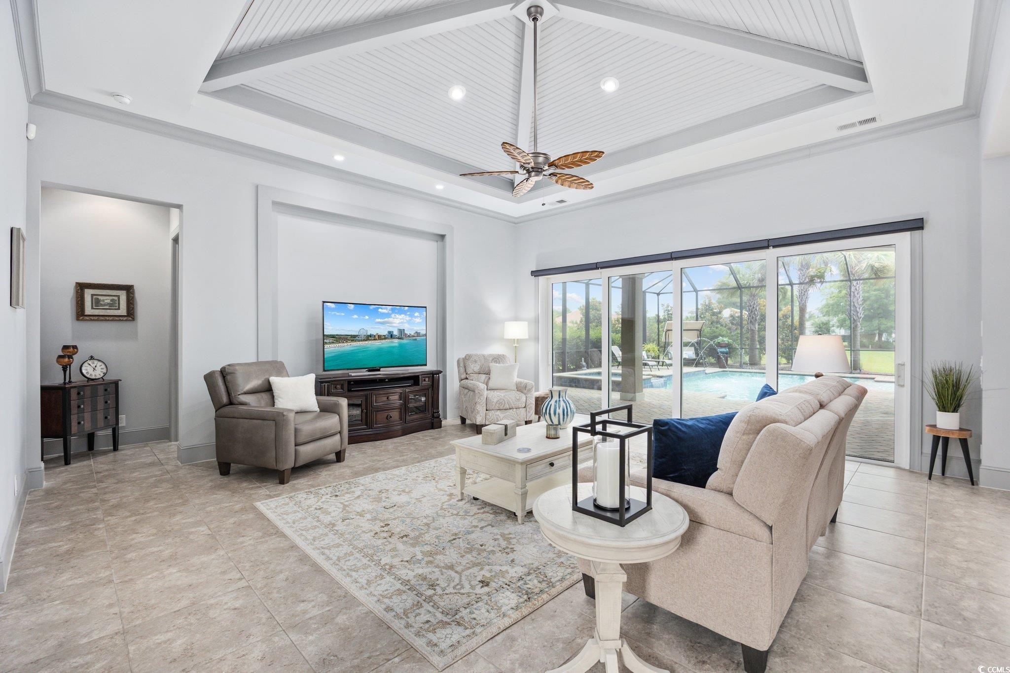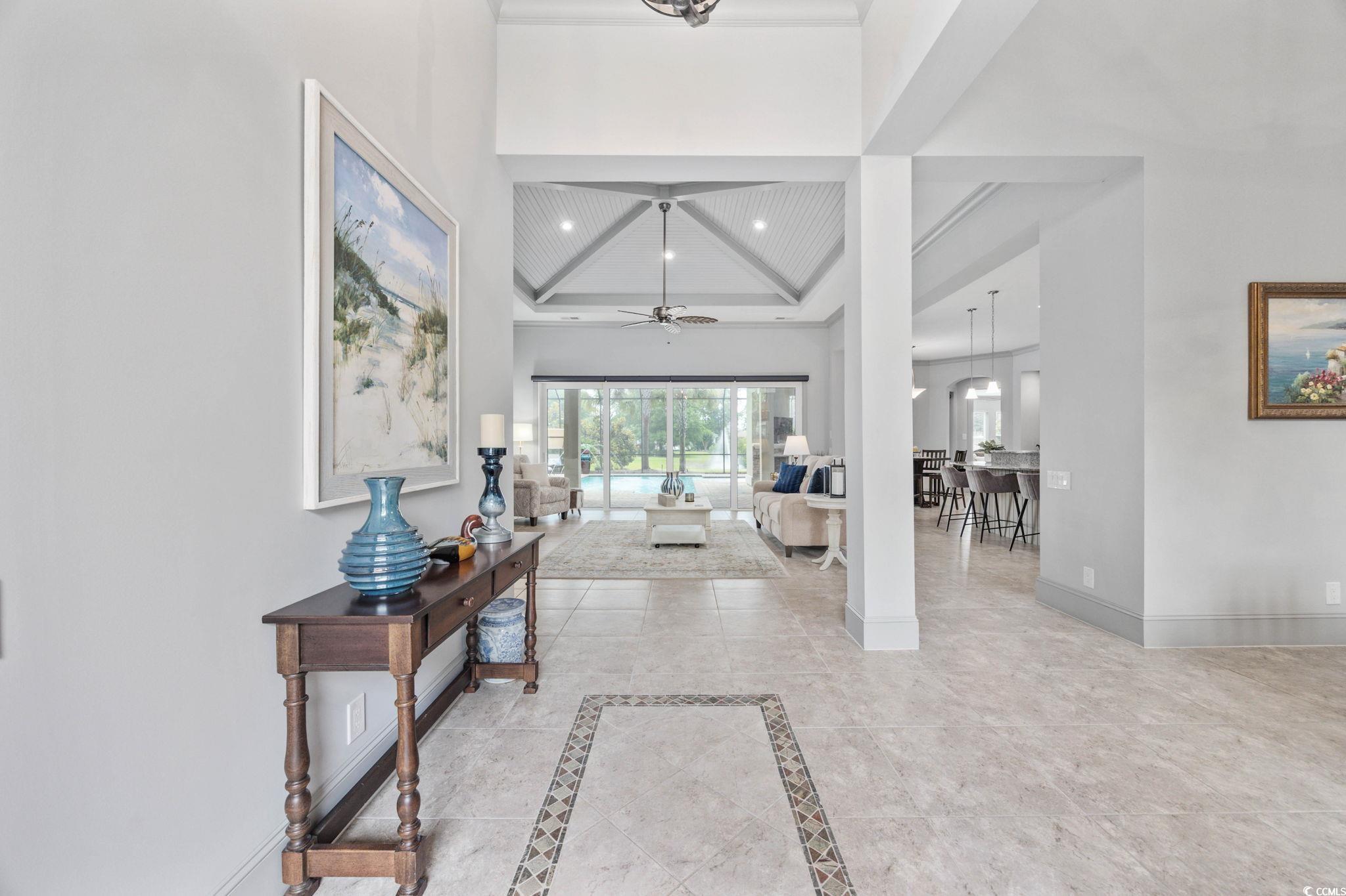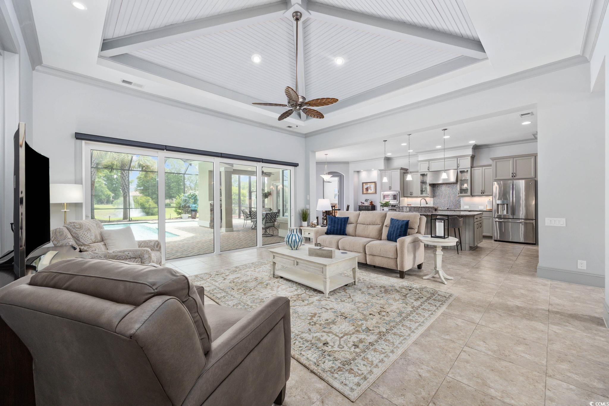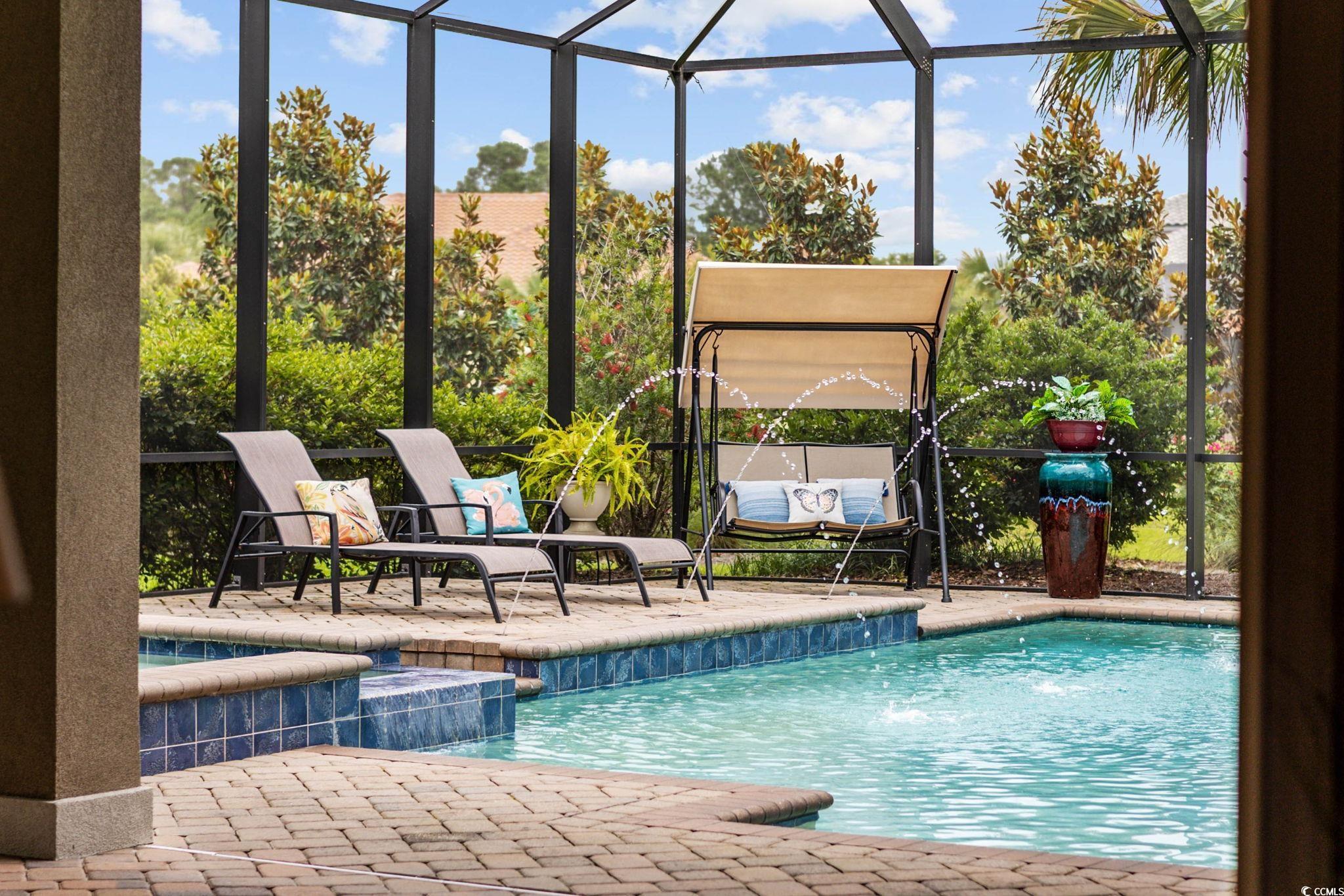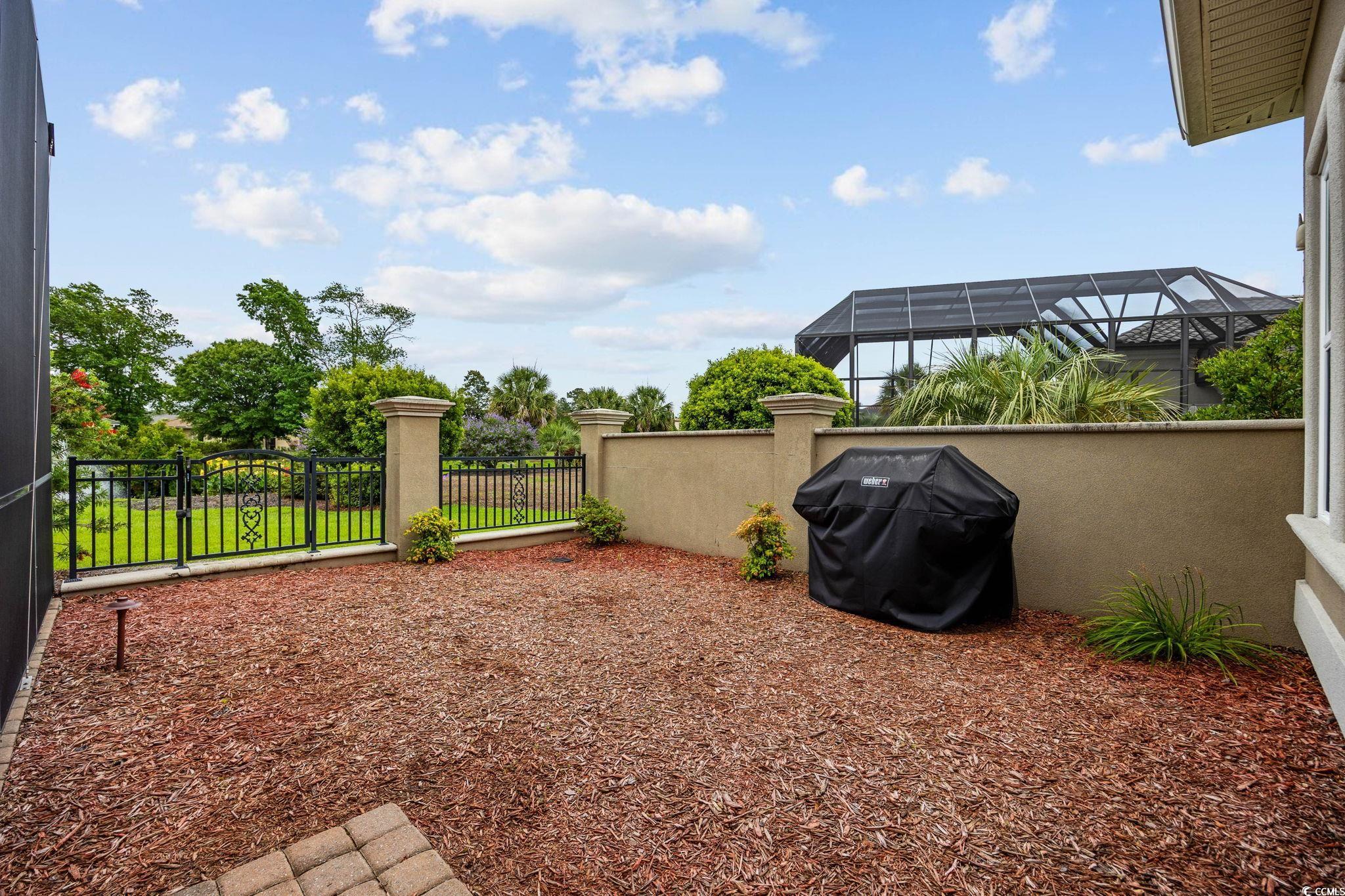 Welcome to this exquisite custom-built residence set within the prestigious double-gated Palermo section of Grande Dunes Golf Village in Myrtle Beach, South Carolina. This immaculate four-bedroom (3 Bedrooms + den/office), three-bath home with a spacious three-car garage offers the perfect blend of refined interior design, luxury features, and resort-style outdoor living. Located on a serene pond lot, the home is thoughtfully designed for both relaxation and entertaining. As you enter through the foyer, you are immediately drawn to the soaring beamed tray ceiling with custom detail and the open-concept layout filled with natural light- ideal ambiance for entertaining and everyday living. The heart of the home is the gourmet kitchen, featuring a large center island ideal for gathering, glass accent cabinetry perfect for displaying fine pieces, a wine cooler, a generous walk-in pantry, and a secondary walk-in pantry just off the spacious laundry room. The kitchen flows seamlessly into the living area where new remote-controlled blinds and oversized sliding glass doors create a welcoming ambiance that connects the indoors with the lanai. The primary suite is a peaceful retreat, featuring double-tray ceilings, a spa-like bathroom with separate dual vanities along with a makeup area, a soaking tub, a large tiled walk-in shower, linen closet, a private water closet and precisely placed windows provide great natural lighting. One highlight is the expansive custom walk-in closet with a custom organizer system. A private door leads from the primary bedroom directly to the screened lanai and pool area. Two guest bedrooms (Bedroom 2 features private en-suite bathroom) offer large walk-in closets while the fourth bedroom serves as a bright and versatile flex space with ample windows and sliding doors to the lanai.This room is ideal as a home office, den, or fourth bedroom, with a designated space for a closet -ready for doors and shelving. Spacious laundry room with washer and dryer offers functionality and style, featuring a utility sink, expansive folding area, extensive cabinetry, and a generous hanging rack to make everyday tasks effortless. Just off the laundry room, a secondary walk-in pantry or utility closet provides convenient storage for household essentials to keep your home beautifully organized. Spacious three-car garage will accommodate multiple vehicles, golf cart, or additional storage. Owners added a professionally coated epoxy floor for durability and easy maintenance, along with new cabinetry for storage. Step outside to your private oasis. The screened lanai is designed for year-round enjoyment, with a cozy outdoor fireplace, ceiling fans, and ample space for lounging and dining. The resort-style saltwater pool has a tanning ledge, deck jets, bubbling spillover hot tub, and ambient LED mood lighting. Mature landscaping and newly planted privacy trees add a lush, tropical backdrop to the outdoor space. Just off the lanai is a fenced private courtyard ideal for grilling or a secure pet retreat. Energy efficient tankless hot water heater. Additional features include a whole-house water softener system, new lanai screen doors, landscape lighting, security system, and pull-down attic storage. Situated within the exclusive Grande Dunes master-planned community, residents enjoy world-class amenities including the 25,000 SF private Ocean Club with oceanfront pools, fine dining, and private beach access. The community also offers an award-winning 18-hole championship golf course, deep-water marina, tennis facilities, fitness centers, on-site dining, and miles of biking and walking trails. All of this is located just minutes from the beach, shopping, restaurants, and medical centers—yet tucked away in a serene, resort-style setting. This is your opportunity to own a luxurious coastal residence that perfectly blends elegance, comfort, and lifestyle in one of the most desirable neighborhoods along the South Carolina coast.