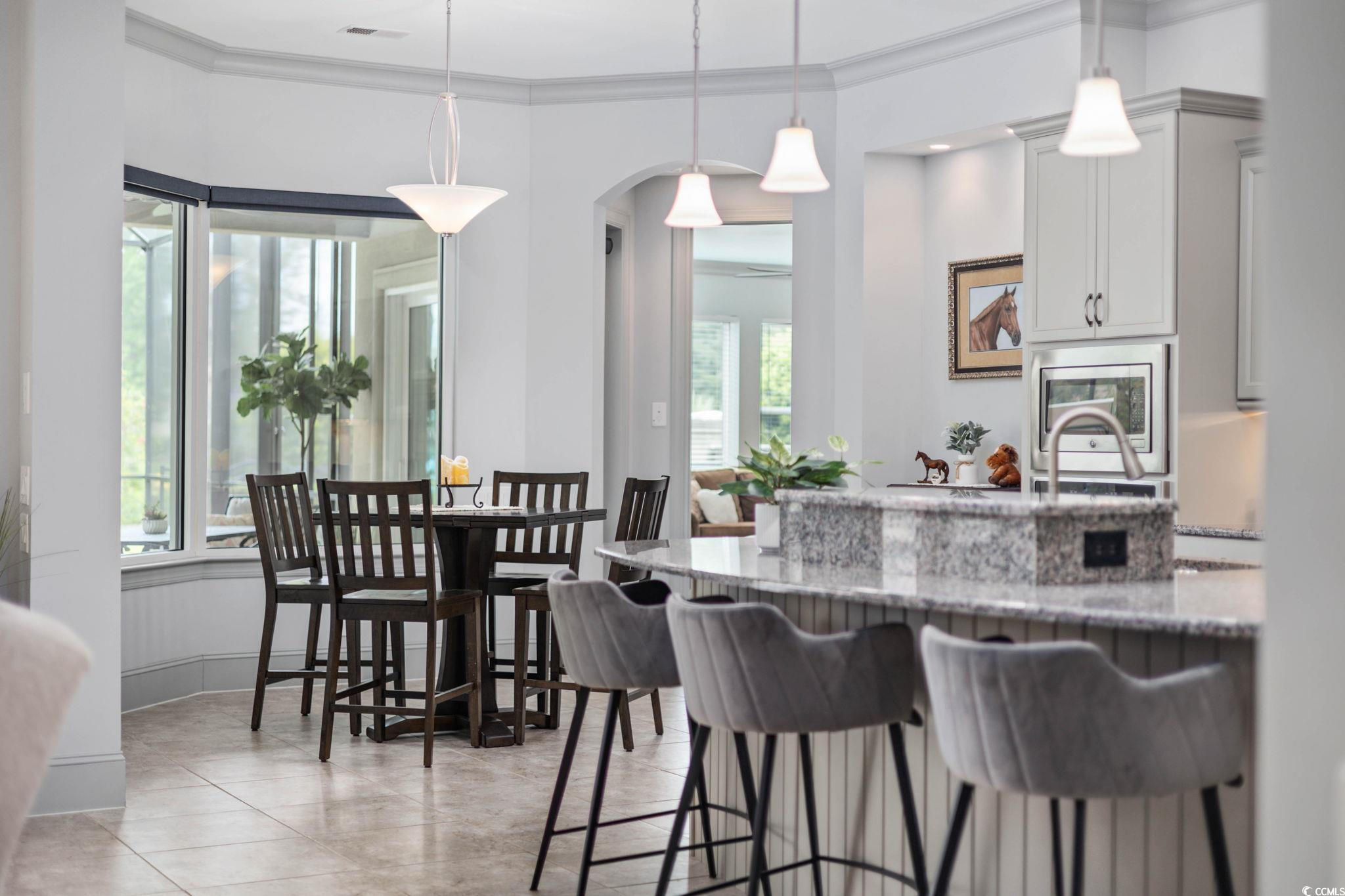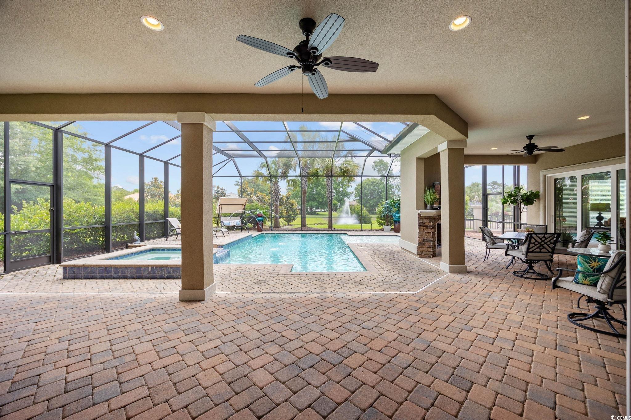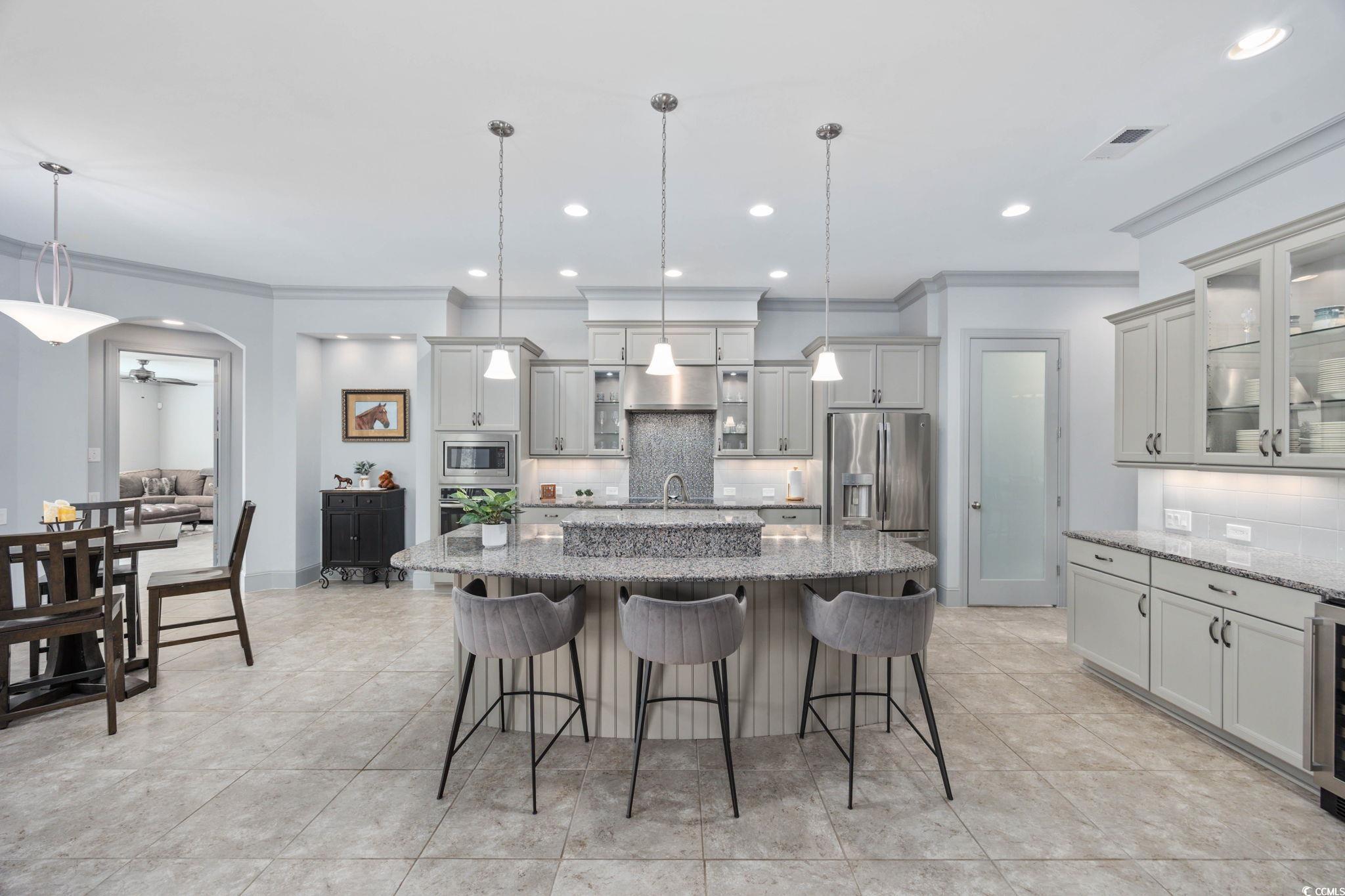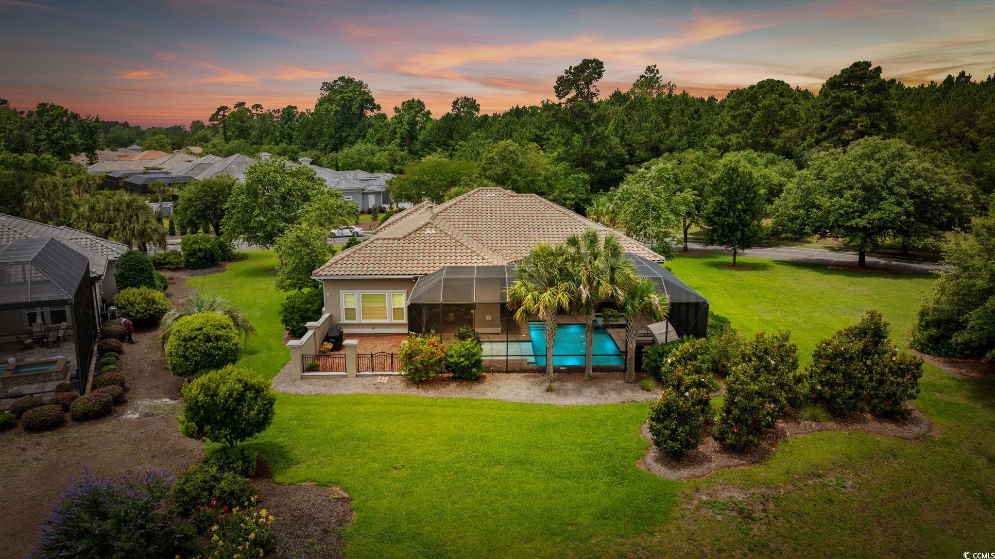 Welcome to this exquisite custom-built residence set within the prestigious double-gated Palermo section of Grande Dunes Golf Village in Myrtle Beach, South Carolina. This immaculate four-bedroom (3 Bedrooms + den/office), three-bath home with a spacious three-car garage offers the perfect blend of refined interior design, luxury features, and resort-style outdoor living. Located on a serene pond lot, the home is thoughtfully designed for both relaxation and entertaining. As you enter through the foyer, you are immediately drawn to the soaring beamed tray ceiling with custom detail and the open-concept layout filled with natural light- ideal ambiance for entertaining and everyday living. The heart of the home is the gourmet kitchen, featuring a large center island ideal for gathering, glass accent cabinetry perfect for displaying fine pieces, a wine cooler, a generous walk-in pantry, and a secondary walk-in pantry just off the spacious laundry room. The kitchen flows seamlessly into the living area where new remote-controlled blinds and oversized sliding glass doors create a welcoming ambiance that connects the indoors with the lanai. The primary suite is a peaceful retreat, featuring double-tray ceilings, a spa-like bathroom with separate dual vanities along with a makeup area, a soaking tub, a large tiled walk-in shower, linen closet, a private water closet and precisely placed windows provide great natural lighting. One highlight is the expansive custom walk-in closet with a custom organizer system. A private door leads from the primary bedroom directly to the screened lanai and pool area. Two guest bedrooms (Bedroom 2 features private en-suite bathroom) offer large walk-in closets while the fourth bedroom serves as a bright and versatile flex space with ample windows and sliding doors to the lanai.This room is ideal as a home office, den, or fourth bedroom, with a designated space for a closet -ready for doors and shelving. Spacious laundry room with washer and dryer offers functionality and style, featuring a utility sink, expansive folding area, extensive cabinetry, and a generous hanging rack to make everyday tasks effortless. Just off the laundry room, a secondary walk-in pantry or utility closet provides convenient storage for household essentials to keep your home beautifully organized. Spacious three-car garage will accommodate multiple vehicles, golf cart, or additional storage. Owners added a professionally coated epoxy floor for durability and easy maintenance, along with new cabinetry for storage. Step outside to your private oasis. The screened lanai is designed for year-round enjoyment, with a cozy outdoor fireplace, ceiling fans, and ample space for lounging and dining. The resort-style saltwater pool has a tanning ledge, deck jets, bubbling spillover hot tub, and ambient LED mood lighting. Mature landscaping and newly planted privacy trees add a lush, tropical backdrop to the outdoor space. Just off the lanai is a fenced private courtyard ideal for grilling or a secure pet retreat. Energy efficient tankless hot water heater. Additional features include a whole-house water softener system, new lanai screen doors, landscape lighting, security system, and pull-down attic storage. Situated within the exclusive Grande Dunes master-planned community, residents enjoy world-class amenities including the 25,000 SF private Ocean Club with oceanfront pools, fine dining, and private beach access. The community also offers an award-winning 18-hole championship golf course, deep-water marina, tennis facilities, fitness centers, on-site dining, and miles of biking and walking trails. All of this is located just minutes from the beach, shopping, restaurants, and medical centers—yet tucked away in a serene, resort-style setting. This is your opportunity to own a luxurious coastal residence that perfectly blends elegance, comfort, and lifestyle in one of the most desirable neighborhoods along the South Carolina coast.