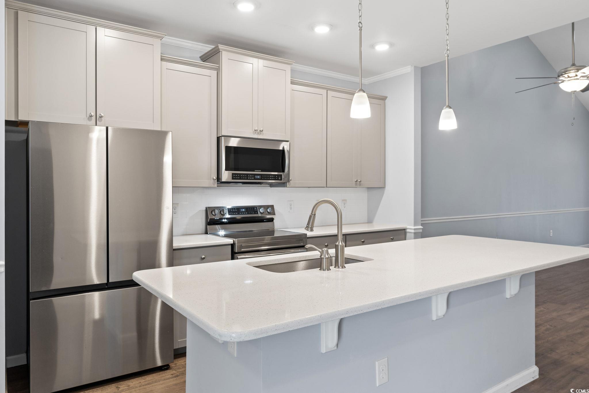 Upgraded 3-bedroom townhome with pond views in Carolina Forest, Myrtle Beach featuring a first-floor primary suite, screened porch, private courtyard, and modern upgrades throughout. Welcome to this beautifully upgraded 3-bedroom, 2-bath townhome in the highly desirable Carolina Forest area of Myrtle Beach, South Carolina. Built in 2018 and thoughtfully enhanced since, this move-in-ready home offers an inviting open-concept floor plan, stylish finishes, and the convenience of low-maintenance living in one of the Grand Strand’s most sought-after communities. Inside, the home features luxury vinyl plank flooring, crown molding, chair rail accents, and abundant natural light, creating a bright and polished living space. The open living and dining areas flow seamlessly into the kitchen, making the layout perfect for both everyday living and entertaining guests. The spacious kitchen offers stainless-steel appliances, ample cabinetry, and a large center island, providing plenty of room for cooking, gathering, and hosting. The main-level primary suite provides privacy and convenience, featuring a remodeled en-suite bathroom with a beautifully tiled walk-in shower and generous closet space. Two additional bedrooms offer flexibility for guests, a home office, hobby space, or additional living needs. Highlights Buyers Love: • First-floor primary suite • Screened-in porch with peaceful pond view • Luxury vinyl plank flooring throughout main living areas • Stainless-steel appliances and large kitchen island • Private gated front courtyard • One-car garage and widened driveway • Whole-house water filtration system • Custom closet shelving for added organization Additional upgrades include sun tubes for natural light, upgraded ceiling fans and fixtures, and a well-maintained HVAC system, making this home both comfortable and thoughtfully improved. Step outside to the screened rear porch overlooking a tranquil pond, complete with sun shades and a ceiling fan—the perfect place to relax and enjoy Myrtle Beach’s coastal evenings. Residents enjoy community amenities including a swimming pool and professionally maintained grounds, offering a low-maintenance lifestyle many buyers seek in Carolina Forest. Located in the heart of Carolina Forest in Myrtle Beach, this home provides easy access to Highway 31 and Highway 501, placing you just minutes from shopping, dining, golf courses, top-rated schools, and the beaches of the Grand Strand. Townhomes with pond views, modern upgrades, and this level of convenience in Carolina Forest don’t come available often—making this an excellent opportunity to own in one of Myrtle Beach’s most desirable areas.