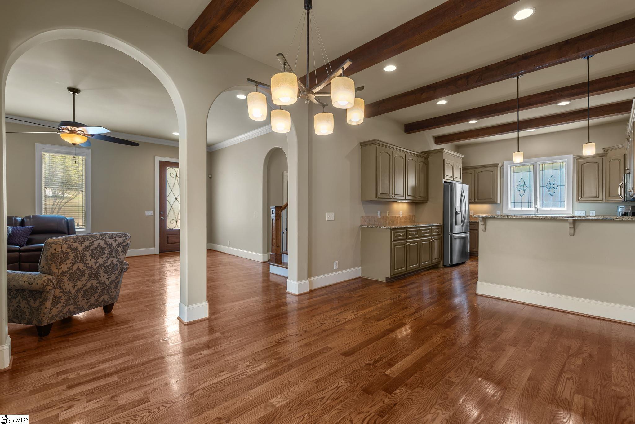 From the moment you arrive, 8 Arezzo Drive delivers a welcoming first impression with established landscaping, flower-filled window boxes, wood shutters and Juliette balcony with ironwork accents. Enter through the solid wood door with leaded glass and iron scroll detail, and you’re greeted with gleaming hardwoods, crown molding and large light-filled windows. The focal point of this impressive space is the floor-to-ceiling custom stone fireplace with stone mantle, raised hearth and gas-logs that offer both ambience and a secondary heat source. Continue through the oversized arched doorways into the open-concept kitchen/dining area boasting a Tuscan-inspired stone wall and wood-beamed ceiling harkening elements of traditional Italian architecture. The kitchen is oversized offering abundant cabinet storage, plenty of counter space for meal prep, stainless appliances, bar seating for three and a walk-in pantry for dry goods. Host a larger group of 8-10 comfortably in the dining room that’s also cozy for a party of four, while overlooking the covered and open patios for year-round indoor/outdoor living. Off the patio is a grassed side yard and an ideal spot for a garden, water feature or pet area. It’s enclosed by a 5-foot-tall black aluminum fence so dogs and kids can play without worry, and there’s a locking front gate for convenient access to the neighborhood. A private primary suite is tucked away at the back of the house and offers large windows, two walk-in closets with custom closet systems, a vanity with dual sinks, fully tiled shower, separate garden tub, water closet and substantial linen closet. Also on the main floor is a second bedroom and full bathroom, ideal for guests as it’s located at the front of the house, or as a home office, flex room or nursery. A spacious walk-in laundry room with cabinet storage, a second pantry/storage space, and attached rear-entry two-car complete the main level. Follow the hardwoods and ironwork upstairs and find a HUGE 22x17 bonus room with a multitude of uses like a media room, home gym or playroom, a large bedroom and full bathroom. For those needing storage space, the walk-in attic does not disappoint and delivers 300 sf to stow personal items. 8 Arezzo Drive is in Montebello, an established amenity-rich community with a newly renovated club house, tennis/pickleball court, pool, playground, lakes for fishing, bocce ball court and several pocket parks. This neighborhood is active and social with weekly, monthly, and annual events for neighbors to connect. All this minutes from downtown Greenville, Swamp Rabbit Trail, Travelers Rest and Furman University.