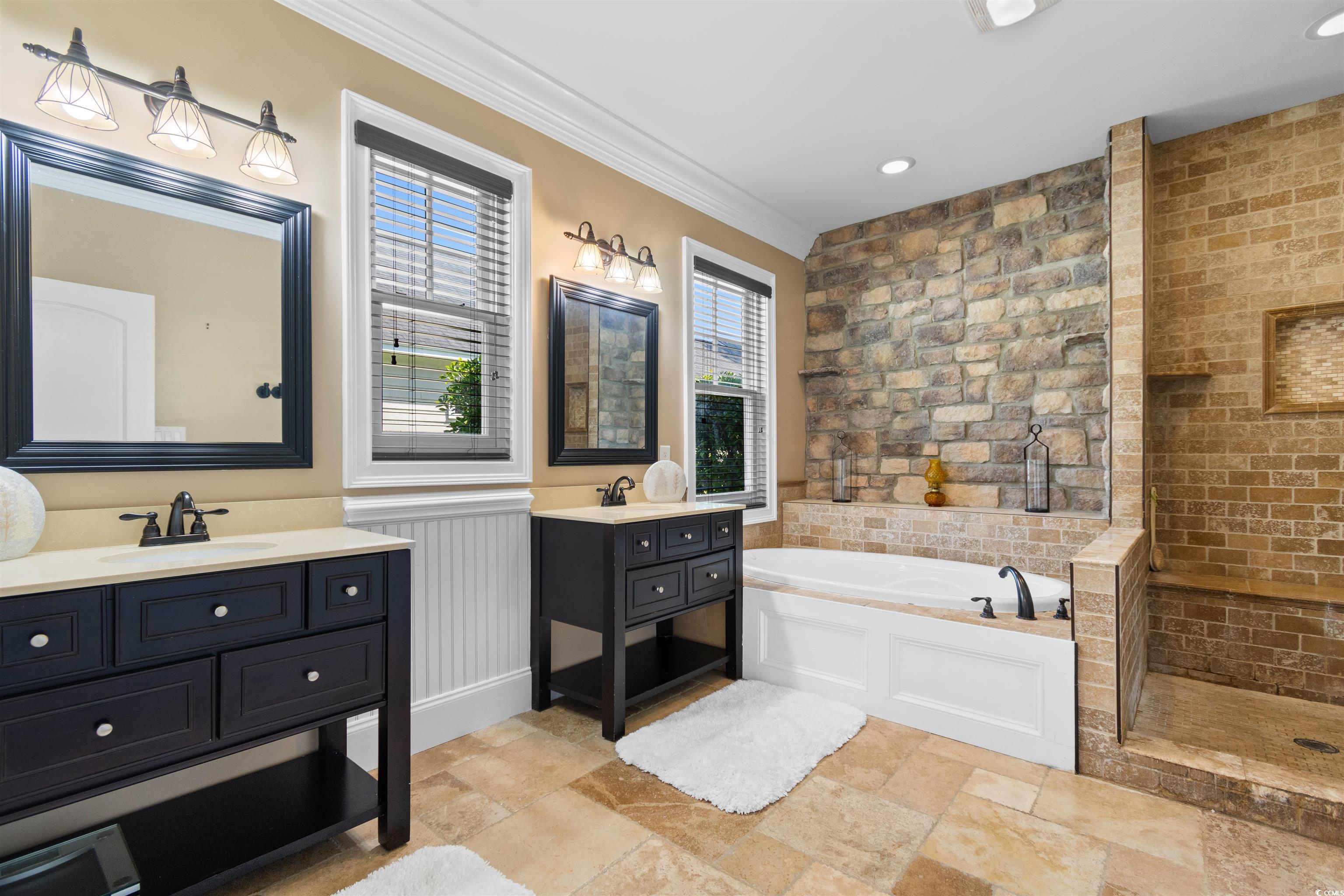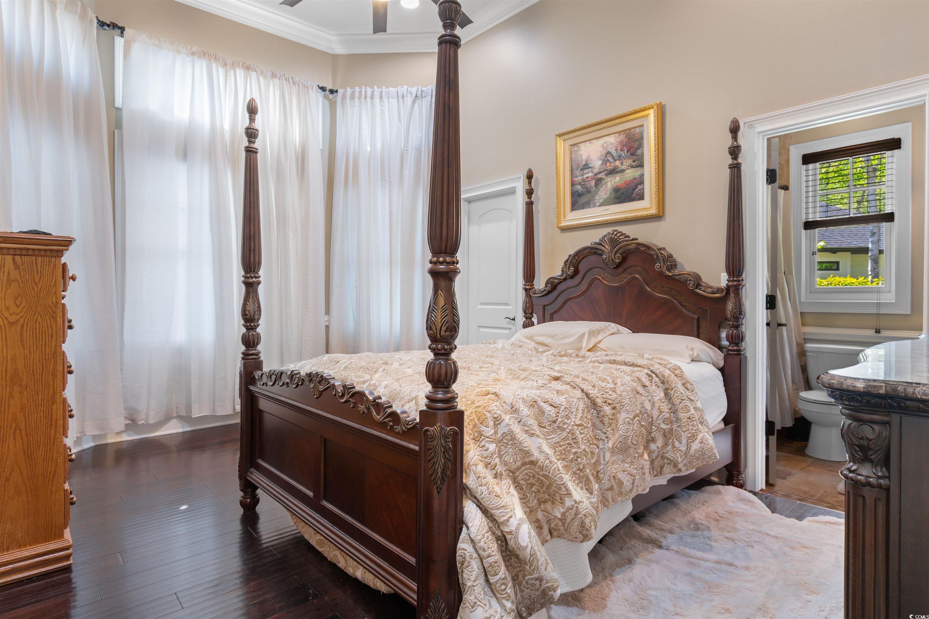 MOTIVATED SELLERS and significant price drop. Home recently painted, new built-ins added in pantry and updated outdoor fireplace. Home is being offered with one-year 2-10 Supreme Home Warranty. Select furnishings convey, please see below. Welcome to 8008 McSweeney Court in Cypress River Plantation. This stunning, custom-built, 4 bedroom, 4.5 bath, 3.5 car garage home is brimming with high-end features. As you drive down the quiet cul-de-sac street and approach this amazing property, you'll be captivated by the meticulously landscaped grounds, expansive driveway, and nearly 1.2 acres of wooded land adjacent to a community pond, creating a private backyard oasis where you can sit by the outdoor fireplace and enjoy the gentle breeze and observe wildlife. Upon entering the arched double front doors, you're greeted by soaring 13.5' coffered ceilings in both the Dining Room and Great Room, complemented by stone tile and plank flooring, and crown molding throughout. The Great Room's feature is a floor-to-ceiling stone fireplace. The kitchen, a true showpiece, features a full stone arch wall, high-end appliances including a Wolf gas stove, Viking vented hood, Sub-Zero refrigerator, two built-in wall convection ovens, a separate food warming drawer, and a microwave. Granite counters complement the numerous cabinets for ample storage and the enormous center island. The eat-in kitchen area, bathed in natural light from 9' ceilings, offers a fantastic view of the wooded property and ample space for a table seating six. The first floor includes 3 bedrooms, 3.5 baths, a dedicated office, and an oversized laundry room. The primary bedroom is a true retreat, with space for a sitting and TV area, two enormous custom closets, separate dual vanities, a custom stone tile frameless shower, and a jacuzzi soaking tub oasis surrounded by a stone wall. The additional first-floor bedrooms, located on the opposite side of the home for added privacy, each have their own ensuite bath, with the rear bedroom offering access to the rear paver stone covered patio. The office, with its double French doors, curved bump-out design, large windows, 11' vaulted ceiling, and plank flooring, provides significant space for a large desk and work-from-home options. This office can also double as a fifth bedroom or an in-law suite sitting room/bedroom combo area. Upstairs, you'll find an enormous bonus room with a full bathroom, currently used as a bedroom but easily convertible to a gaming room. It includes hardwood floors and direct access to a dedicated theater room for movie nights with friends and family, complete with reclining theater seating included in the home purchase. Clean-up is a breeze for this home with the luxury of a Central Vacuum system inside, gutter guards on gutters outside, and never run out of hot water with a tankless hot water system. Included in the home sale are all wall mounted televisions, all appliances, the washer & dryer, all window treatments (including 3M window tinting on the front windows), garage storage shelving, theater room seating, and all light fixtures. One year Home Warranty will be provided by Sellers at closing. Cypress River Plantation is a gated and 24-hour guard secured neighborhood with amazing amenities that include a private community boat launch to the Waccamaw River, boat storage options, clubhouse with fitness center, a giant pool and kiddie pool, outdoor kitchen stations, tennis, pickleball, basketball, and miles of dedicated sidewalks and roads for walks, biking, and golf carts rides. The community hosts numerous events with past events including a car show, food truck nights, live band parties, and golf cart parades. Welcome to the Cypress River Plantation lifestyle and Welcome Home to 8008 McSweeney Court!
