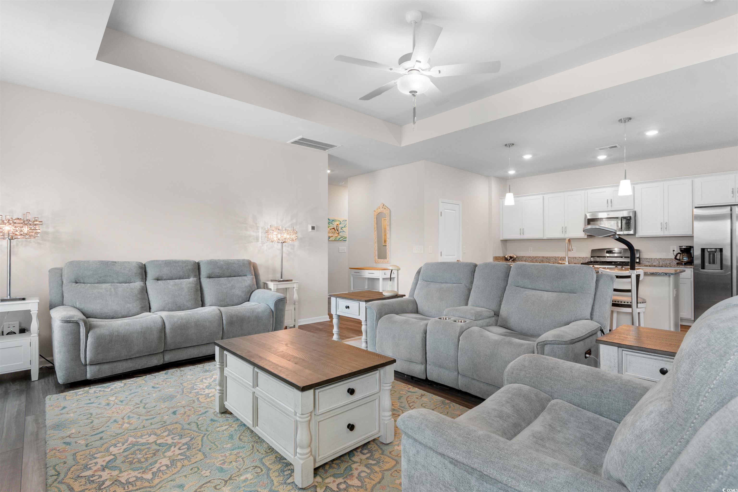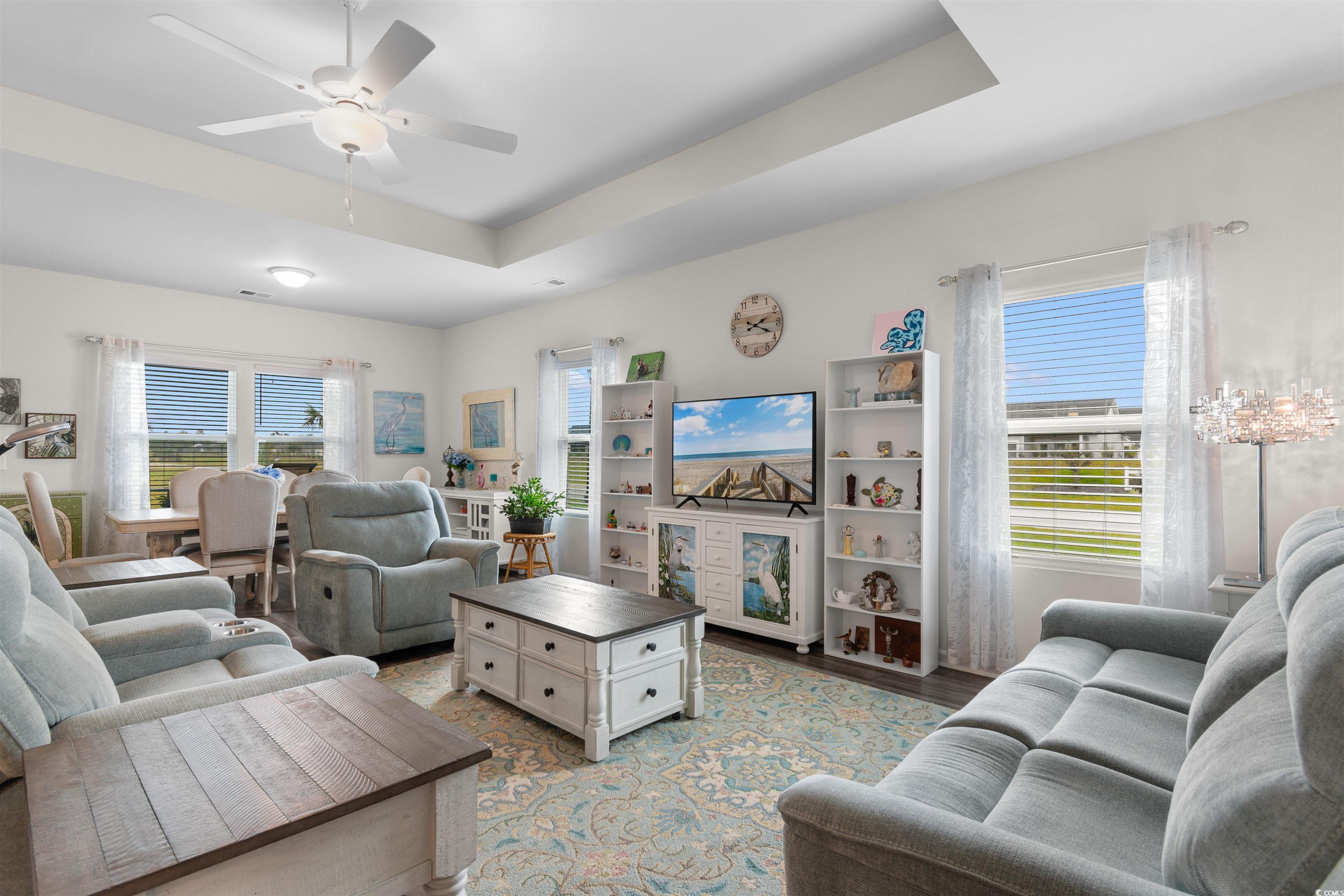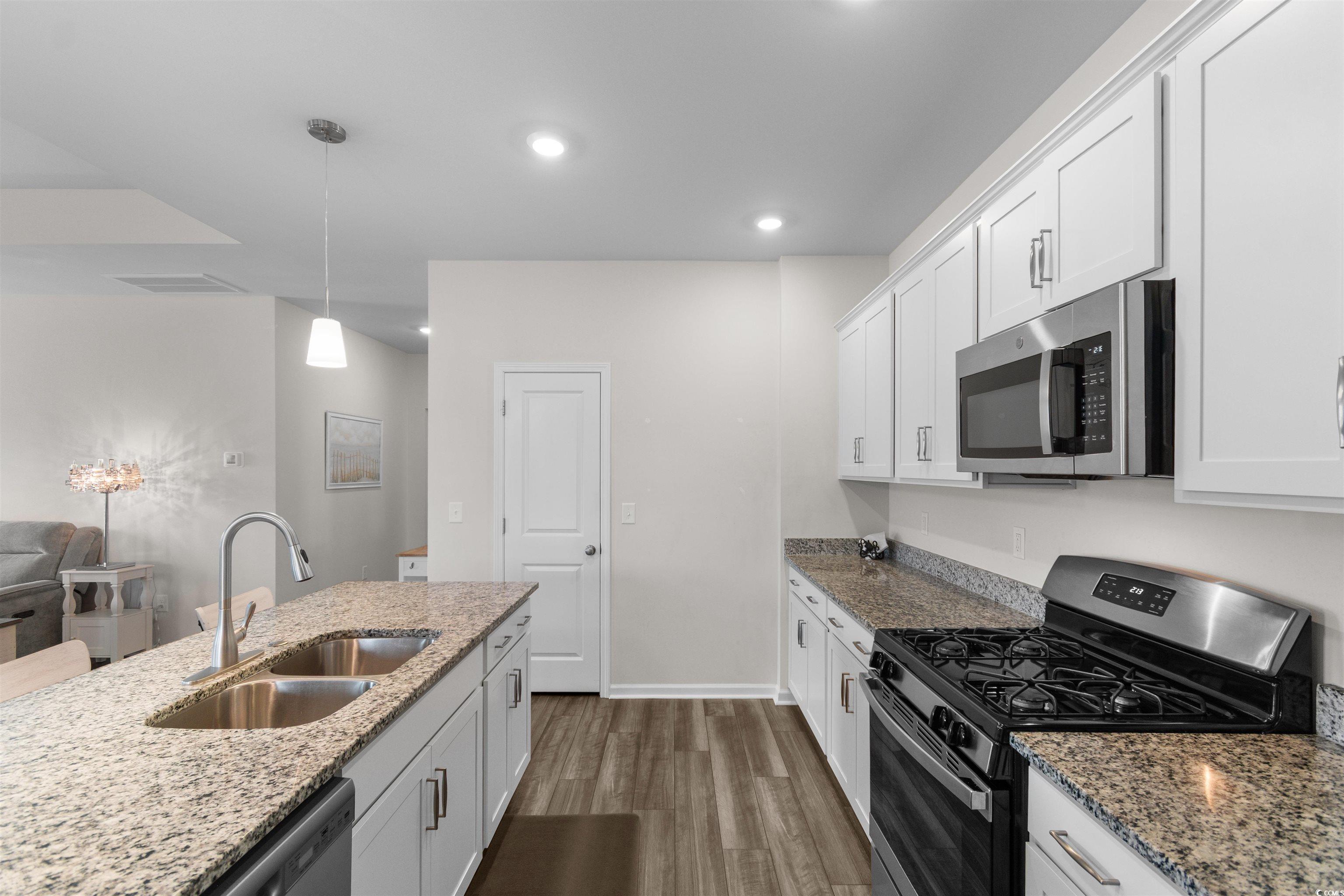 Built in 2024 and beautifully maintained, this nearly new single-level home offers 4 bedrooms, 2 bathrooms, and a 2-car garage on a desirable corner lot in Merrill Villas. With scenic pond views, a flexible layout, and thoughtful upgrades throughout, this home is move-in ready and designed for both comfort and style. Two guest bedrooms are located at the front of the home and share a full bath off the main hallway. A third guest bedroom offers added flexibility—perfect for a home office, hobby room, or den. The upgraded kitchen features white cabinetry, granite countertops, stainless steel appliances, a walk-in pantry, an oversized center island, and an upgraded faucet for both style and functionality. A whole-house WATER FILTRATION SYSTEM in place that provides clean, filtered water throughout the home—ideal for drinking, cooking, and everyday living. Tray ceilings in both the living room and the primary suite add an elegant architectural touch, while luxury vinyl plank flooring runs throughout the main living areas for a clean, cohesive look. From the moment you walk in, the open-concept design and pond-facing windows create a bright, airy atmosphere—perfect for everyday living and entertaining. Just beyond the main living area, the enclosed patio and extended covered porch offer a peaceful spot to relax and enjoy the water views year-round. The private primary suite, located at the back of the home, also captures pond views and features a spacious custom walk-in closet and a well-appointed attached bath with a quartz-topped double vanity, large tiled shower with glass enclosure, and upgraded showerhead. This home reflects true pride of ownership and includes a host of thoughtful upgrades: storm doors on both front and back entries, a tankless water heater, gutters, cabinetry over the laundry area, and an irrigation system to maintain the beautifully landscaped yard, enhanced with river rocks and added plantings. The finished garage offers additional convenience with storage racks and completed walls—perfect for extra storage, hobbies, or workspace. Located in a natural gas community with a low HOA that includes access to a resort-style pool and cabana, Merrill Villas offers a prime location just minutes from shopping, dining, championship golf, top-rated schools, Myrtle Beach International Airport—and less than five miles from the beach. Highly desirable assumable VA mortgage available for qualified buyer, ask your agent for details.