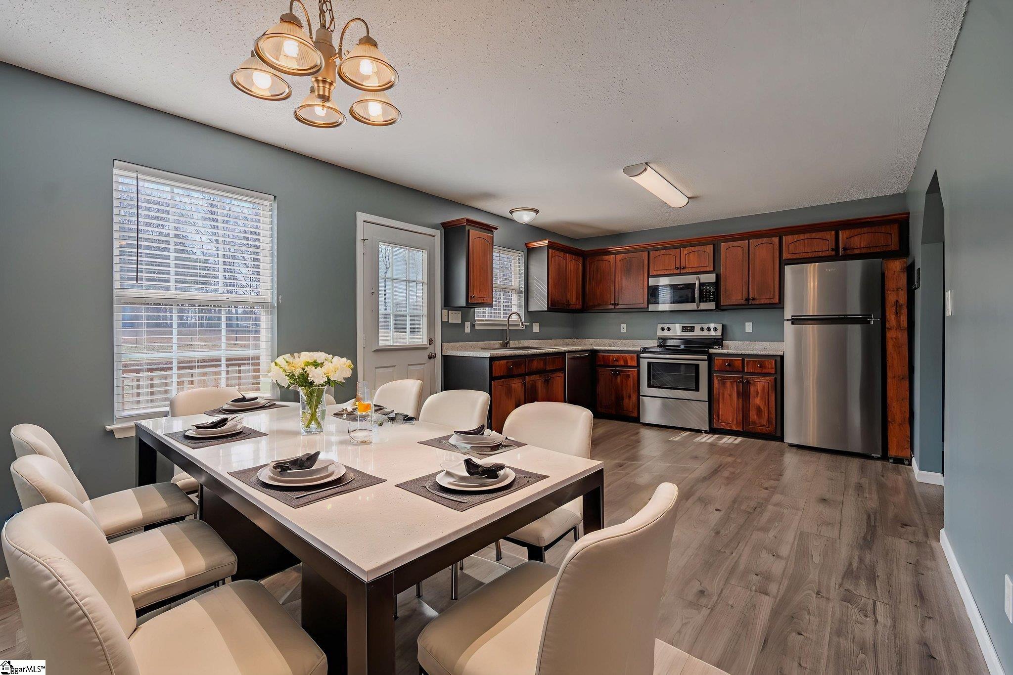 Welcome home to this beautifully maintained property featuring a large front yard with a classic white picket fence and a charming front porch perfect for relaxing evenings. Step inside to a pretty living room filled with natural light from a large front window, offering plenty of space for gathering and entertaining. Attractive vinyl flooring runs throughout the main living areas, adding both style and durability. The kitchen is well-equipped with stainless steel appliances, including a built-in microwave and dishwasher. You'll love the generous counter space and the flexibility to add an island or breakfast bar. The adjoining dining area is thoughtfully arranged to accommodate a large table with ease. The spacious primary suite is truly oversized, offering enough room for a sitting area. It features a private bath and a walk-in closet. A desirable split-bedroom floor plan places two additional bedrooms and a guest bath on the opposite side of the home for added privacy. Additional highlights include: Laundry room and mud room that can be closed off, Fresh interior paint, New vinyl flooring in the mud/laundry room, Roof replaced in 2017, and HVAC system replaced in 2021. Enjoy the large fenced backyard with additional property beyond the fence line—ideal for entertaining, gardening, or simply relaxing. Beautiful blooming flowers and mature landscaping create a warm welcome. Conveniently located just 1 mile from the lovely town of Inman, and 20 minutes to Spartanburg. 25 minutes to Greenville-Spartanburg International Airport. 30 minutes to BMW and 40 minutes to Greenville. This move-in ready home offers space,comfort, and convenience—all in a fantastic location.