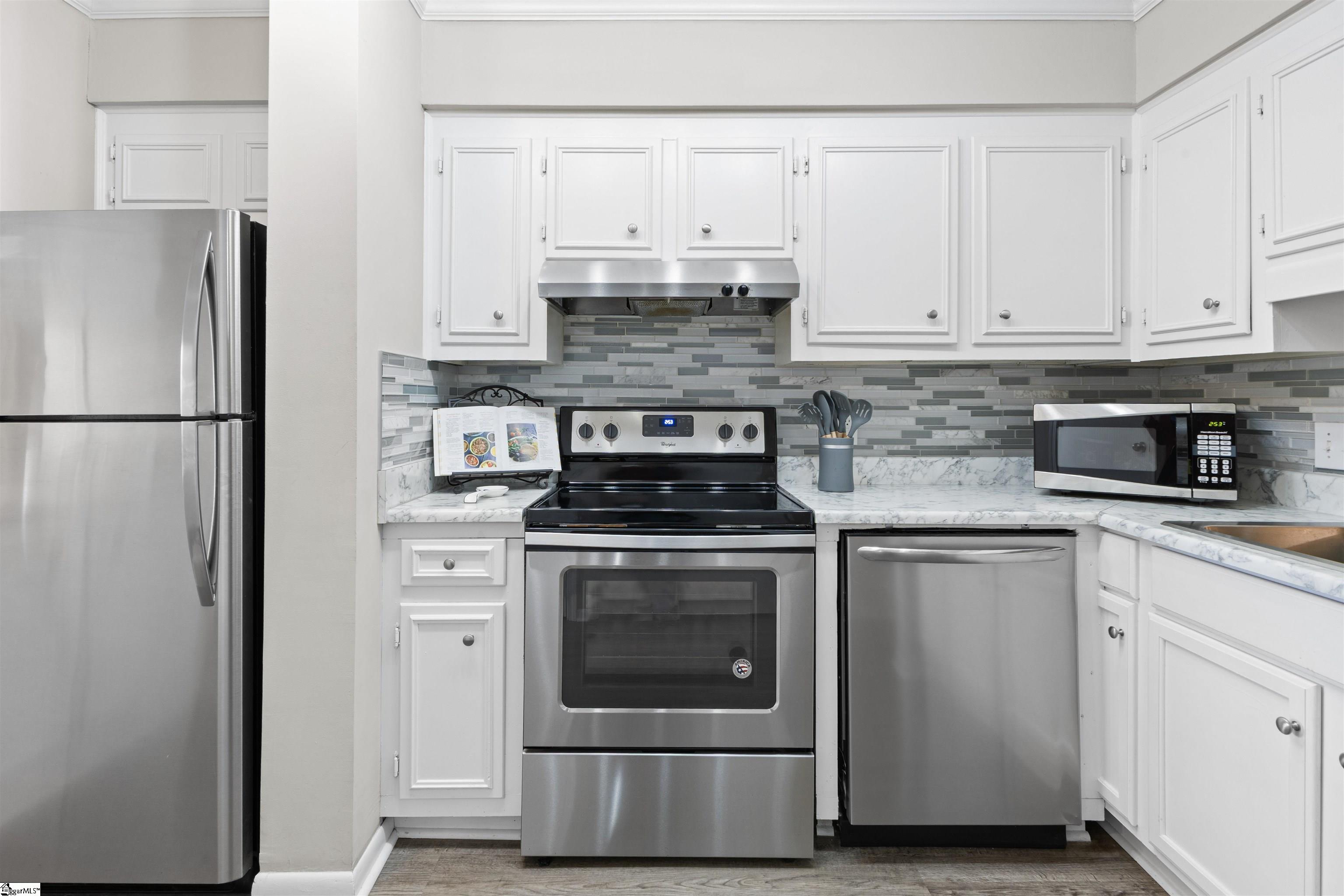 Welcome to Creek Villas, where everyday life feels a little calmer. This townhome sits on the 3rd hole of the golf course, giving you peaceful views of the green. Picture quiet mornings on the screened porch with your first cup of coffee. In the evening, step outside to the patio and enjoy the view as the sun starts to disappear behind the trees. Inside, the main level has LVP flooring that makes life simple and easy to maintain. The living room has a woodburning fireplace for cozy nights, and new sliding doors lead right to the screened porch so indoor and outdoor living flow together. The kitchen features stainless appliances and plenty of cabinet space. The stackable washer and dryer are already in place, so there is one less thing to worry about on move-in day. Upstairs, the primary bedroom is generous in size and has its own private balcony. The current owner already replaced the balcony wood deck, so all you have to do is enjoy the view. The attached bathroom makes getting ready in the morning easy and private. The second bedroom is also comfortable and has its own full hall bathroom, which makes the layout ideal for guests, roommates, or a home office setup. Living here keeps life simple. The HOA handles lawn maintenance and trash pickup. You have plenty of parking, stainless appliances, newer flooring, and outdoor spaces that overlook the golf course. Finding a home this nice for under 200,000 is a rare find. Come see it in person and imagine how easy life can be at Creek Villas.