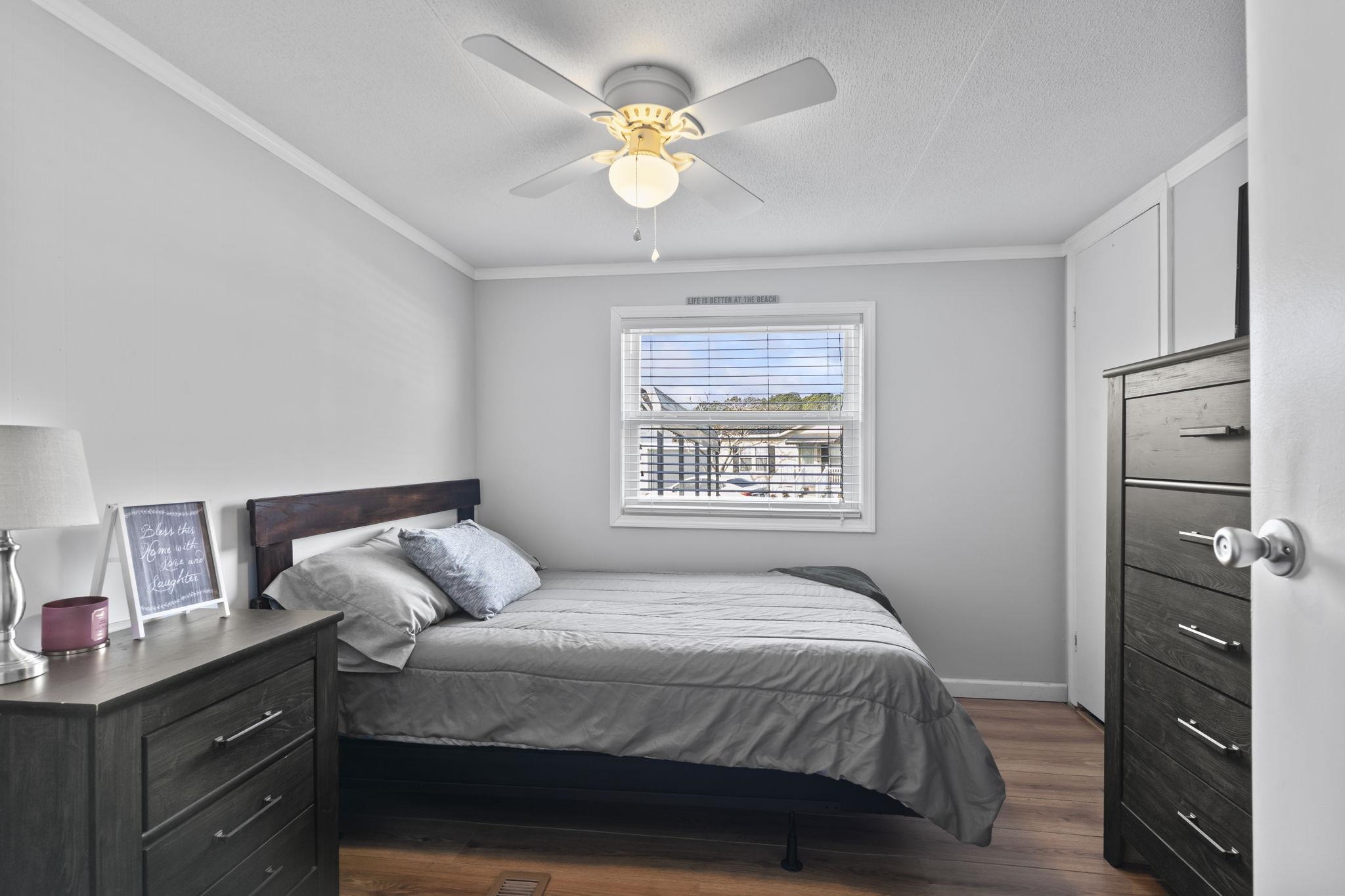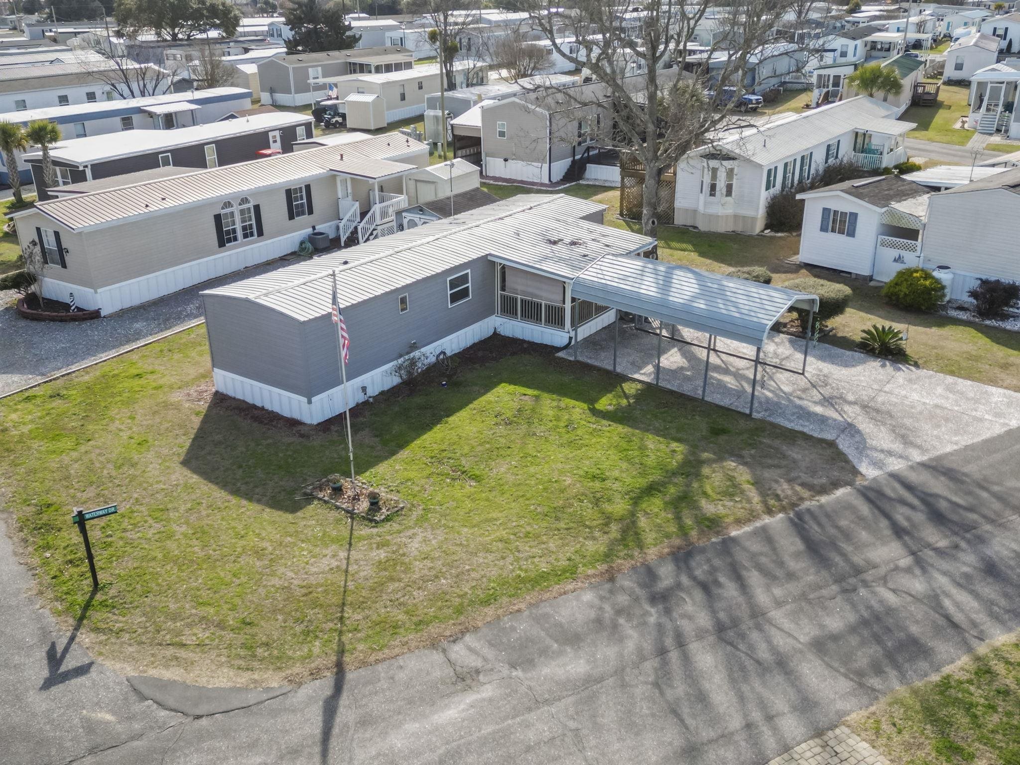 Enjoy the best of coastal living in this beautifully maintained, partially furnished home located in a desirable 55+ community, just steps from the Intracoastal Waterway and only 1.8 miles from the beach. Situated on a corner lot, this home offers both privacy and convenience in an unbeatable location. The inviting front porch is the perfect place to relax, featuring mood lighting and a TV, ideal for morning coffee or evening entertainment. Inside, the home includes LVP flooring throughout and a bright open-concept layout designed for comfortable living and easy entertaining. The kitchen includes a breakfast bar that opens seamlessly to the living area. Additional features include a detached shed for extra storage and easy access to a nearby golf cart path leading to popular local restaurants, dining, drinks, and entertainment. Residents will also enjoy a community pool currently under construction and scheduled to be completed this summer 2026. Location truly sets this home apart, just 1.3 miles from Main Street and minutes from shopping, dining, nightlife, entertainment, and the beach. The land lease covers water, sewer, trash, and landscaping, offering added convenience and low-maintenance living. This partially furnished home, combines comfort, charm, and an exceptional location, move-in ready and waiting for you to enjoy.