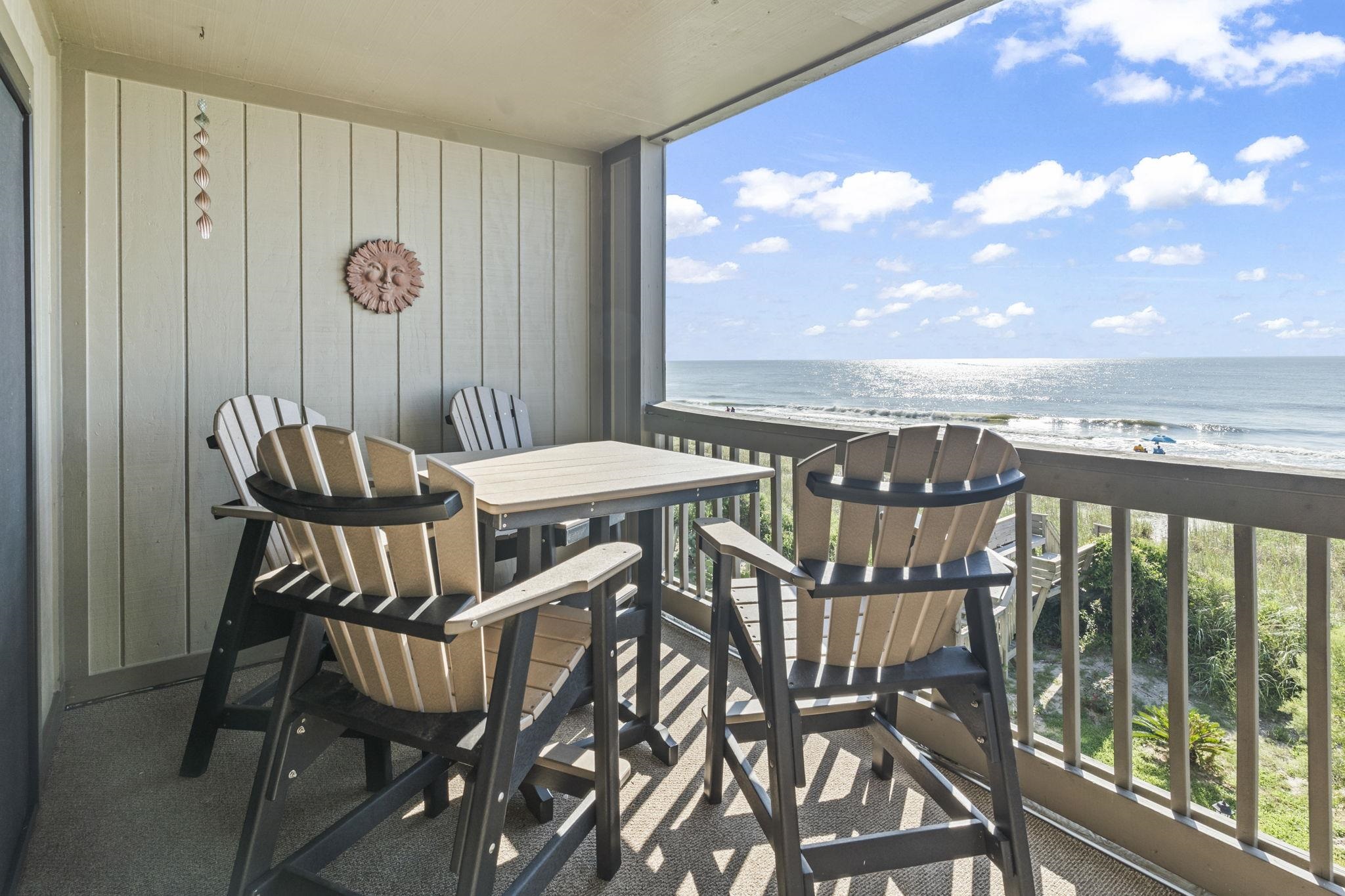 Two-bedroom, two-bathroom oceanfront condo sold fully furnished with direct balcony ocean views, a beachfront pool, secure underground parking, elevator access, and two dedicated parking spaces in the Sea Shadow community in Surfside Beach, South Carolina — half a mile north of Surfside Pier. The open-concept kitchen, dining, and living area features stainless steel appliances, bright cabinetry, a breakfast bar, and sliding glass doors to the private oceanfront balcony. An in-unit laundry area is located near the foyer. The primary suite is positioned on the oceanfront side of the unit with sliding glass door balcony access and an en-suite bathroom with a step-in shower and vanity. A second bedroom on the opposite end of the unit accesses a full hall bathroom, providing guest privacy. Sea Shadow amenities include a beachfront pool, direct beach access, elevator access, secure underground parking, picnic and BBQ areas, communal storage on each floor, individual beach gear cubbies, and two parking spaces per unit with an adjacent overflow lot. Located half a mile north of Surfside Pier in Surfside Beach, with proximity to Garden City Beach, the Murrells Inlet MarshWalk, Huntington Beach State Park, and dining and shopping along Business 17 and US-17. Turnkey and move-in ready for immediate occupancy as a primary residence, vacation home, or short-term rental investment. Oceanfront, fully furnished, turnkey, 2-bedroom, private balcony, beachfront pool, direct beach access, elevator, secure underground parking, two parking spaces, in-unit laundry, breakfast bar, Sea Shadow, Surfside Beach, SC 29575. Measurements approximate; buyer responsible for verification.